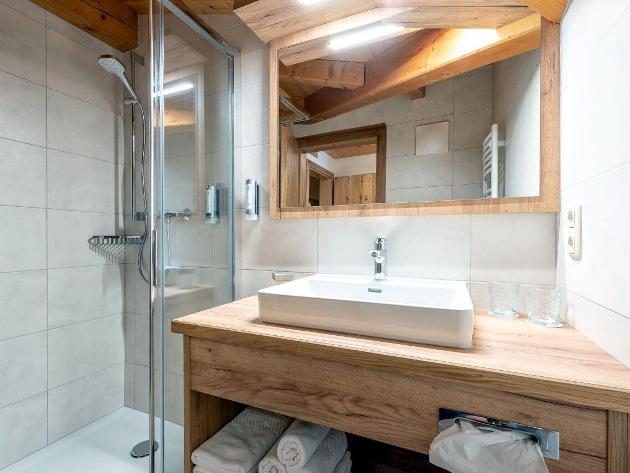 Badezimmer mit Dusche | separates WC | Handtücher und Bettwäsche | Wellnesstasche mit flauschigen Bademänteln