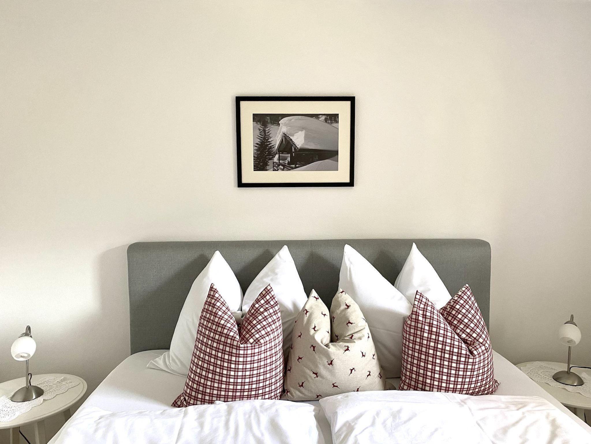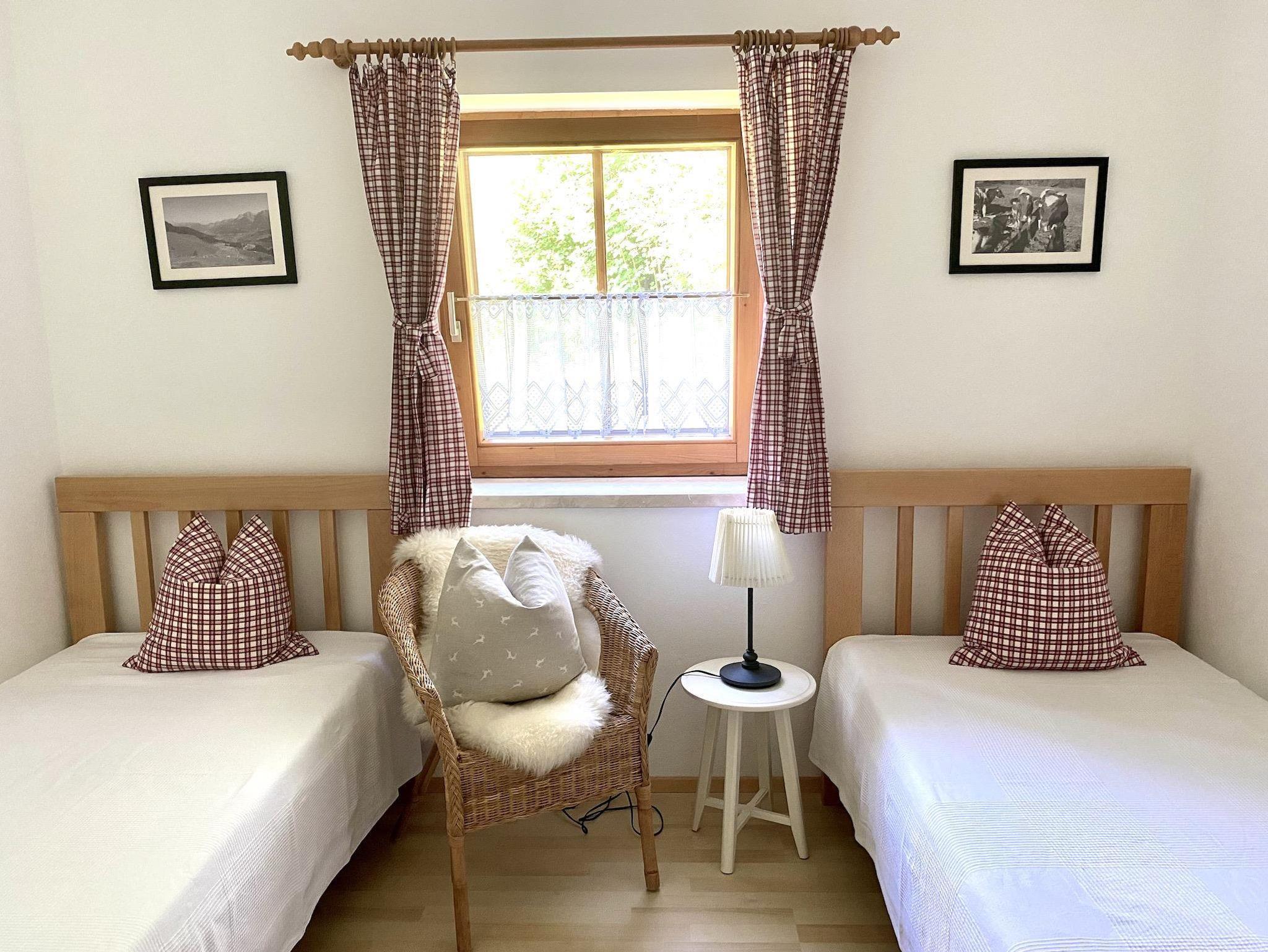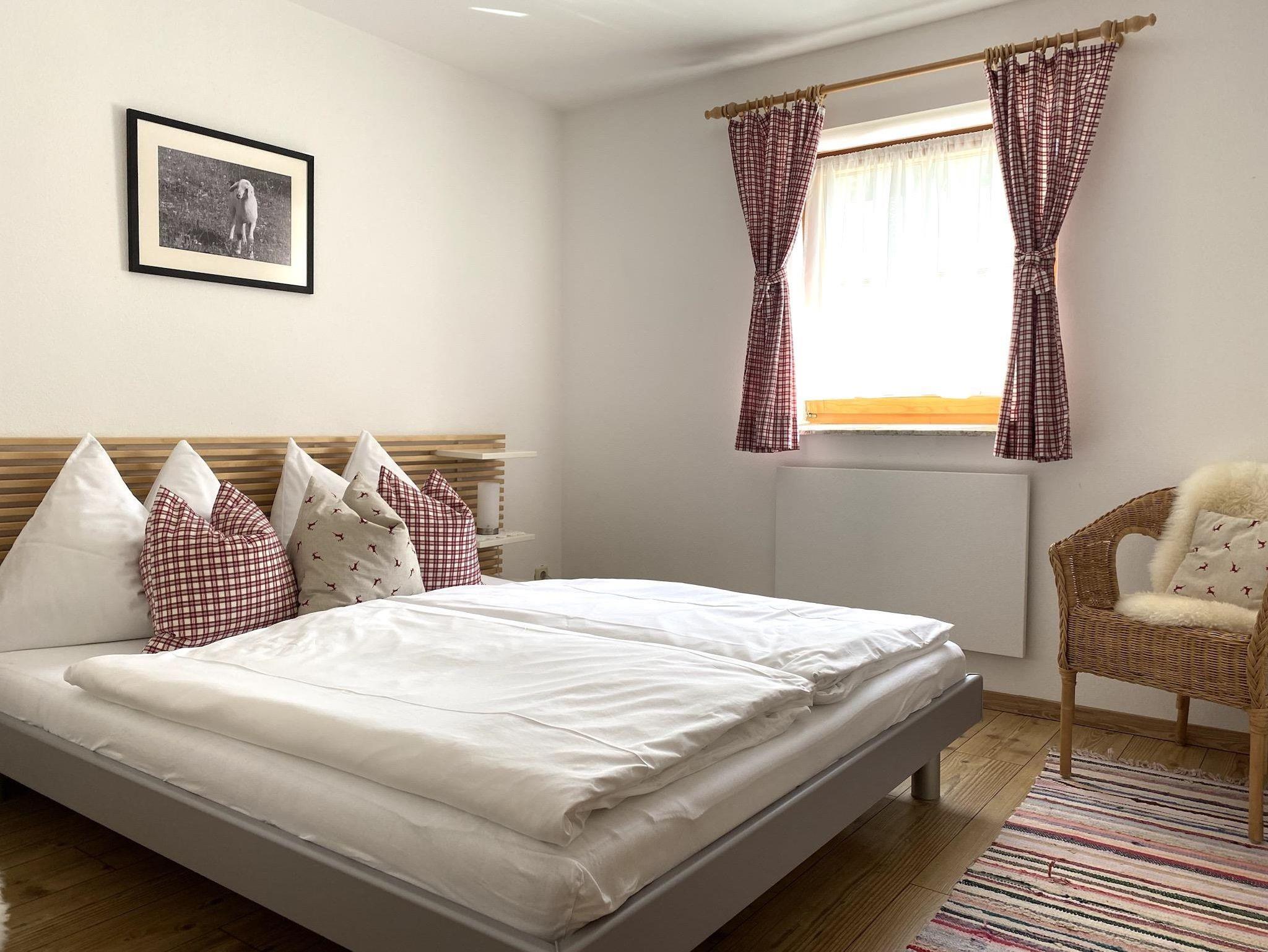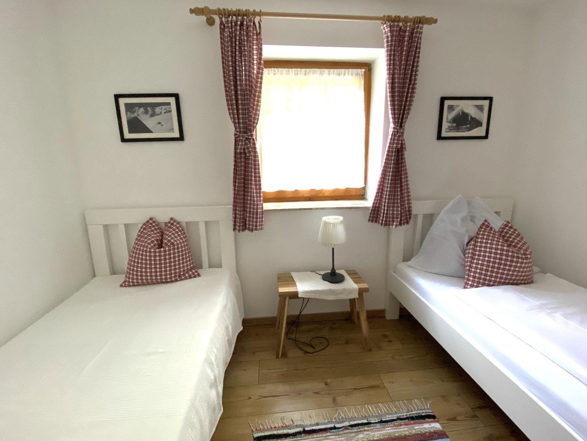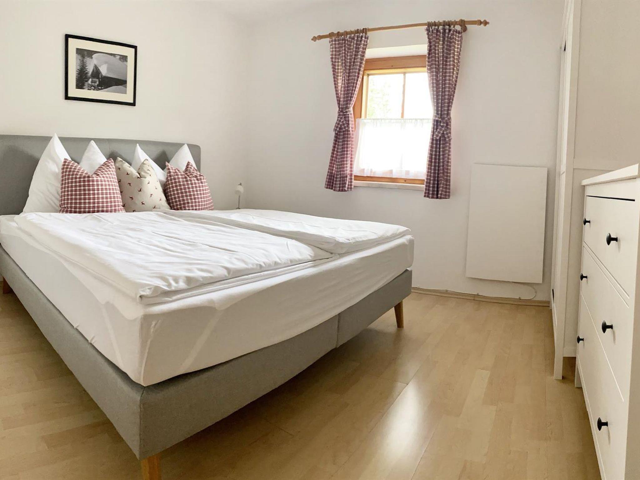 Zwei Schlafzimmer: Hauptschlafzimmer südseitig mit super komfortablen Boxspring Doppelbett, zweites Schlafzimmer mit Blick auf die Leoganger Steinberge und zwei Einzelbetten aus Vollholz mit Bio-Matratzen. Bad mit Dusche, getrenntes WC, geräumiger Vorraum, kostenloses Wifi.