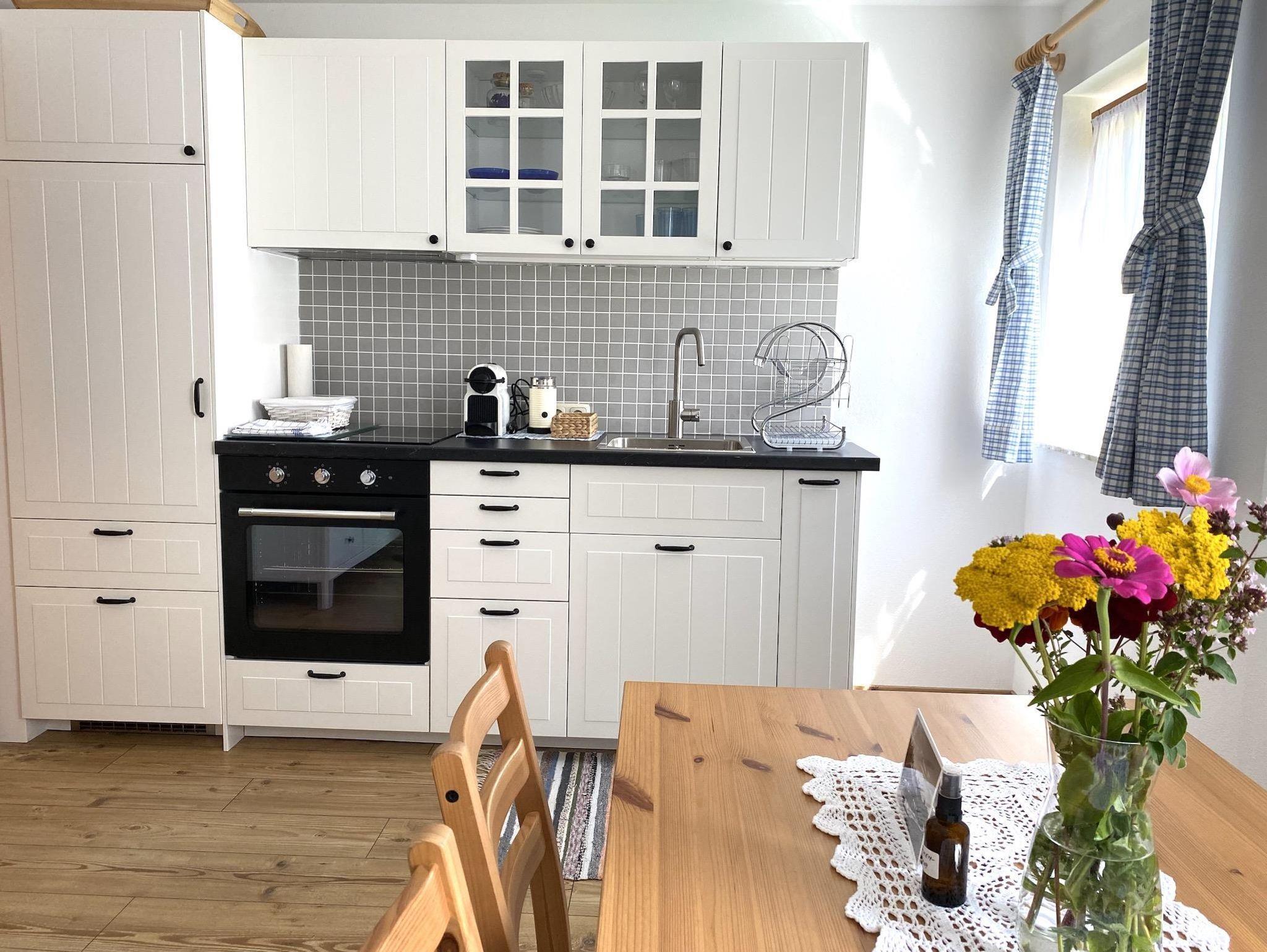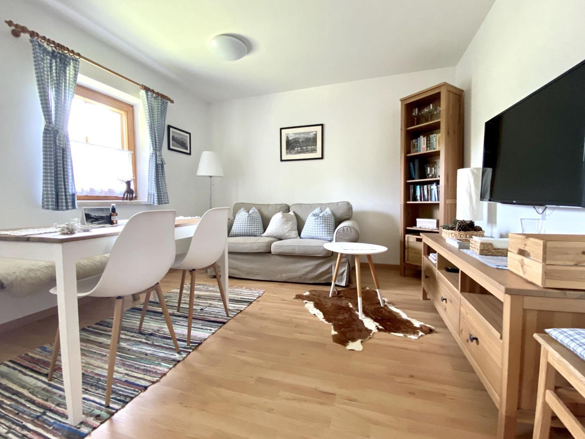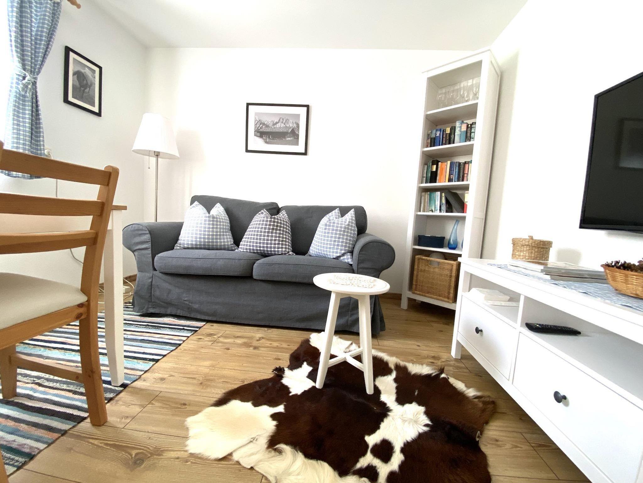 Komplett renoviert begrüßt Sie Resi mit einem gemütlicher Wohn-Essraum mit Küchenzeile, Essbereich und Couch sowie Smart-TV.