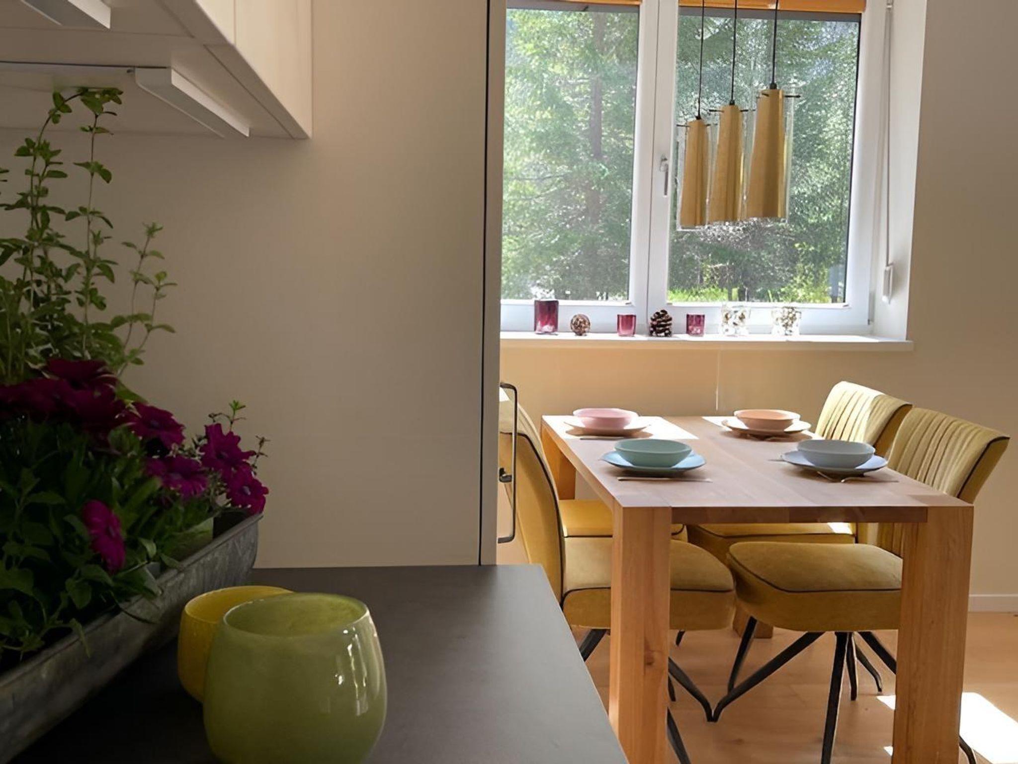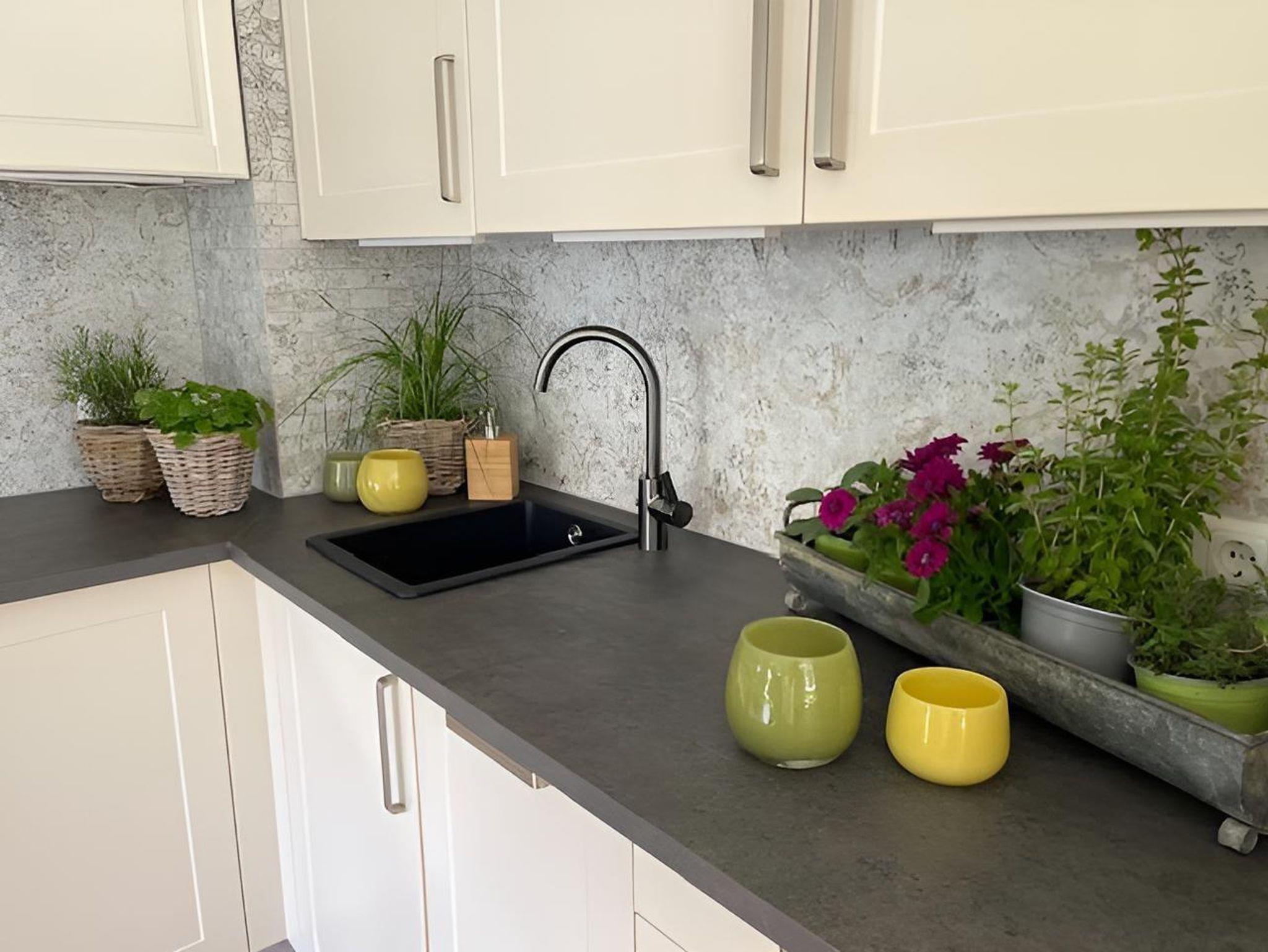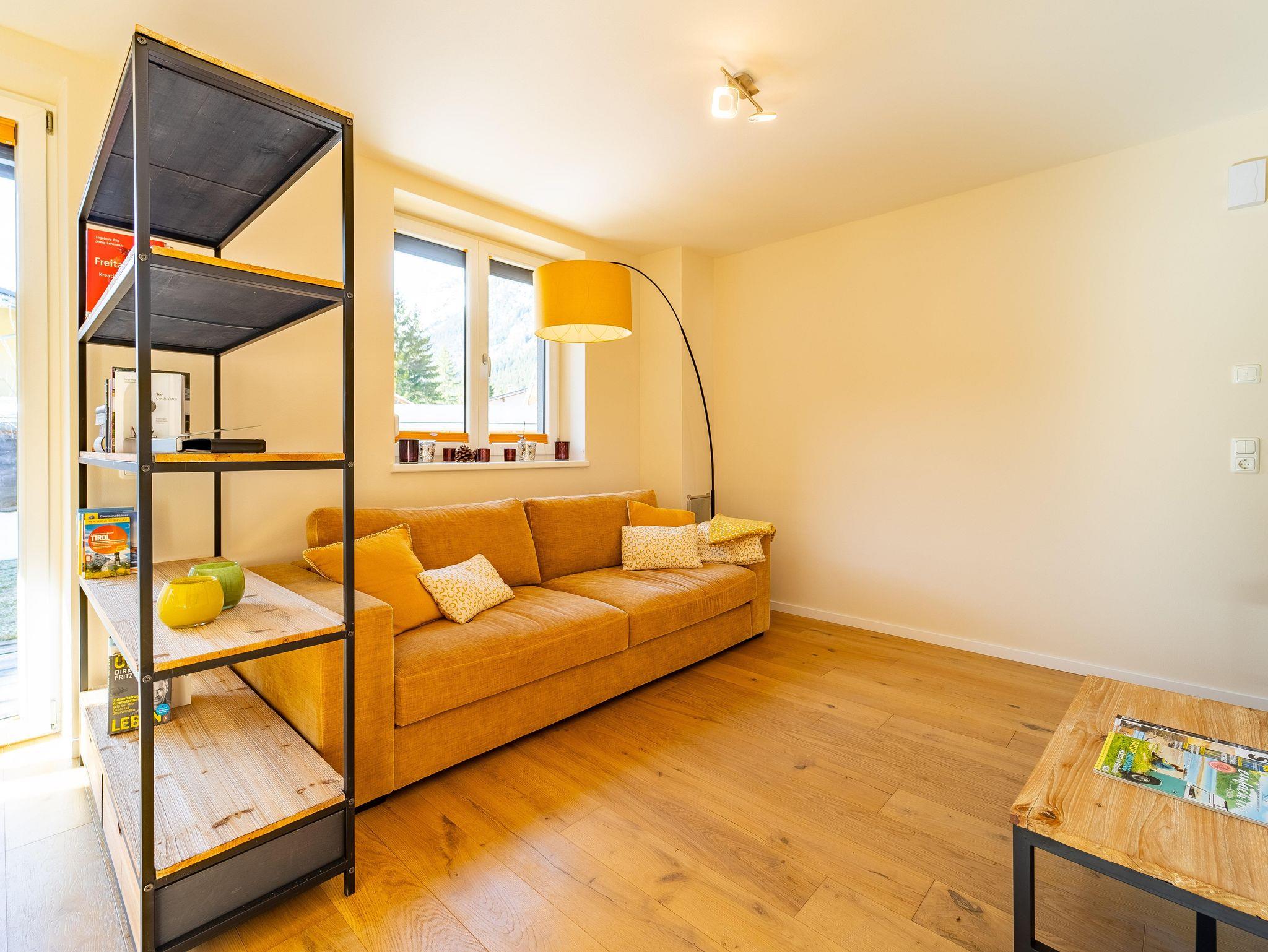 Wohnzimmer mit gemütlichem Sofa und TV, einer grossen voll ausgestattete Küche und Esszimmer mit Zugang zum Garten.