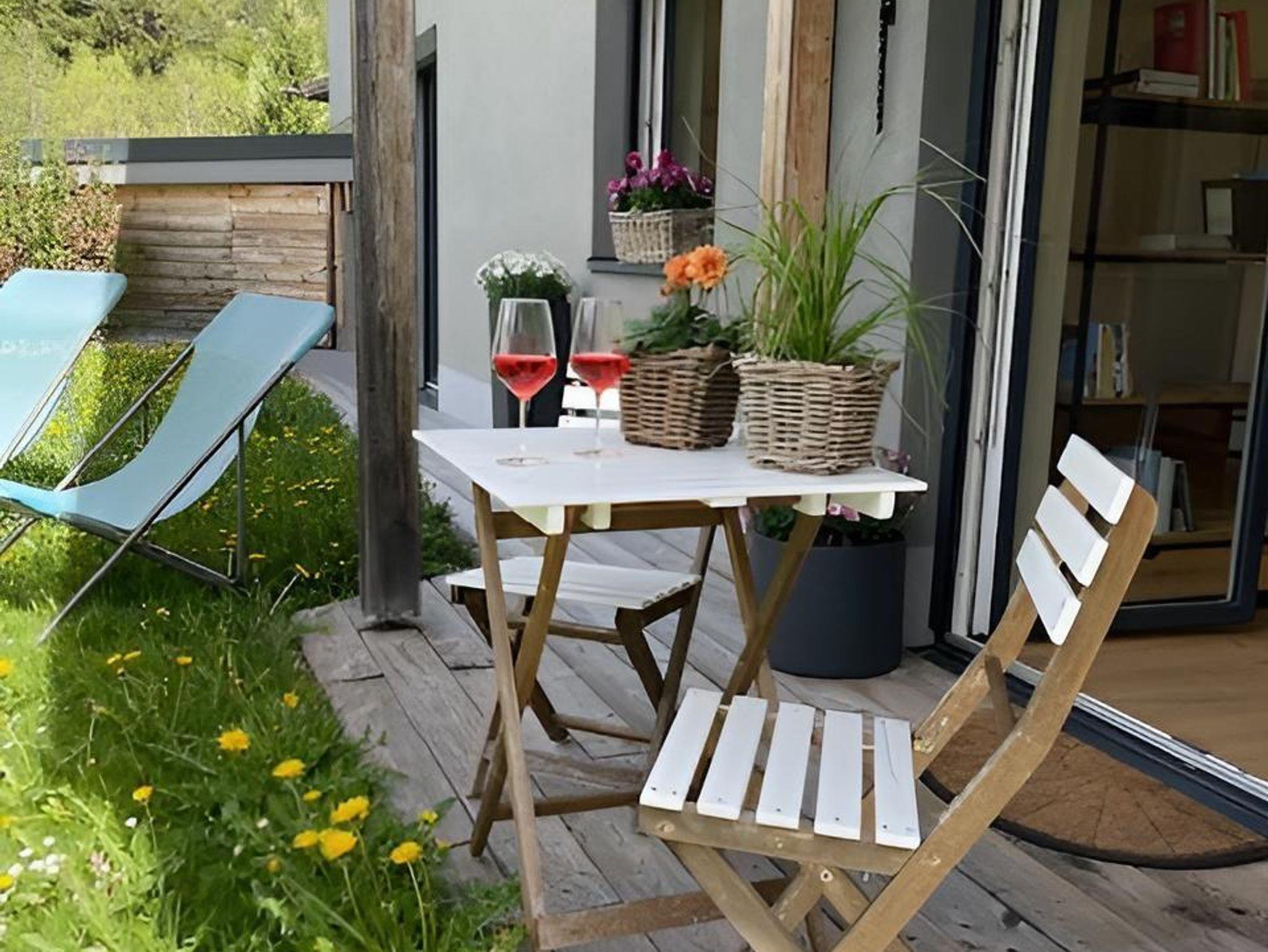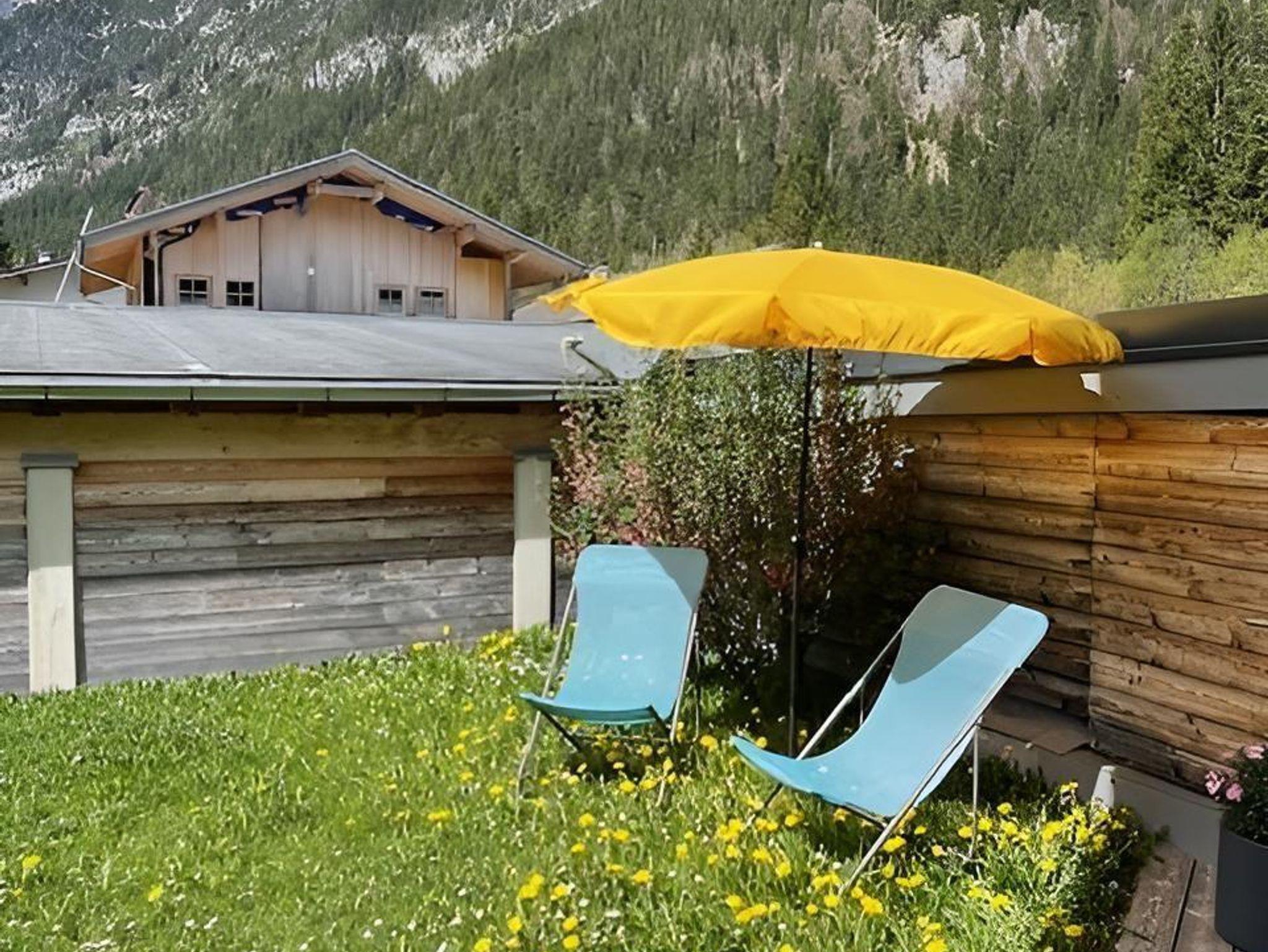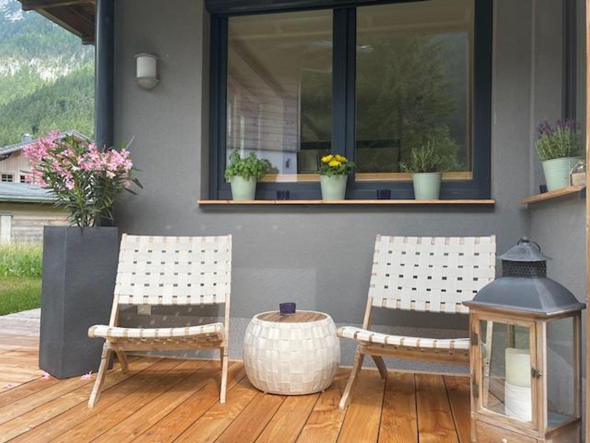 Der Garten bietet einen traumhaften Blick in die Berge des Wettersteingebirges. Schattenspendende Bäume, einen wettergeschützten Sitzplatz sowie Tisch und Stühle, Liegestühle und Sonnenschirm laden für gemütliche Stunden ein.