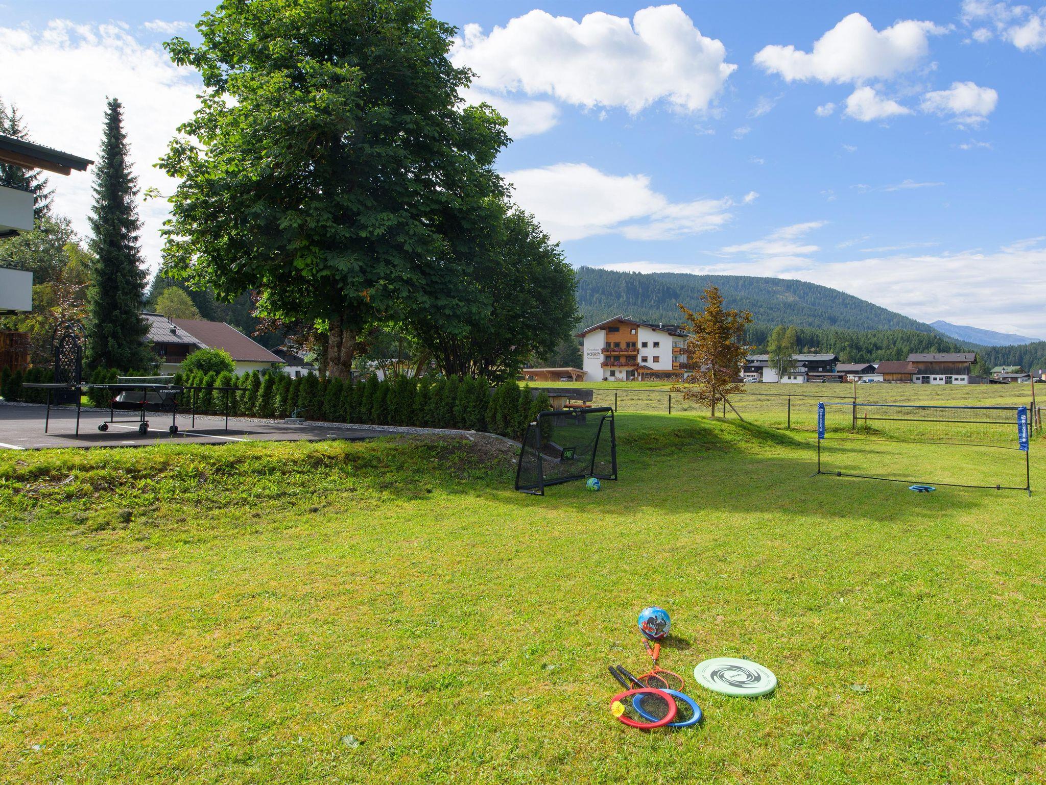 Tischtennistisch, Volleyball- und Badmintonnetz, Fußballtor, Bälle und Schläger sowie ein Kohlegrill und ein Gasgrill stehen im Garten bereit.
