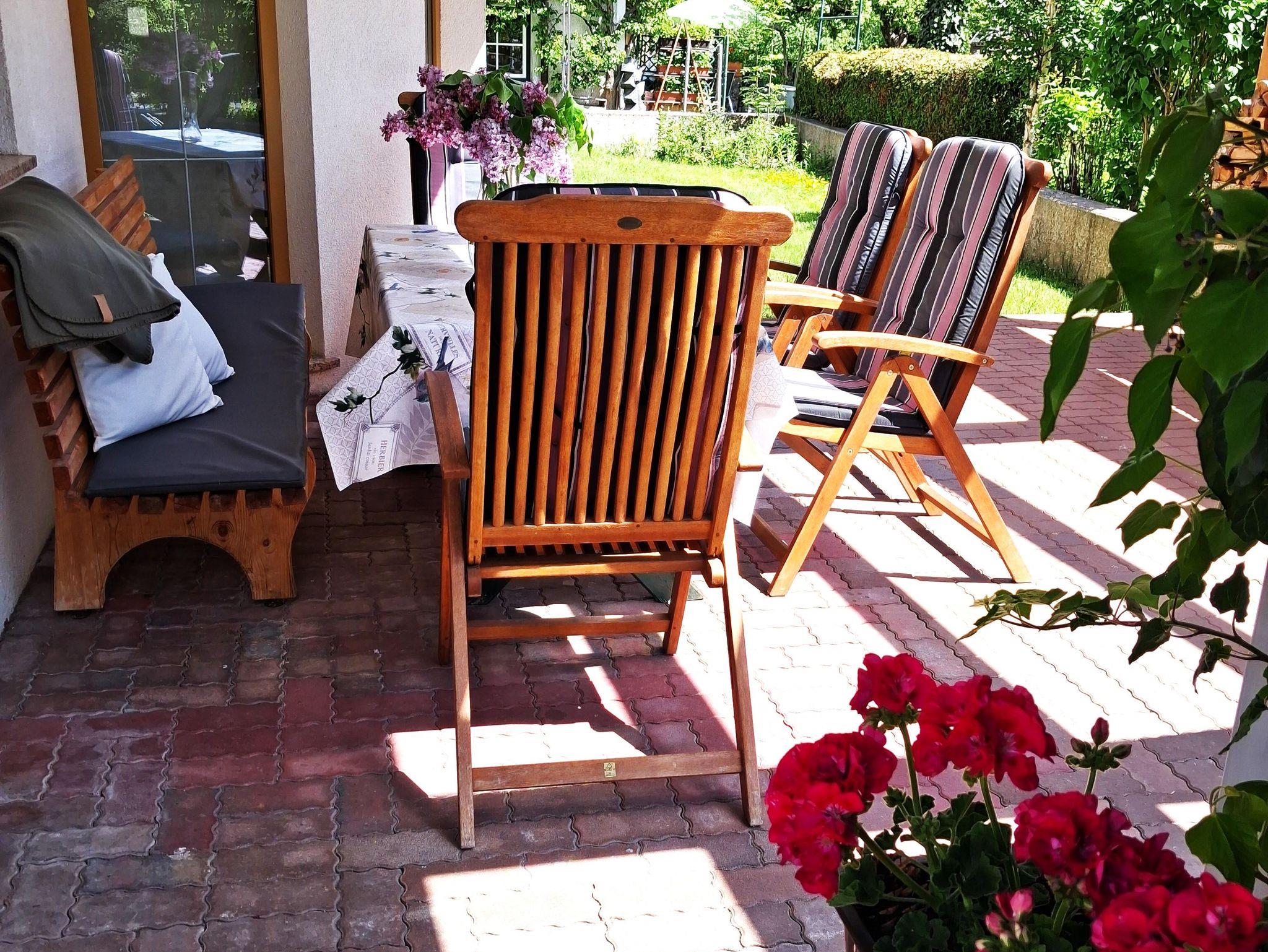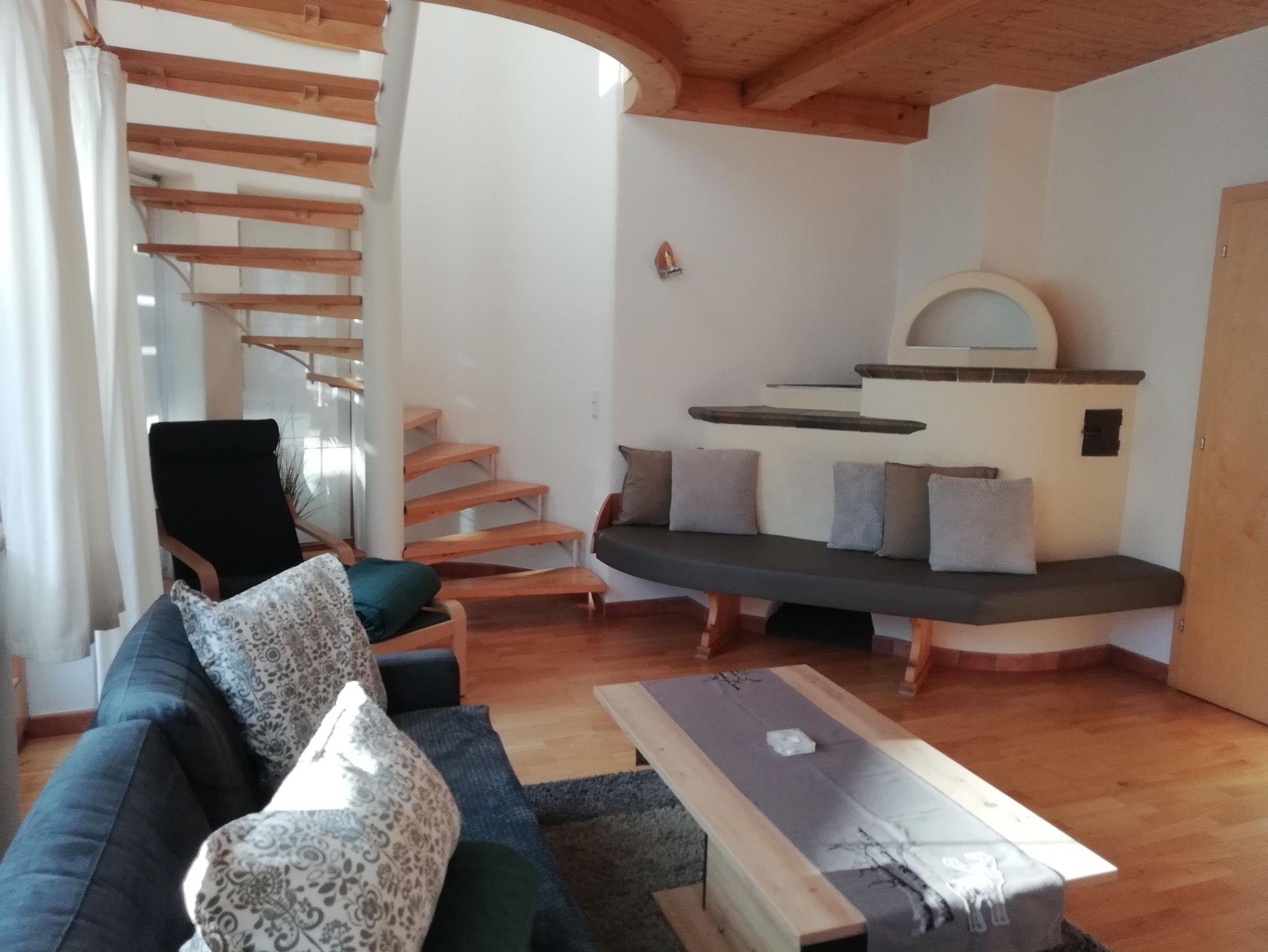 Wohnzimmer mit Kachelofen,TV, Internet, ein großes Bad mit Dusche und Badewanne, ein separates Gäste-WC, sonnige Terrasse und Garten mit Blick auf die umliegenden Berge, Hohe Munde und Gehrenspitze.