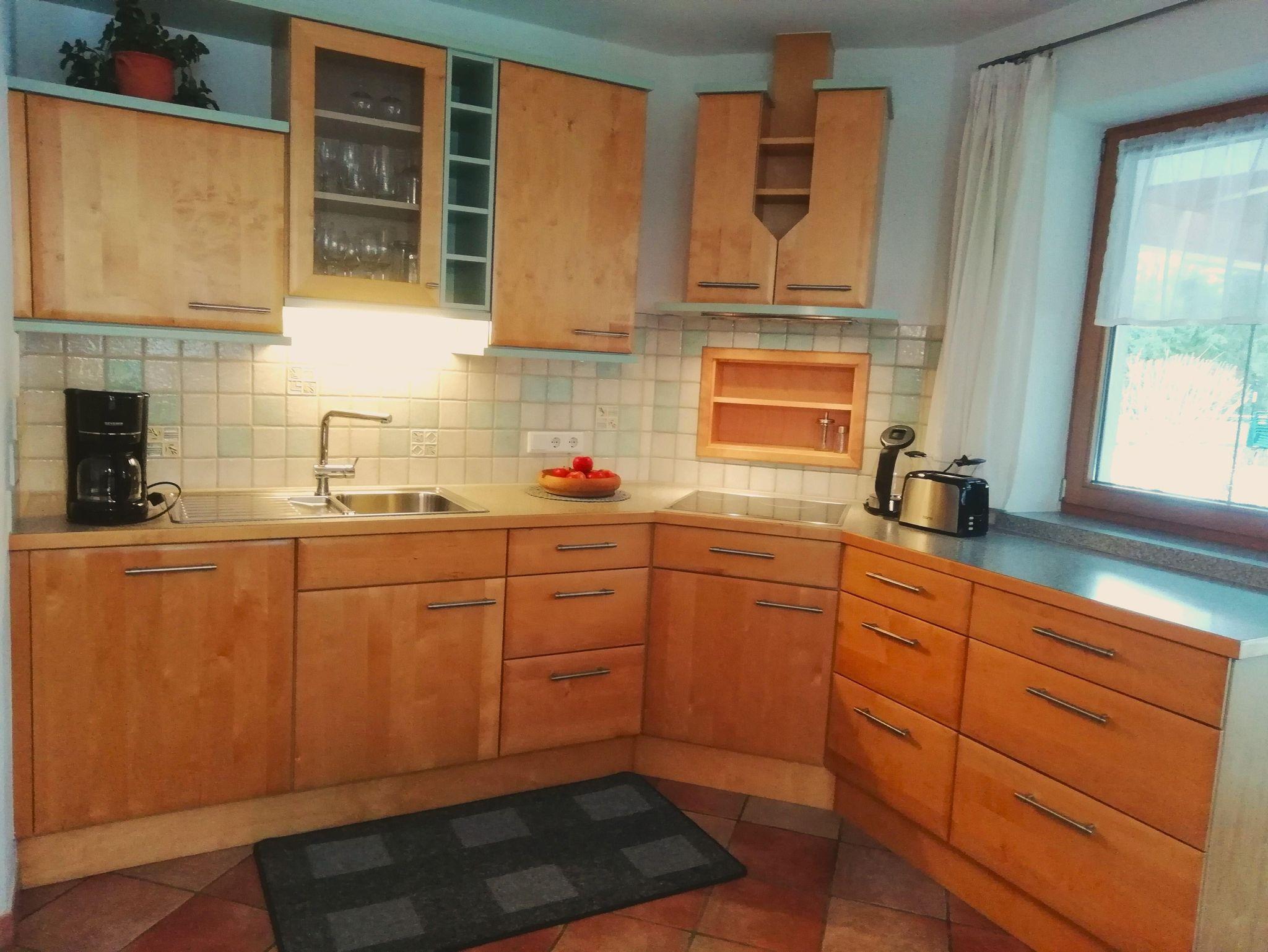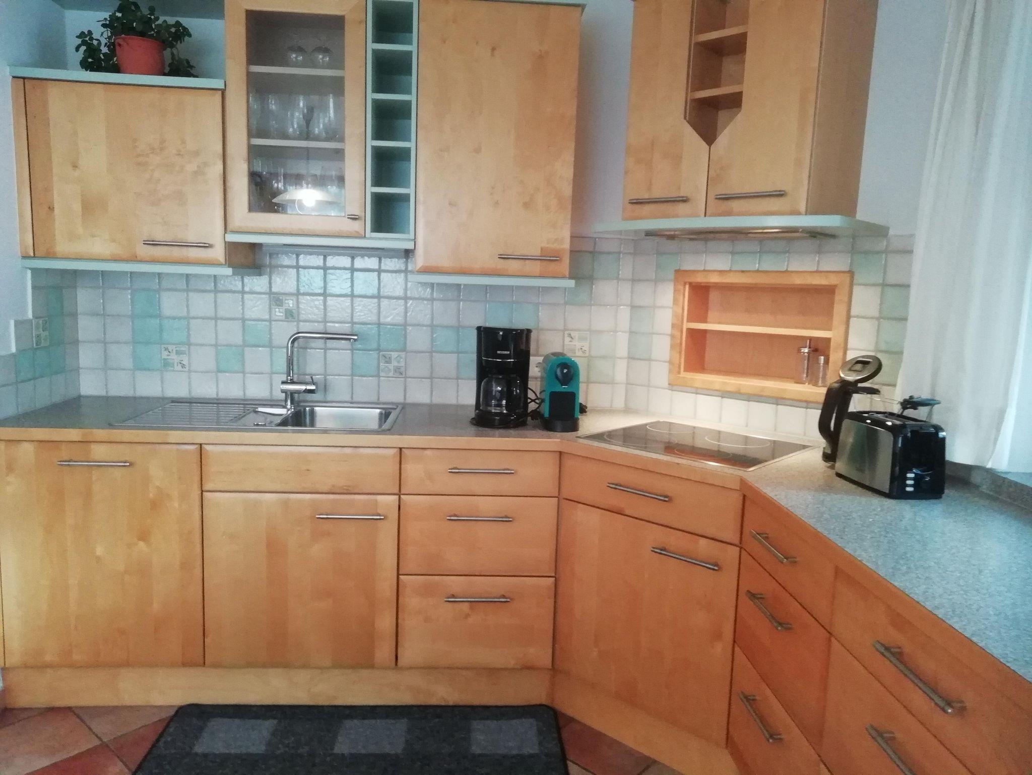 Zur weiteren Ausstattung gehört ein geräumige Wohnküche, mit einem E-Herd/Backofen, Microwelle, Kühl-und Gefrierschrank, Spülmaschine, Filter und Tapskaffeemaschine, Wasserkocher, Toaster, sowie eine elektrische Brotschneidemaschine,