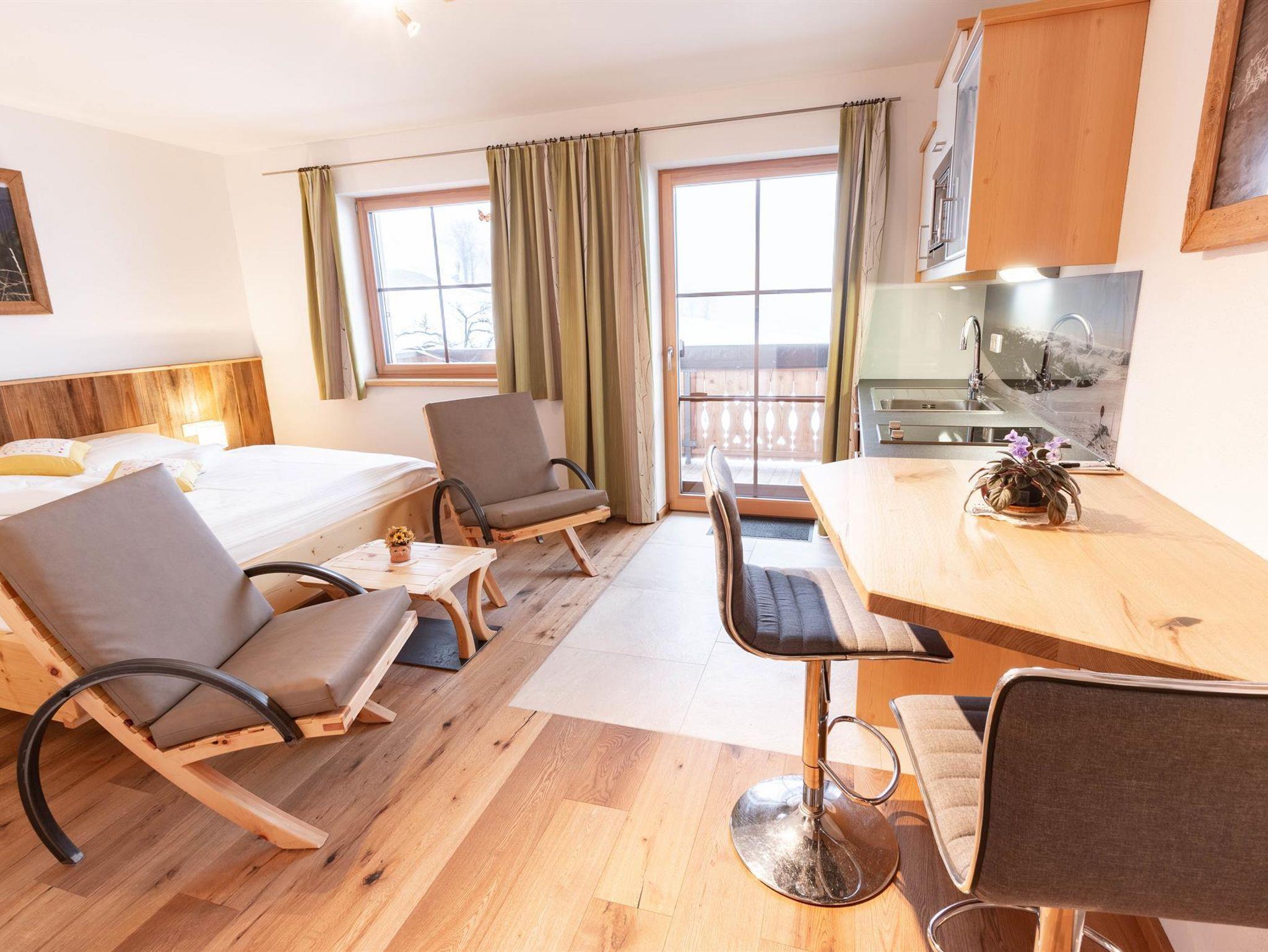 Wir bieten drei Ferienwohnungen mit unterschiedlichen Größen und Ausstattungen, zu allen Wohnungen ist außerdem auch unser Zirbenzimmer optional zubuchbar. Auch Gruppen finden bei uns gemütlich Platz: In unserer großen Gemeinschaftsstube stehen zahlreiche Karten- und Brettspiele sowie ein großer Sat-TV für gemeinsame Abende auch außerhalb der Ferienwohnungen zur Verfügung.