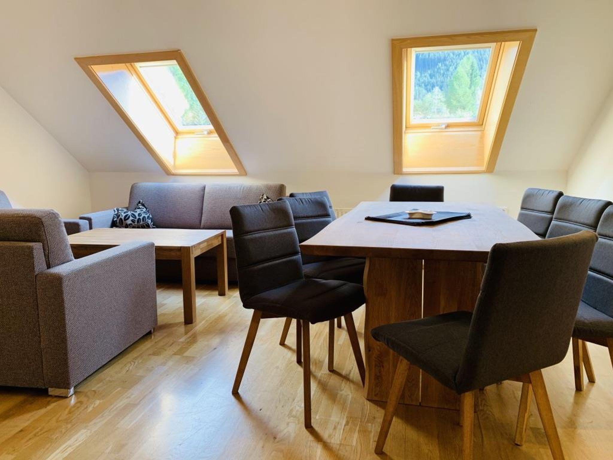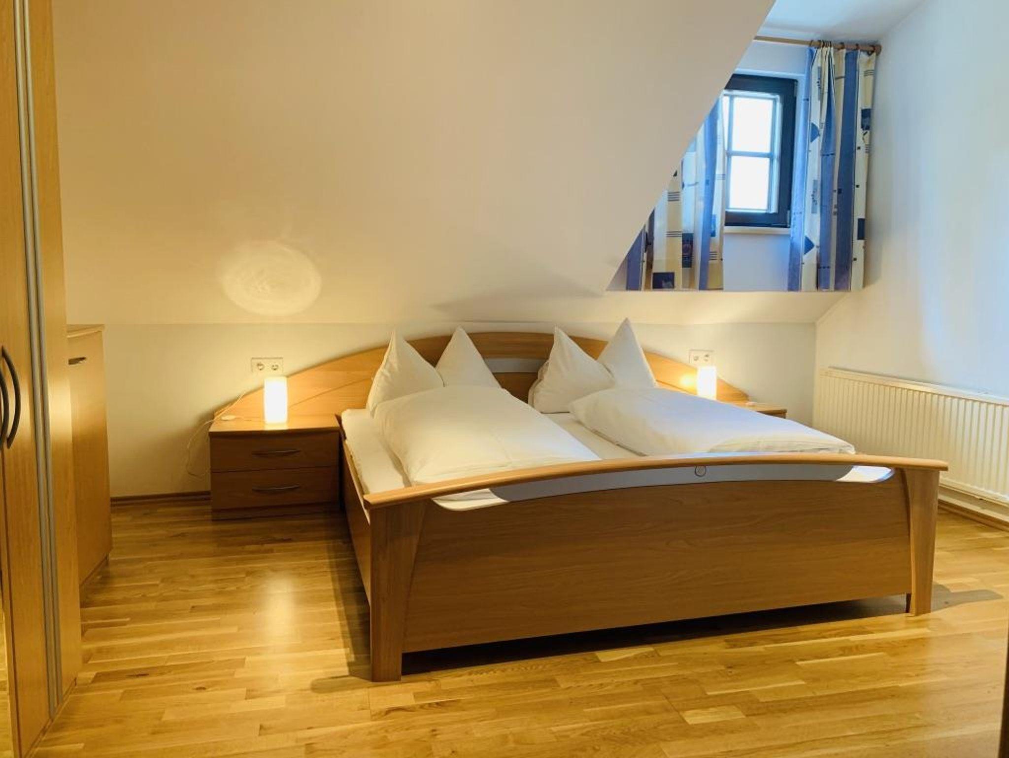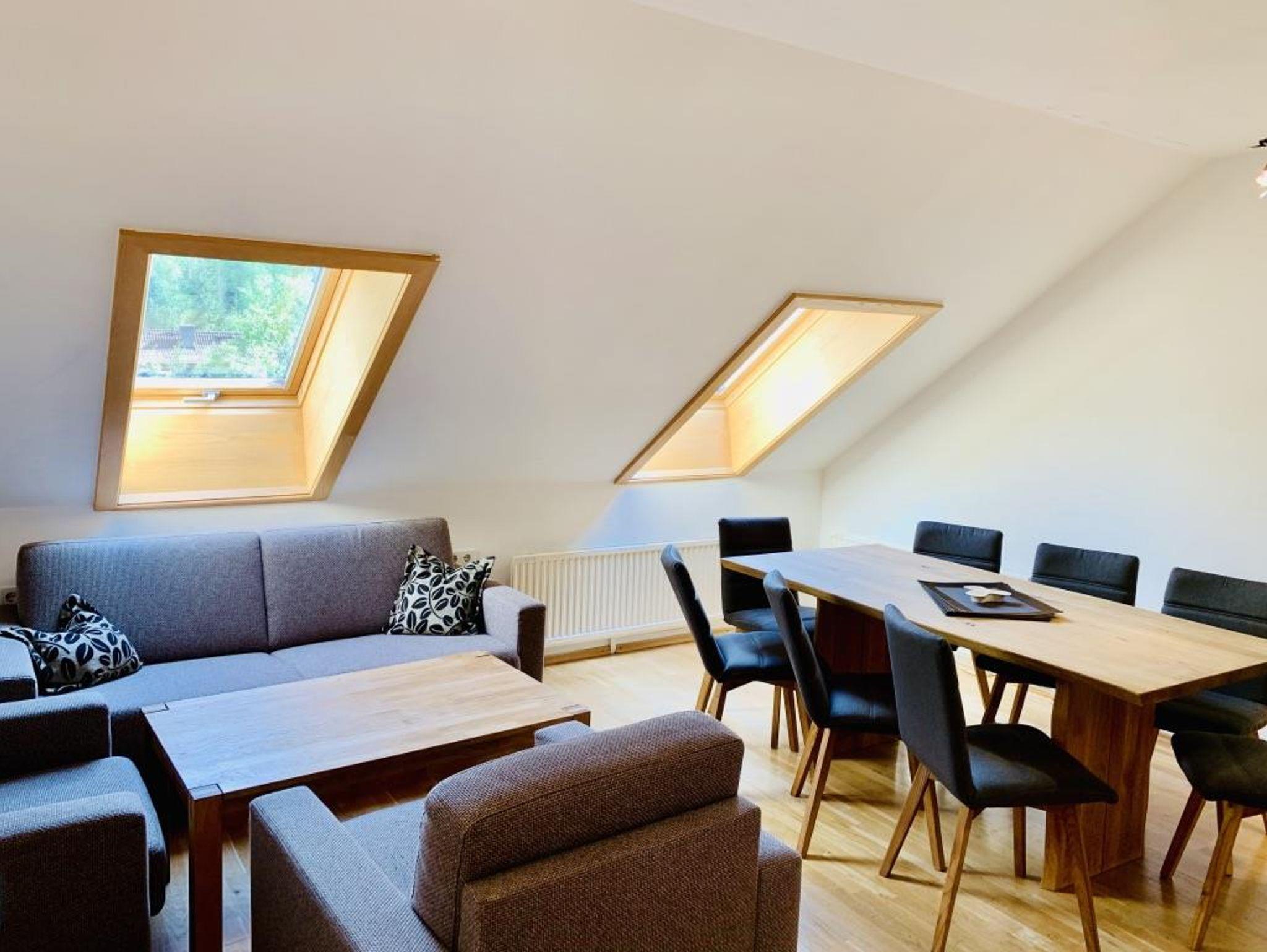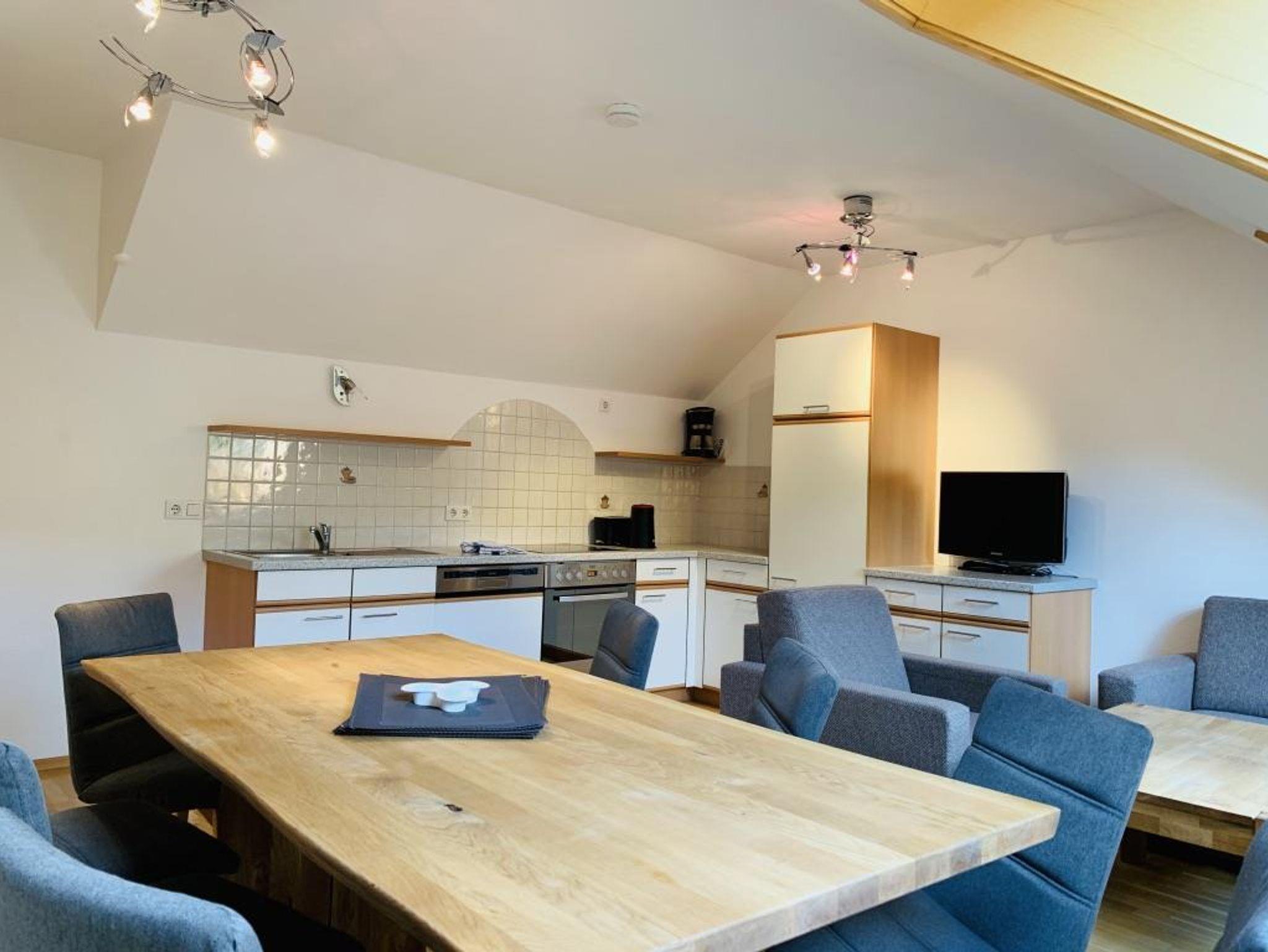 Grosszügige Ferienwohnung auf 2 Etagen, komplett ausgestattete Wohnküche mit grossem Esstisch sowie einer Doppelausziehcouch (welche als gemütliches Doppelbett genutzt werden kann) und Flat-TV, 3 Schlafzimmer für je 2 Personen, Vorraum.