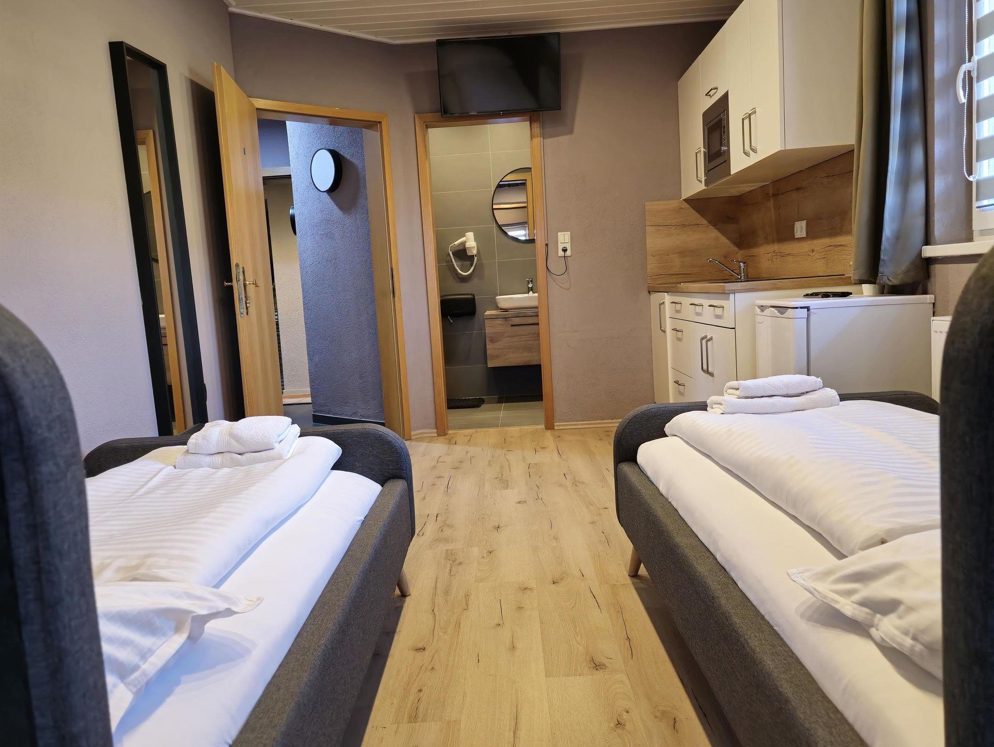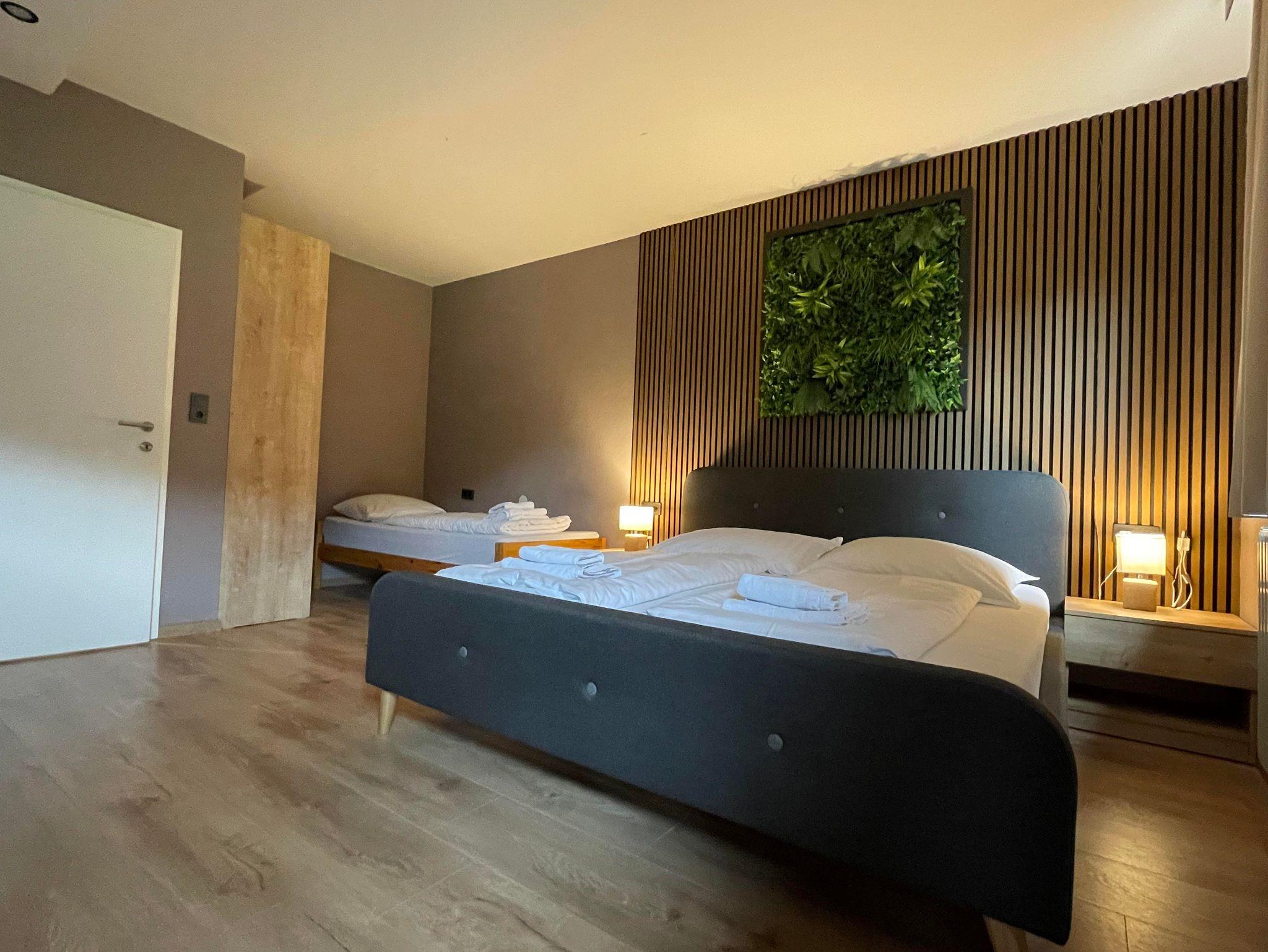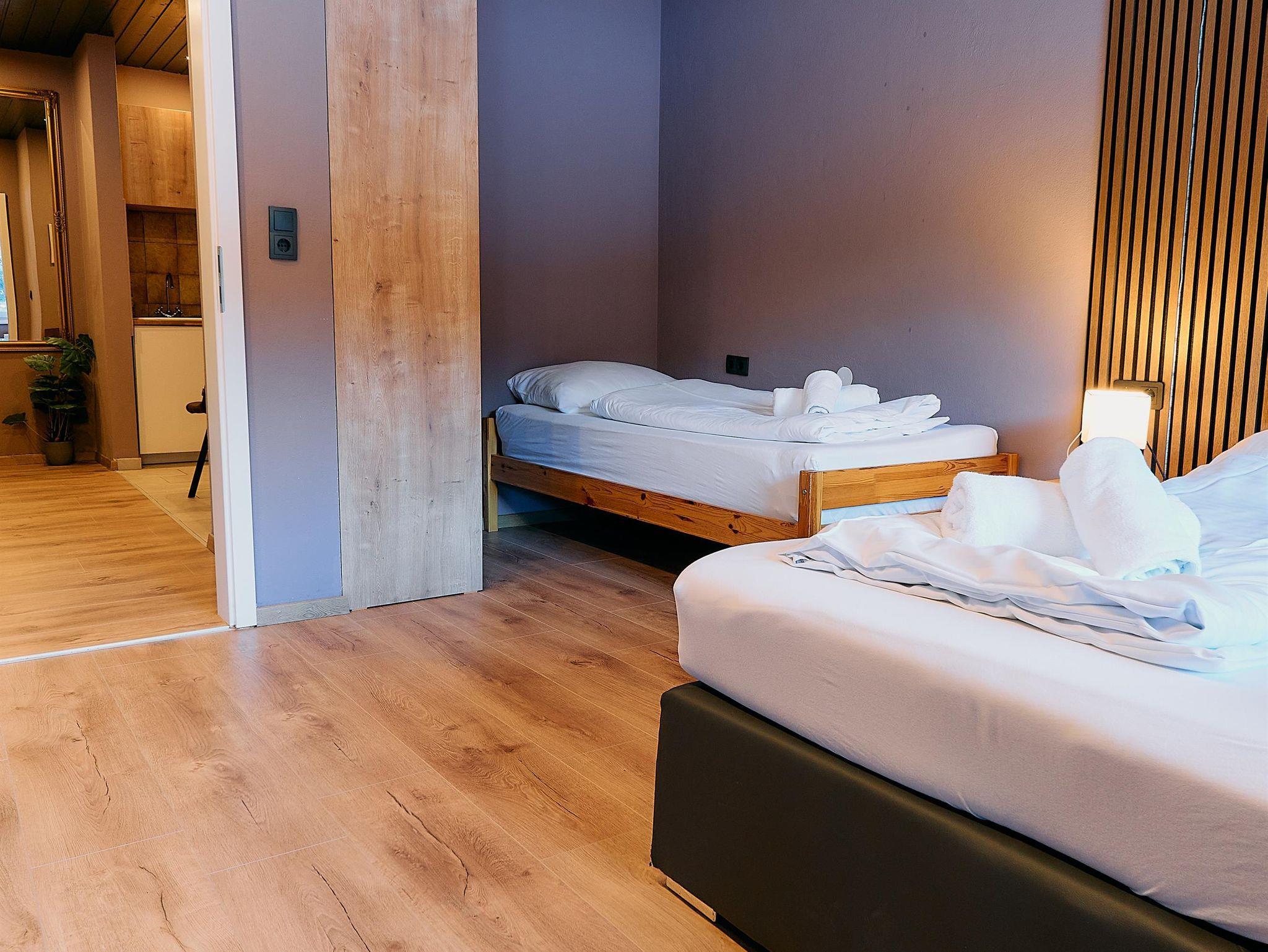 Dich erwartet ein Apartment mit einem Schlafzimmer, Küche und Badezimmer sowie einem Balkon. Es gibt ein Doppelbett und drei Einzelbetten.