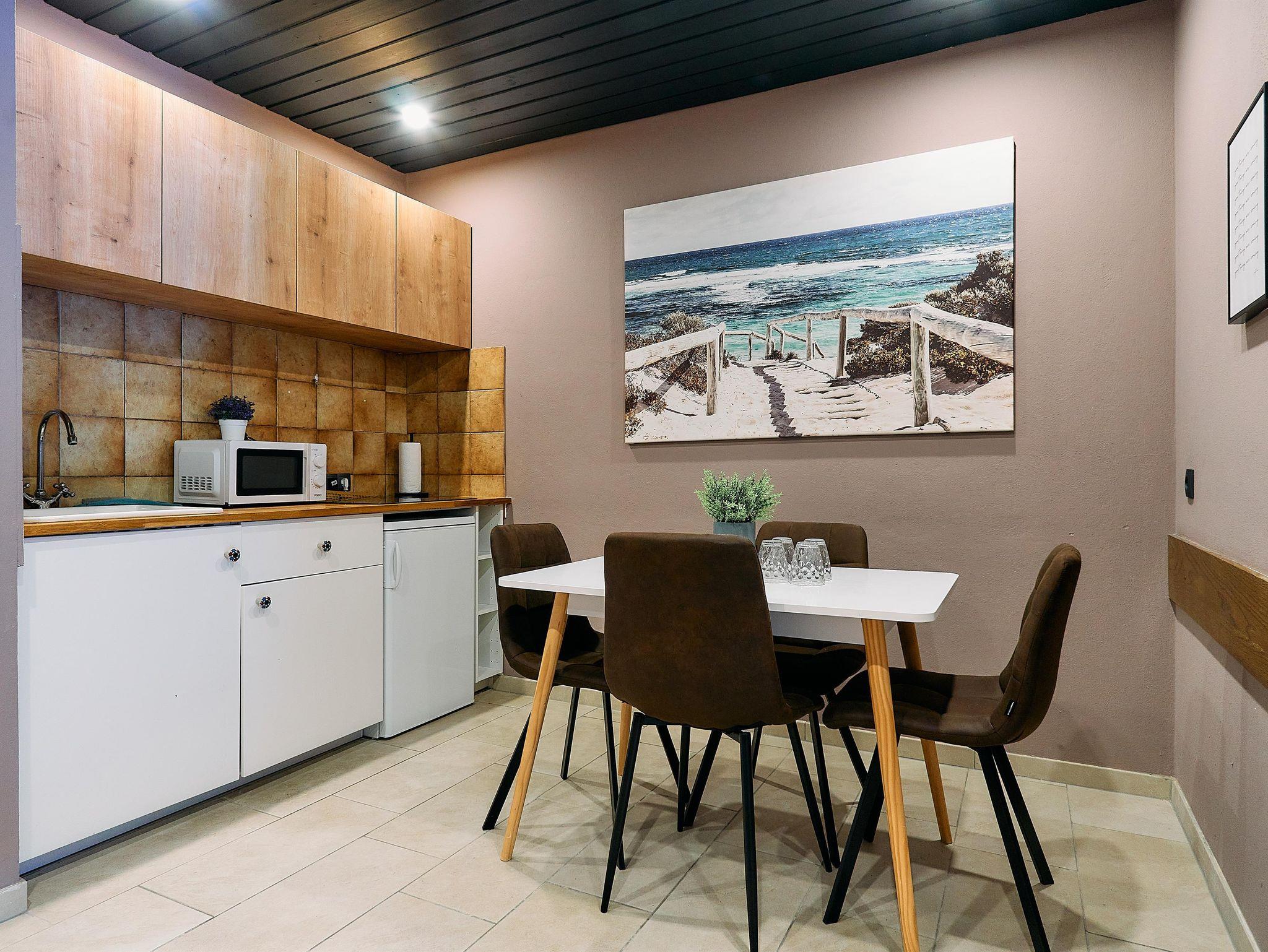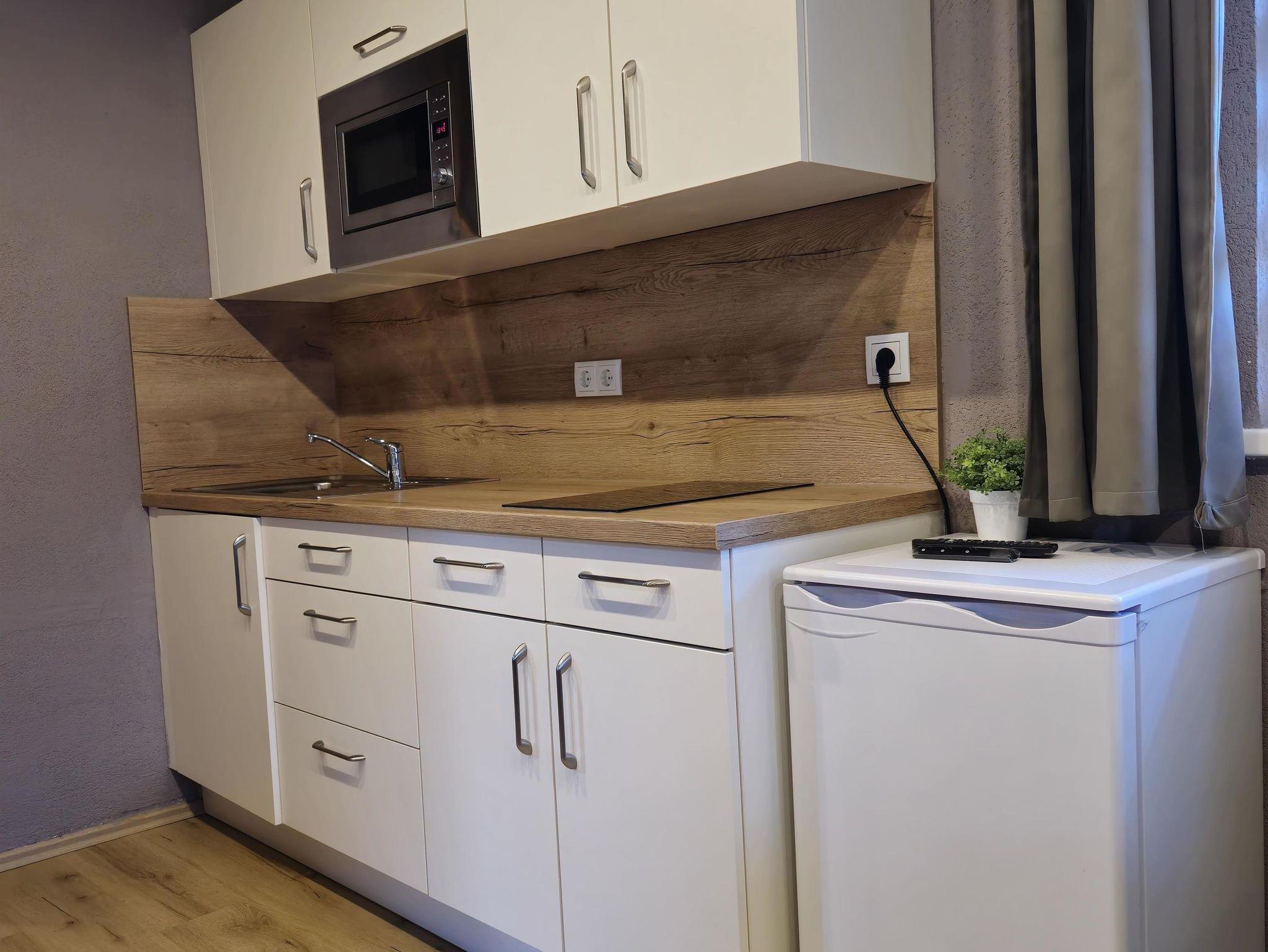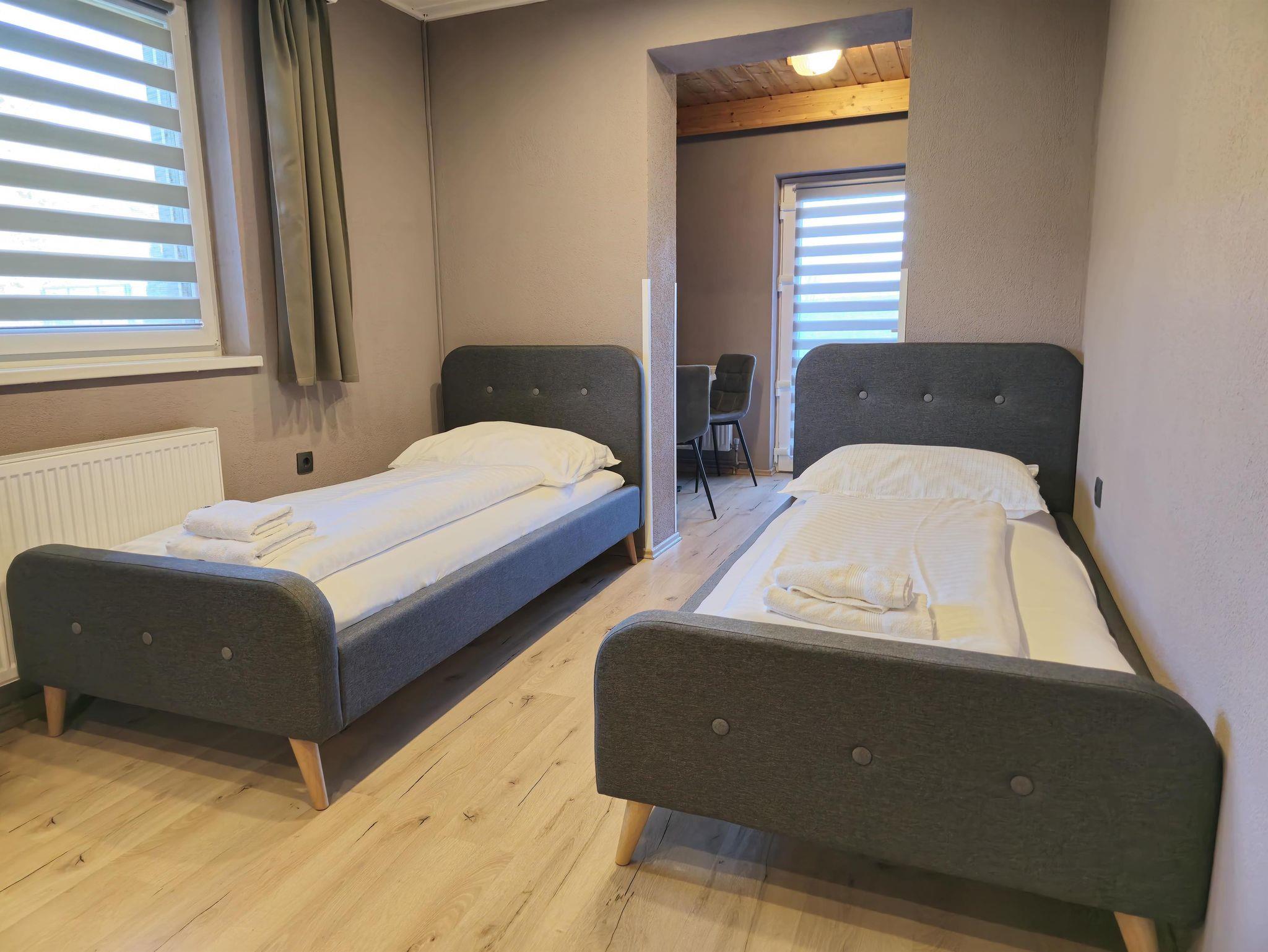 Dich erwartet ein Apartment mit einem Schlafzimmer, Küche und Badezimmer sowie einem Balkon. Es gibt ein Doppelbett und drei Einzelbetten.