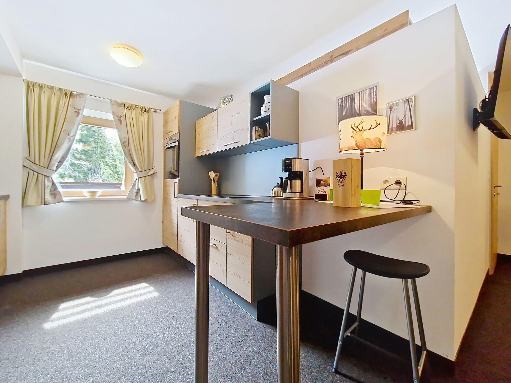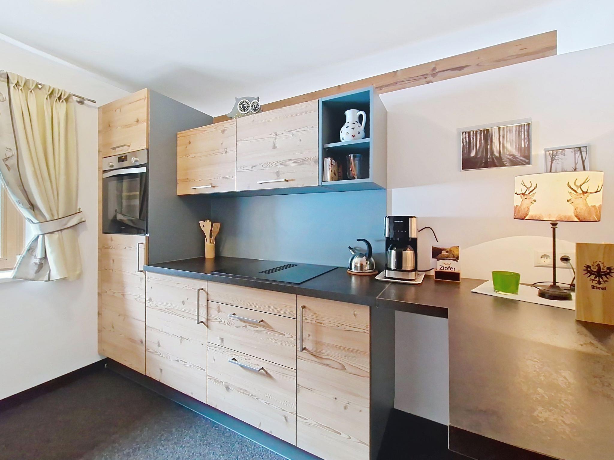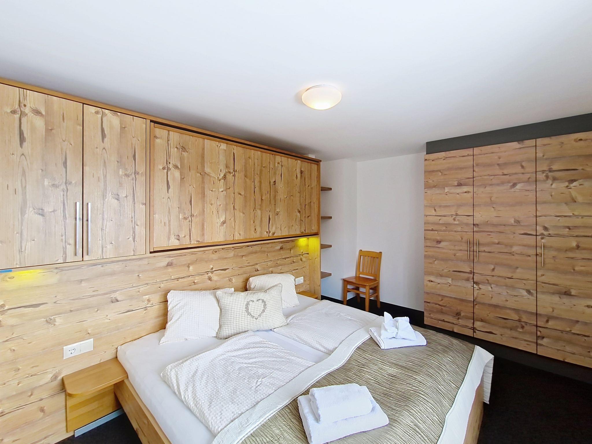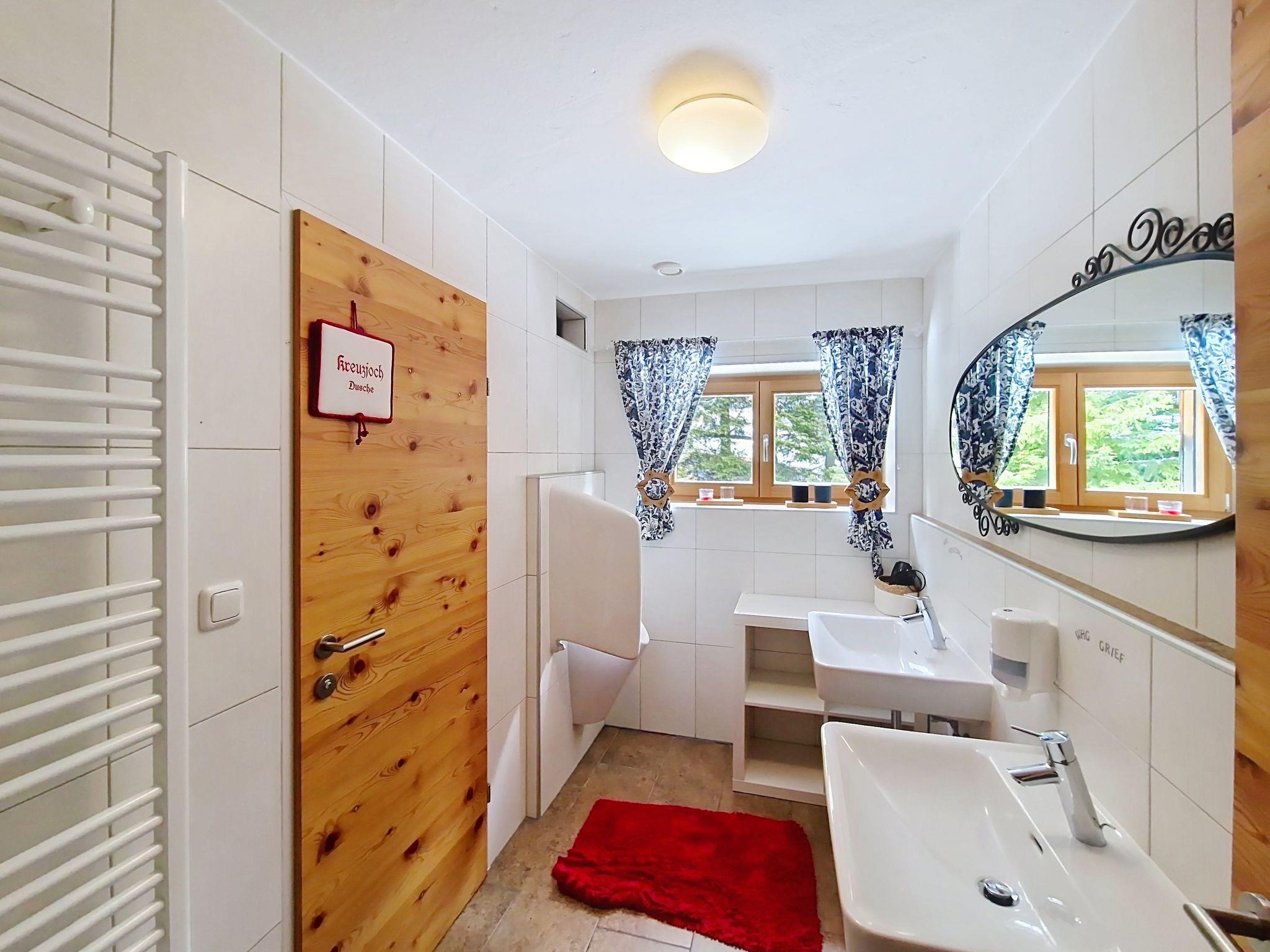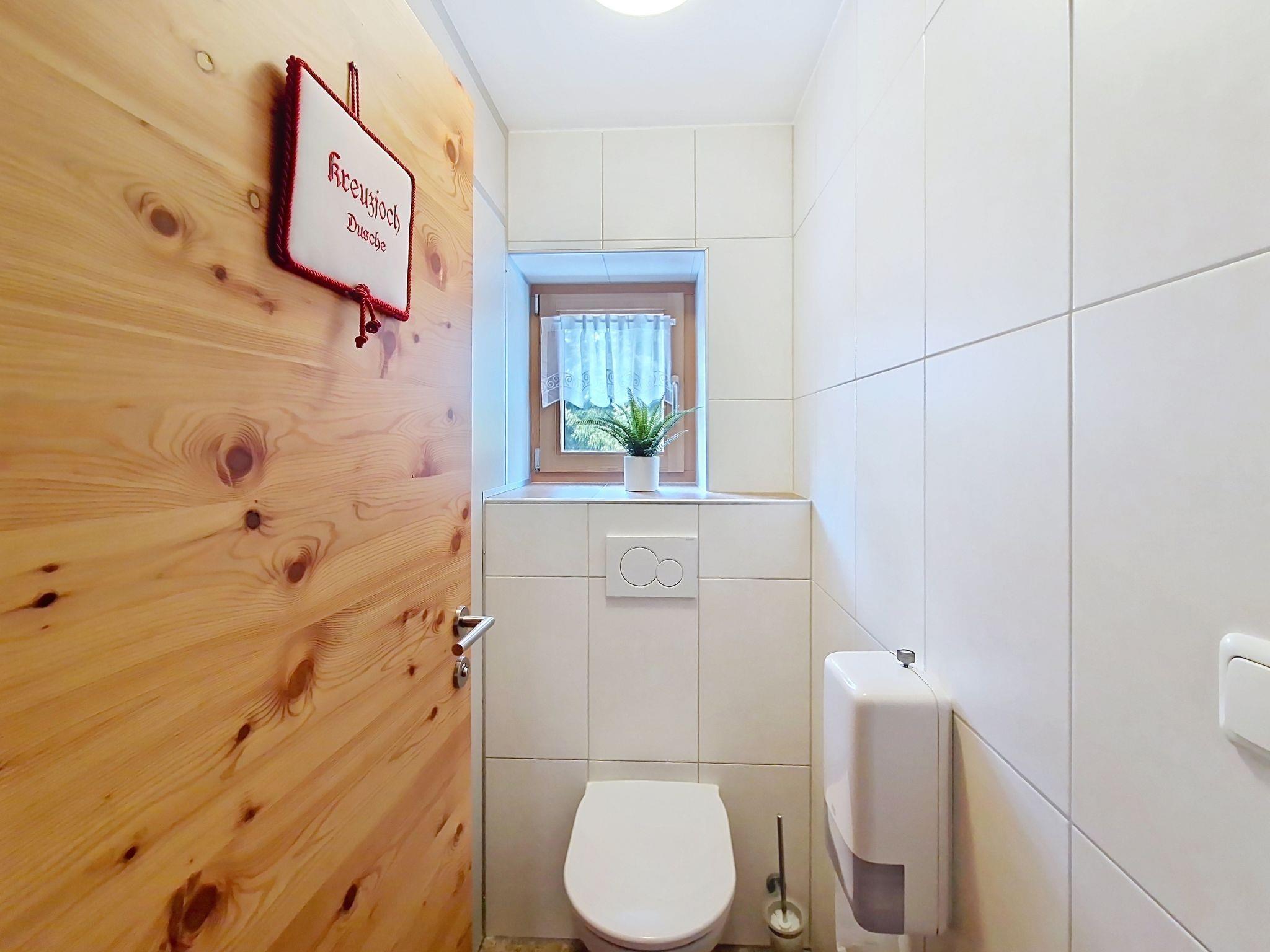"Kreuzjoch", 2-Zimmer-Wohnung 50 m2 im 1. Stock. Geschmackvoll und gemütlich eingerichtet: 1 Doppelzimmer. Grosse Wohnküche (Geschirrspüler, 4 Glaskeramikplatten, Wasserkocher, Mikrowelle, elektrische Kaffeemaschine) mit Bar, 1 x 2 Etagenbetten (90 cm, Länge 200 cm), Essecke und TV (Flachbildschirm). Dusche/WC (privat). Holzheizung. Teppichboden. Sehr schöne Panoramasicht auf die Berge und das Tal. Zur Verfügung: Internet (WLAN, gratis). Bitte beachten: Kühlschrank ohne Gefrierfach, Nichtraucher-Unterkunft. Rauchmelder, Feuerlöscher. Dusche/WC sind ausserhalb der Wohnung-privat! Das Zusatzbett ist im Doppelzimmer über dem Doppelbett.