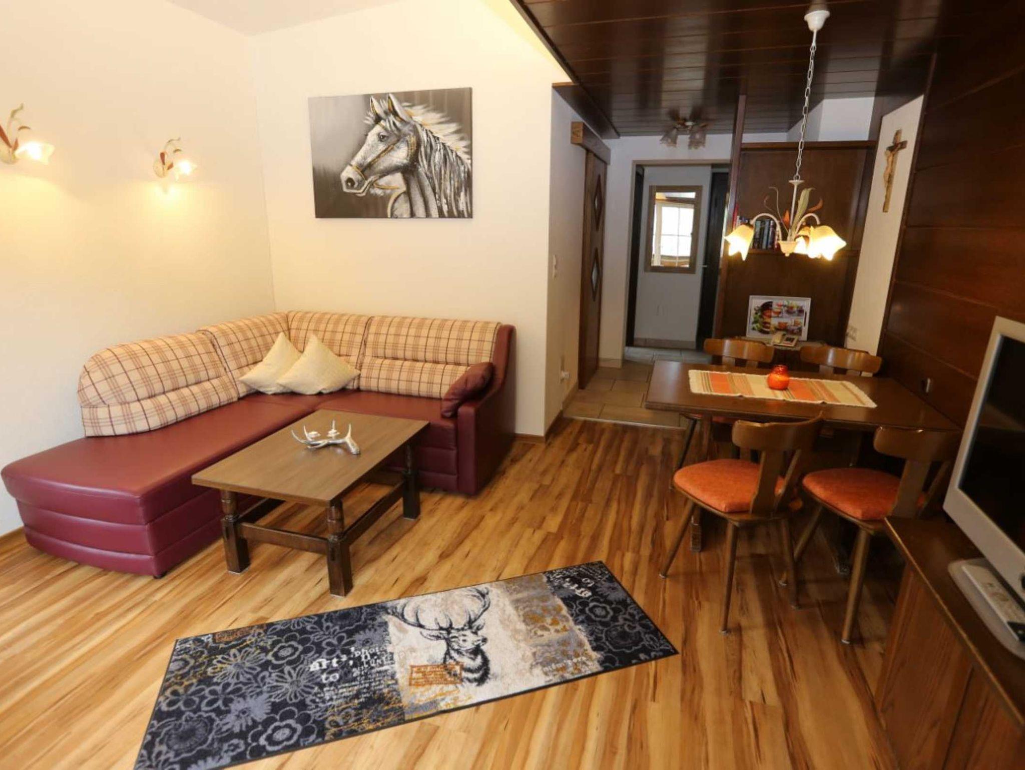 getrenntes Schlafzimmer in der gleichen etage, großes gemütlich eingerichtetes Wohnzimmer mit ausziehbarer Doppelcouch, 70 cm Stereo Fernsehgerät mit Sat Empfang, Telefon, Zimmersafe, Fön usw., Küchenzeile mit Essecke, Badezimmer mit DU u. WC, Vorraum mit Garderobe.