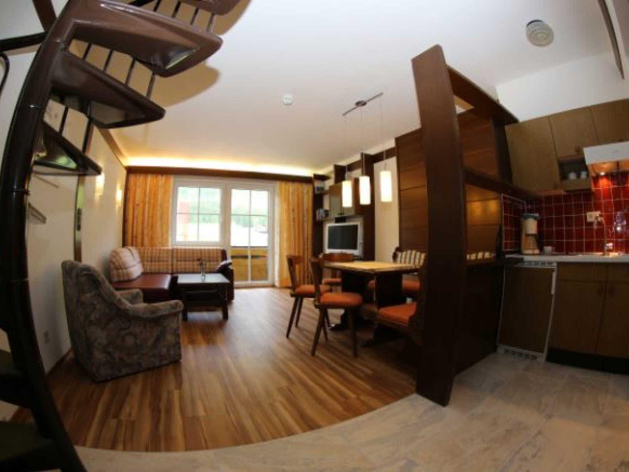 getrenntes Schlafzimmer mit Wendeltreppe und zusätzlicher Toilette, großes gemütlich eingerichtetes Wohnzimmer mit ausziehbarer Doppelcouch, 70 cm Stereo Fernsehgerät mit Sat Empfang, Telefon, Zimmersafe, Fön usw., Küchenzeile mit Essecke, Badezimmer mit DU u. WC, Vorraum mit Garderobe.