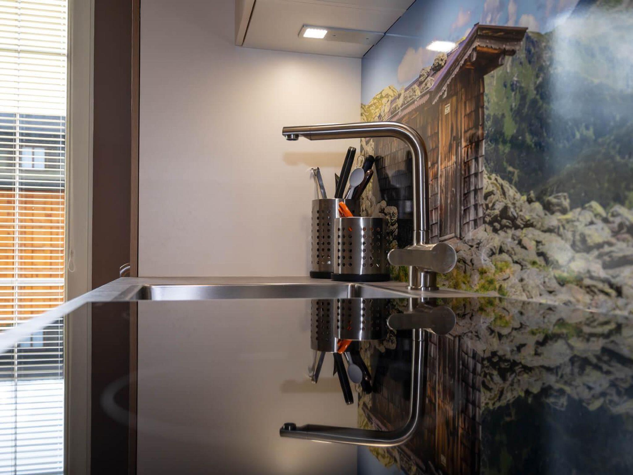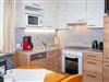 Ausstattung der Wohnung: eine Wohnküche (E-Herd mit Backofen, Mikrowelle, Geschirrspüler, Kühlschrank inkl. Gefrierfach, Safe) mit Esstisch und Wohnbett für 2 Personen, ein Doppelschlafzimmer, Schrankraum, Badezimmer/WC,Kosmetikspiegel, Flat-TV, Internetzugang