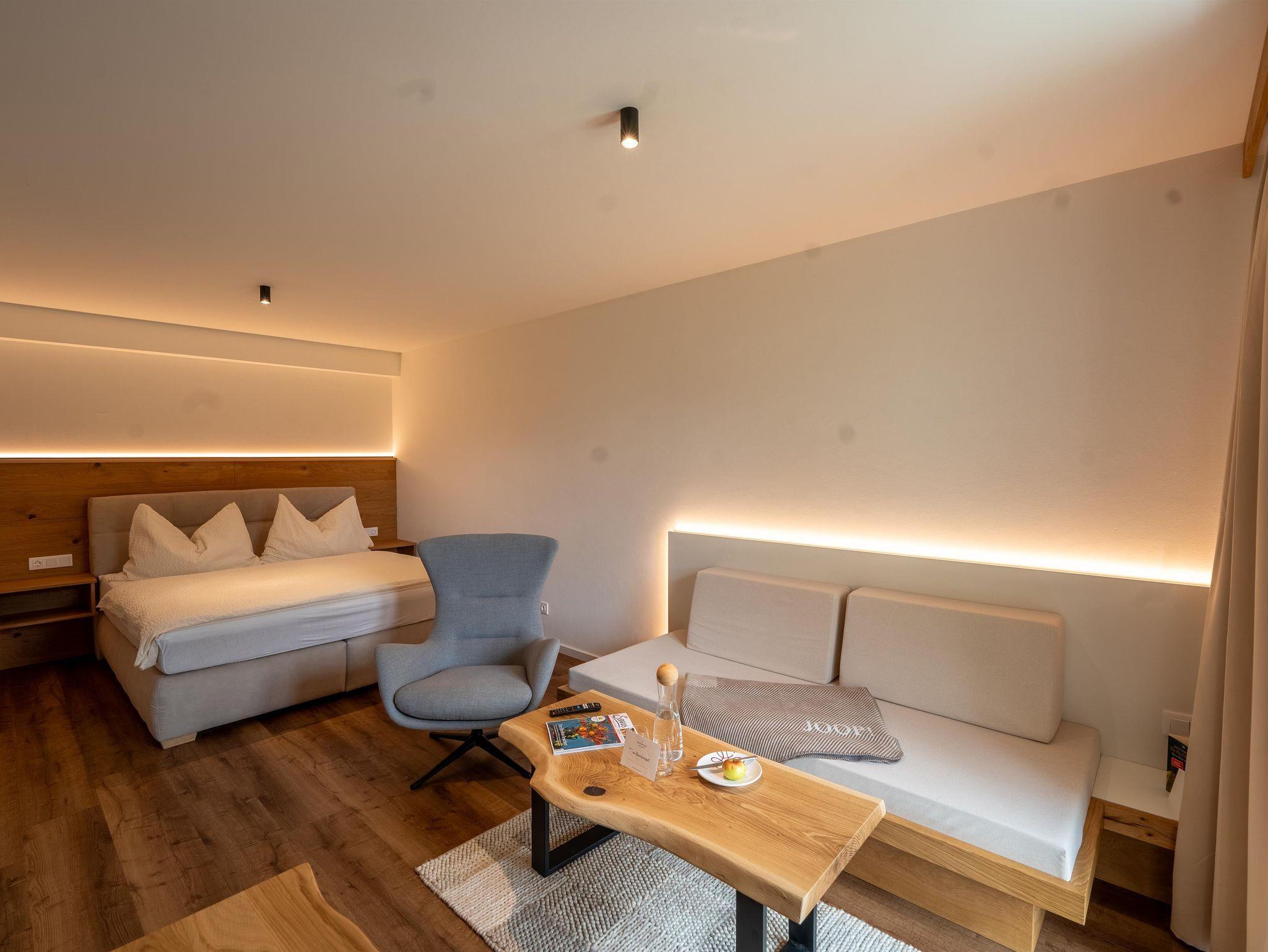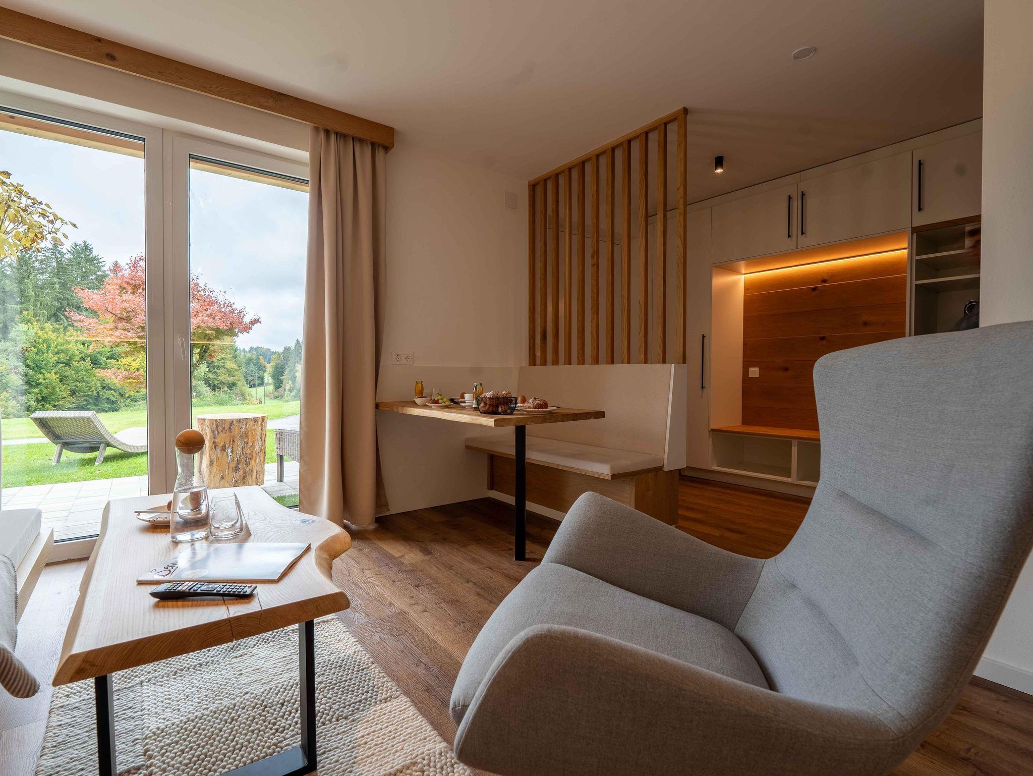 Die Natur Garten Suite Weißtanne verzaubert Menschen durch seine ruhige und zarte Wirkung. Ein Naturmaterial so zart und mit so viel Wirkungskraft. Hell, edel und ganz weich. 37m2 Refugium, Lichterfüllt, Warme Naturfarben und nichts stört.