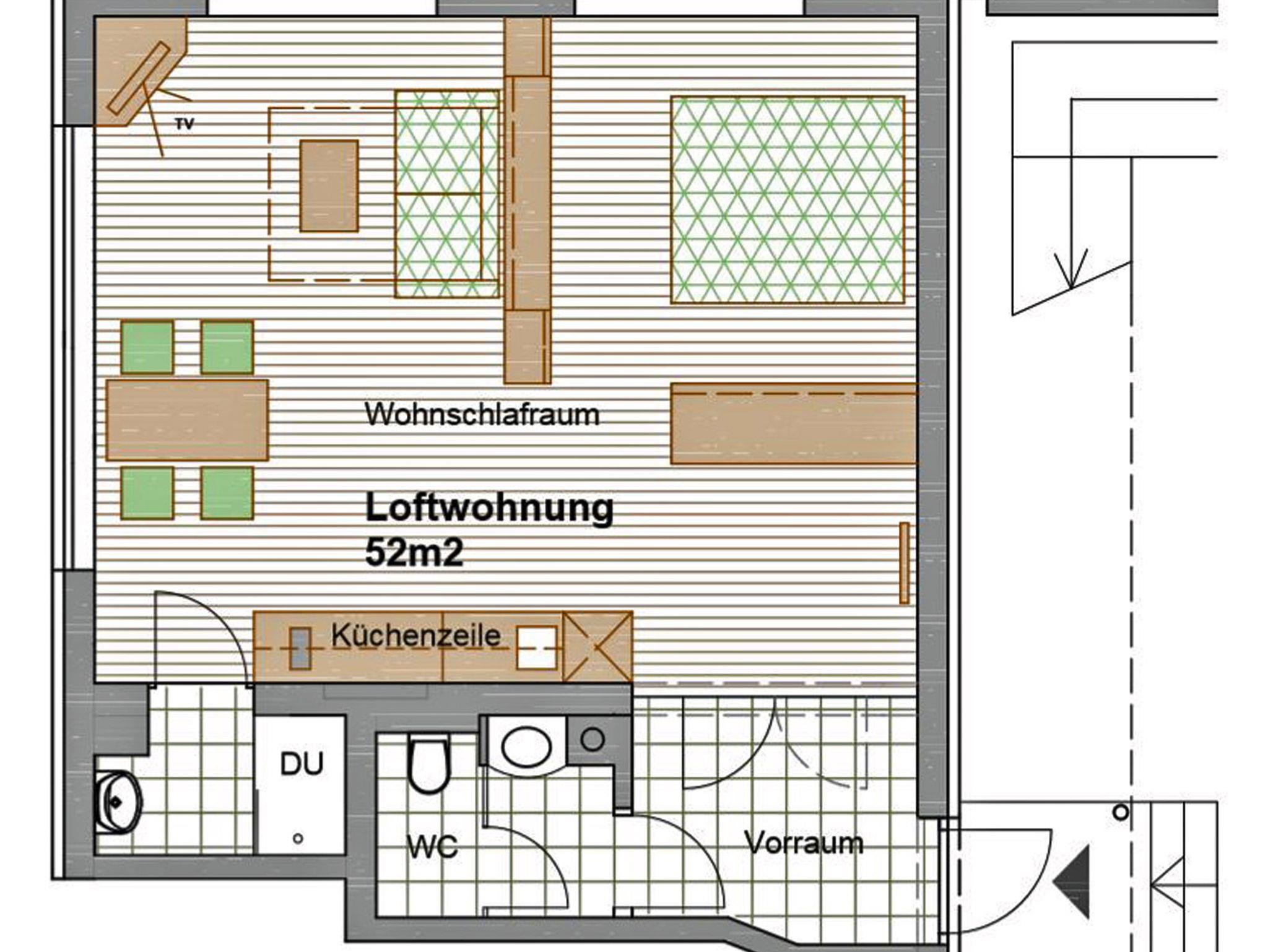 • Loftwohnung (ca.?53?m²) mit offenem Raumkonzept, Küchenblock mit Geschirrspüler sowie eigener Terrasse im Innenhof