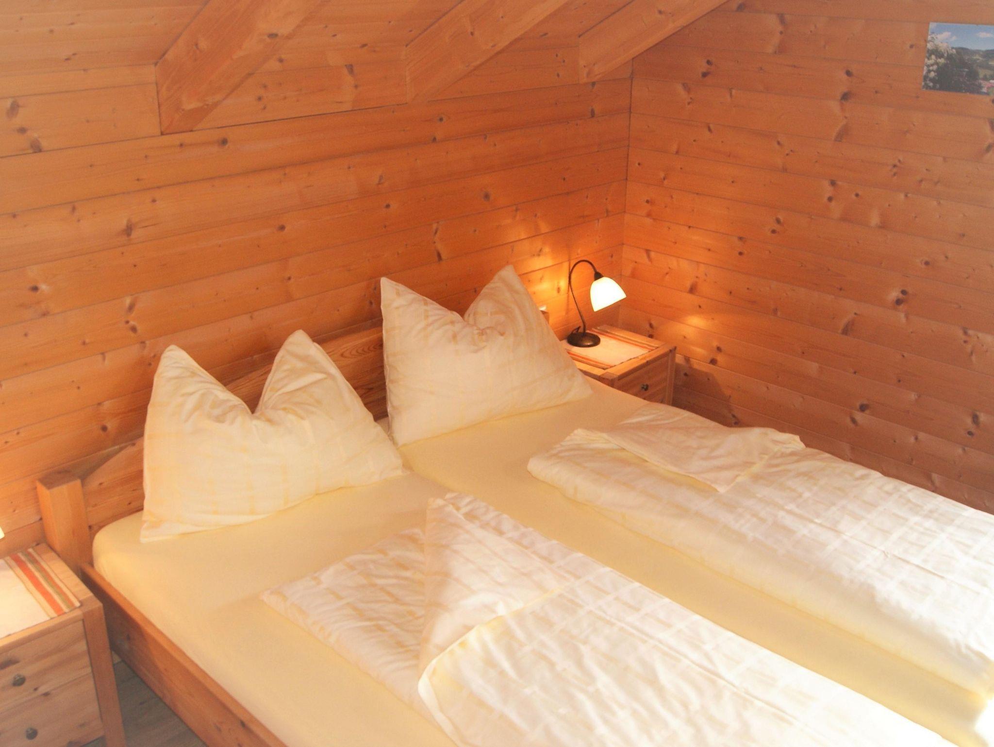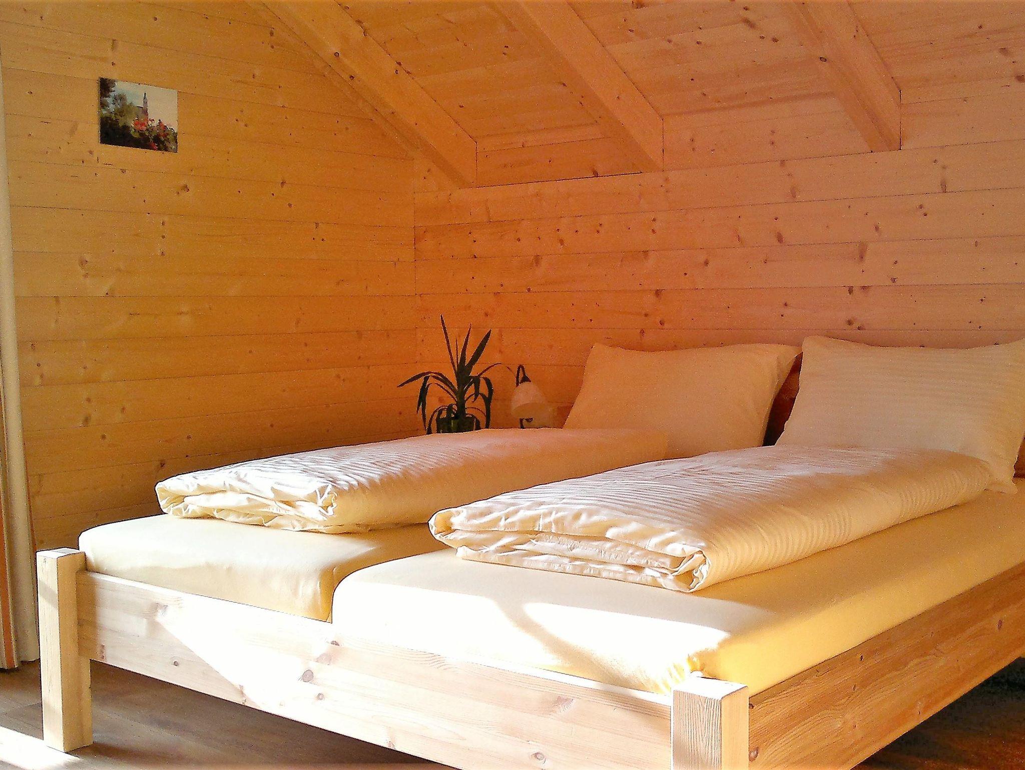 Mit edlem Holzdesign ausgestattetes Ferienhaus, ruhige Lage, traumhafte Ausblicke ins Unendliche, Lärchenholzduft, große Terrasse mit Ausblick, 2 Zimmer mit Balkon, kleine Sauna, drei Schlafzimmer, Teich in der Nachbarschaft