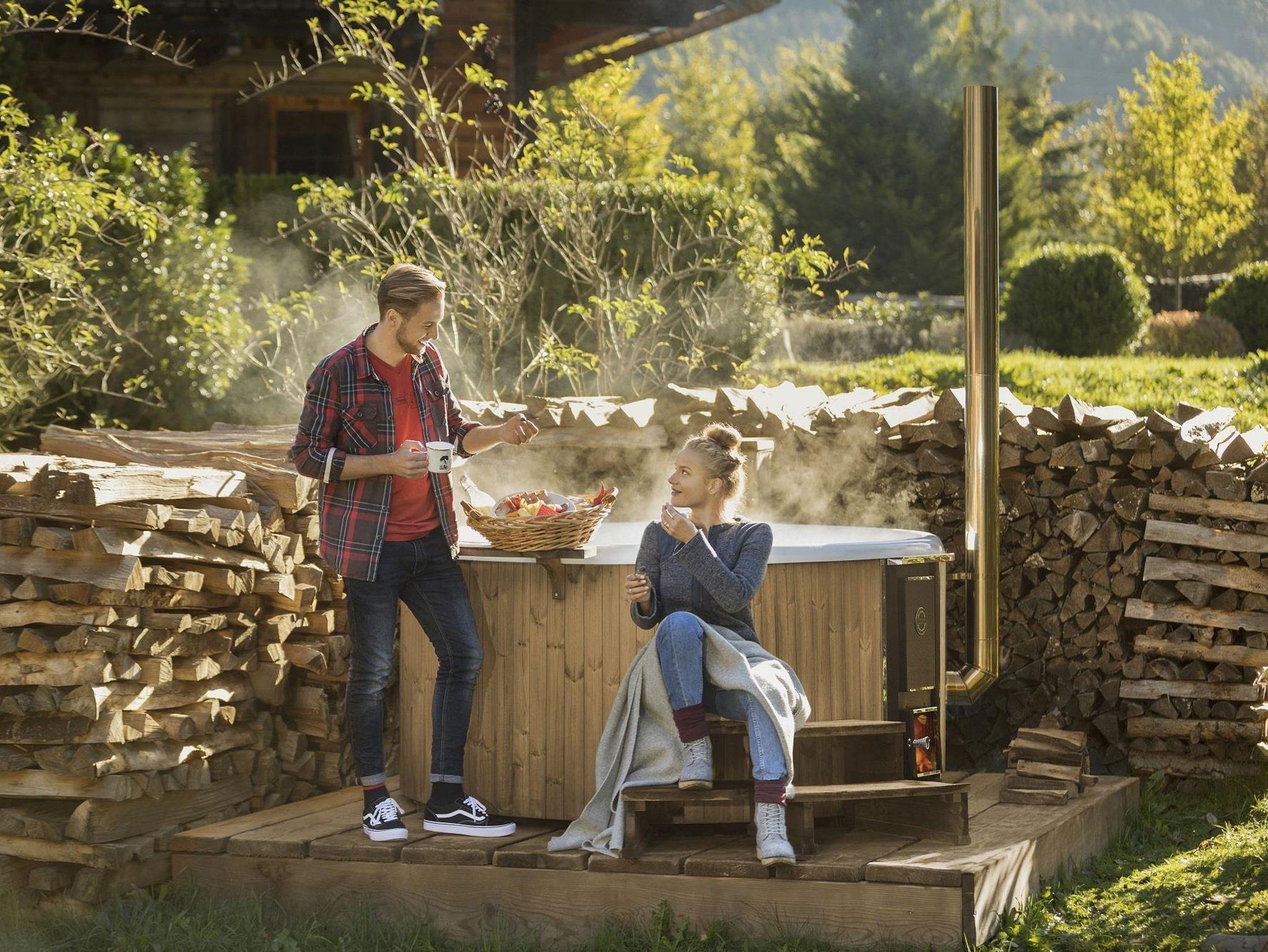 Eines der beiden Schlafzimmer im Obergeschoss hat einen zusätzlichen Wohnbereich. Eine große möblierte Terrasse mit Grill und einzigartigem Ausblick auf den Badeteich und den Wildwasserfluss, sowie eine eigene Liegewiese mit einem privaten Hot Tub für romantisch entspannende Stunden laden zu einem gemütlichen Außenaufenthalt ein.