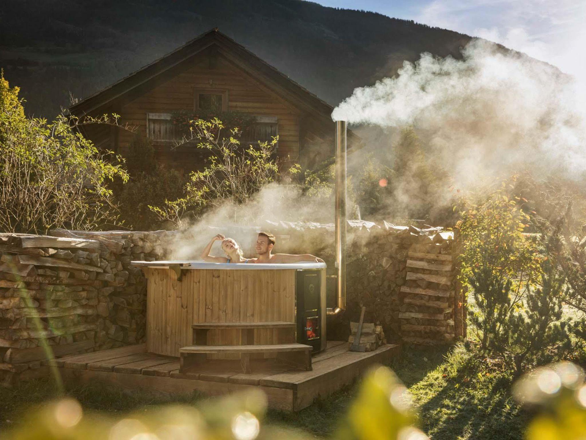 Eines der beiden Schlafzimmer im Obergeschoss hat einen zusätzlichen Wohnbereich. Eine große möblierte Terrasse mit Grill und einzigartigem Ausblick auf den Badeteich und den Wildwasserfluss, sowie eine eigene Liegewiese mit einem privaten Hot Tub für romantisch entspannende Stunden laden zu einem gemütlichen Außenaufenthalt ein.