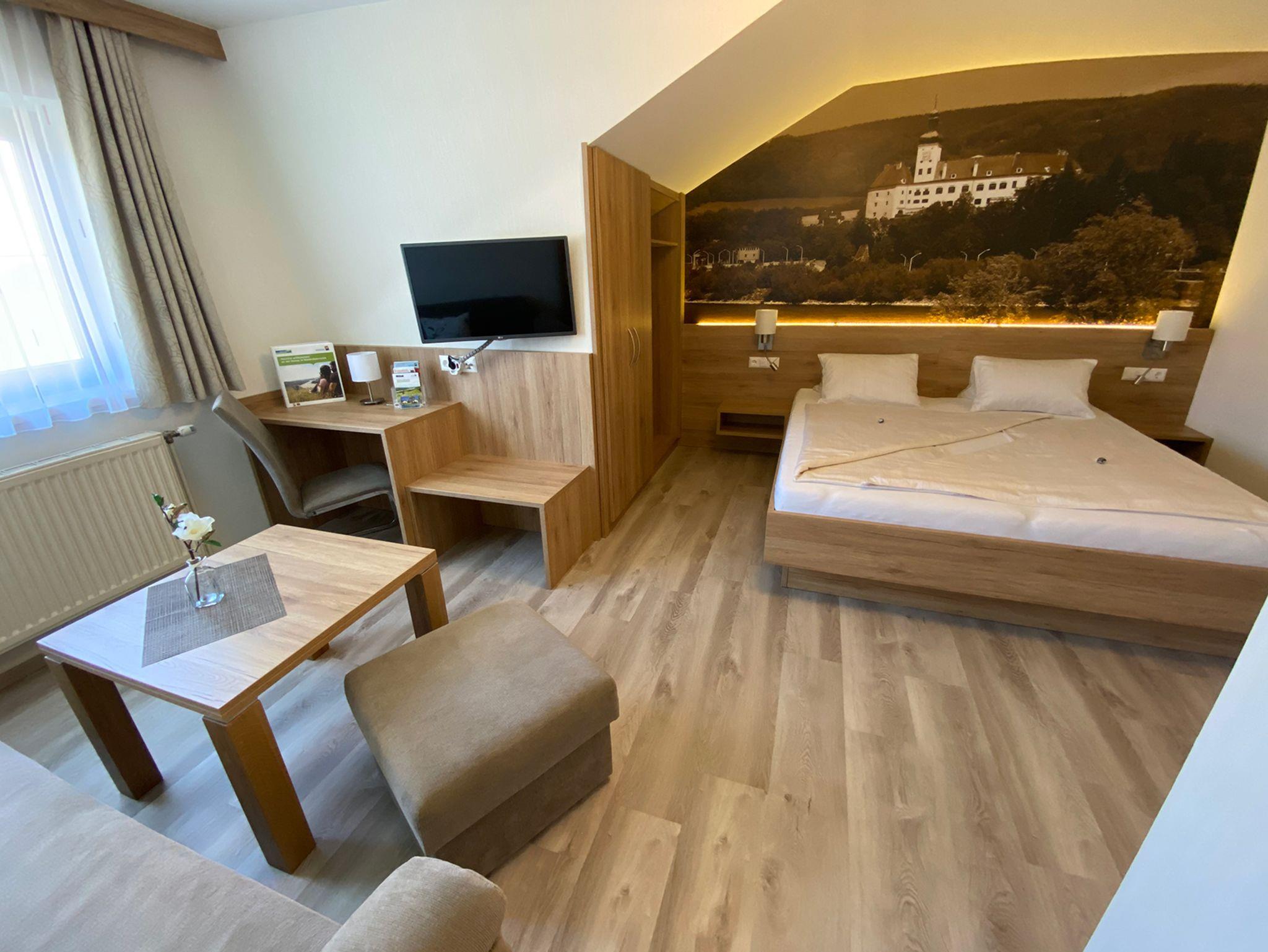 Doppelzimmer „Sommer“ ist hell, geräumig und komfortabel eingerichtet. Sie verfügen über eine eigene Dusche und WC, TV und einen gemütlichen Sitzbereich inklusive Schlafsofa. Die ausziehbare Couch bietet die Möglichkeit, dass das Zimmer auch als Drei- bzw. Vierbettzimmer genutzt werden kann. Im Zimmer ist kostenloses WLAN vorhanden.