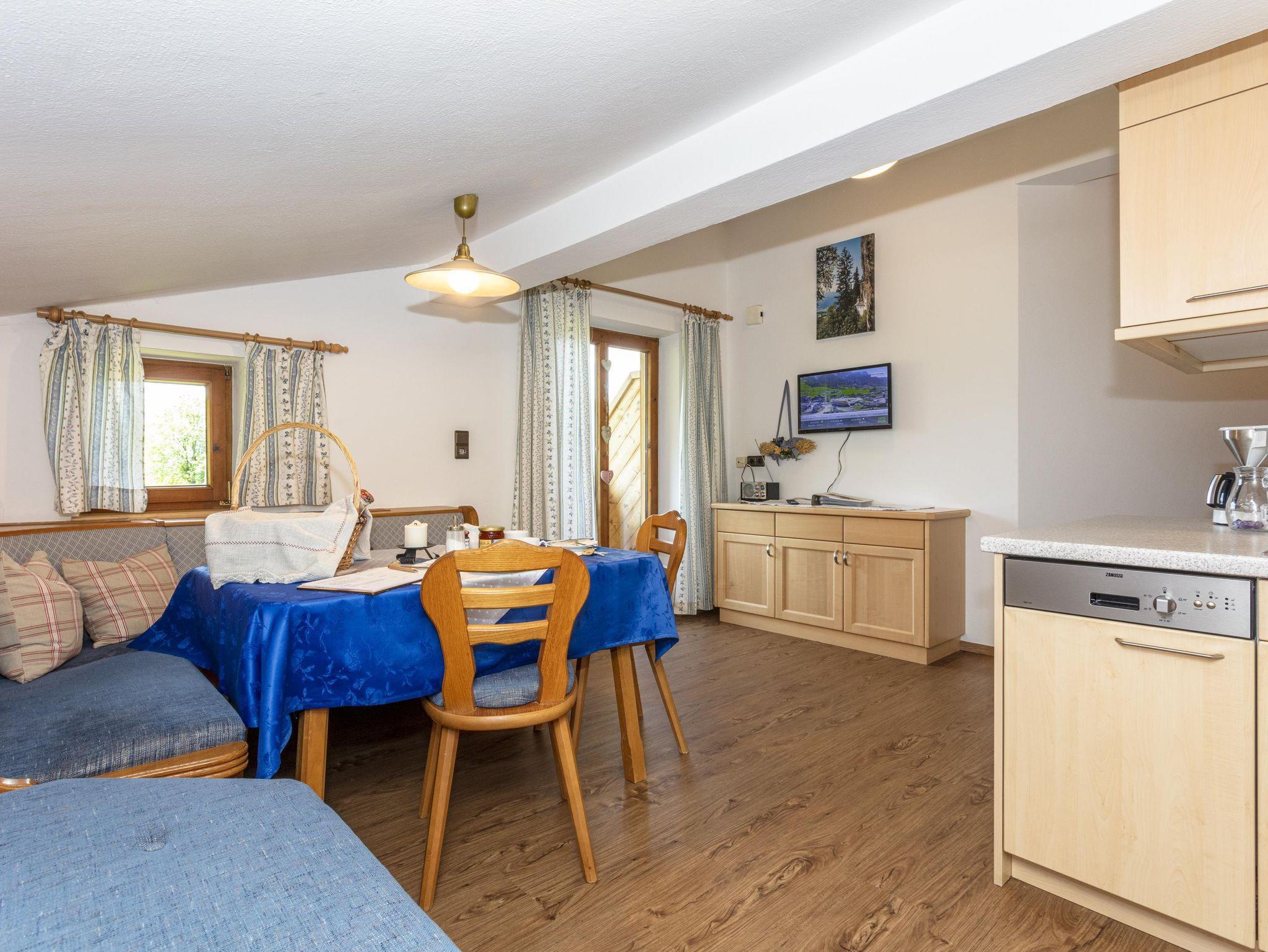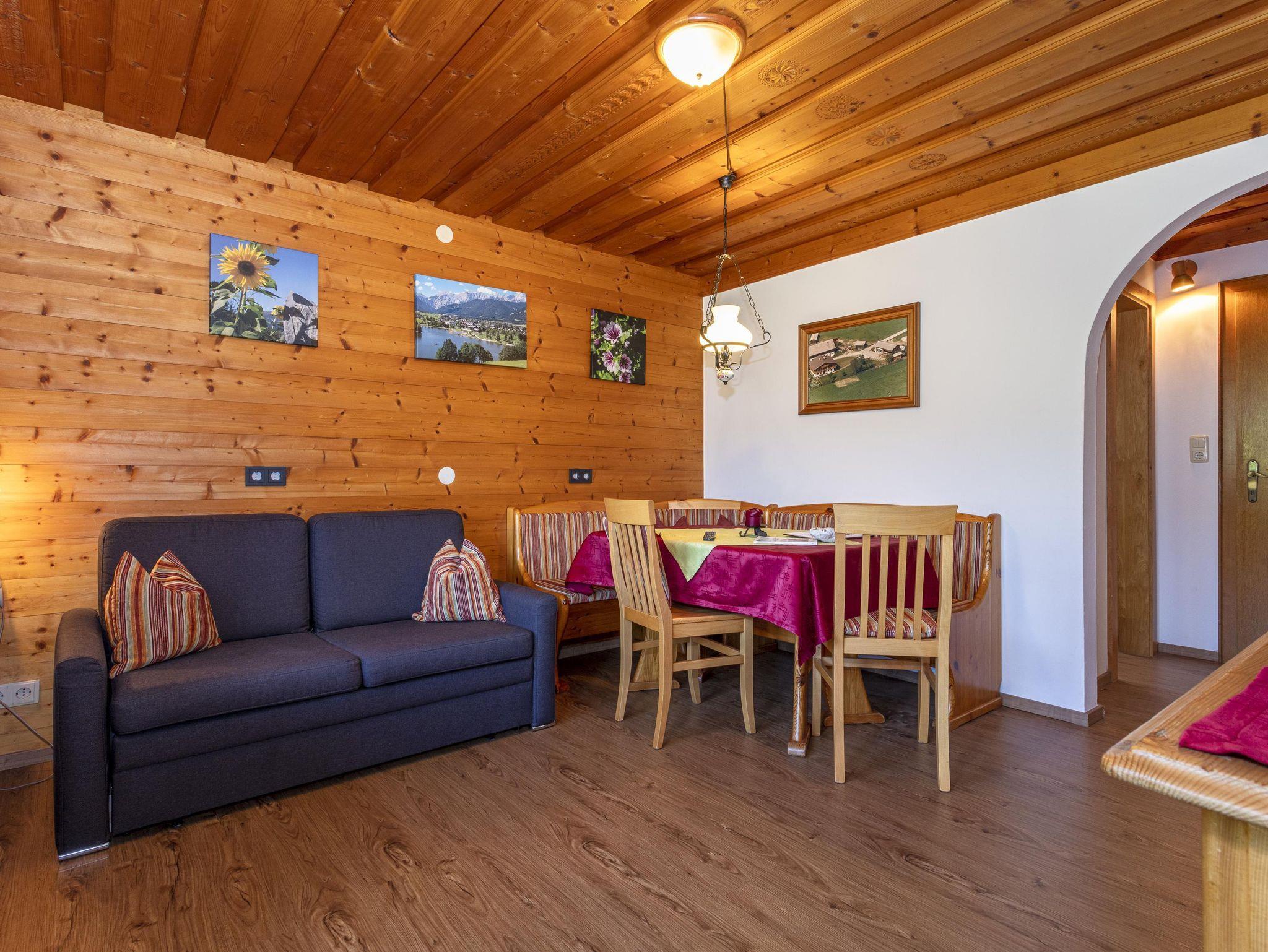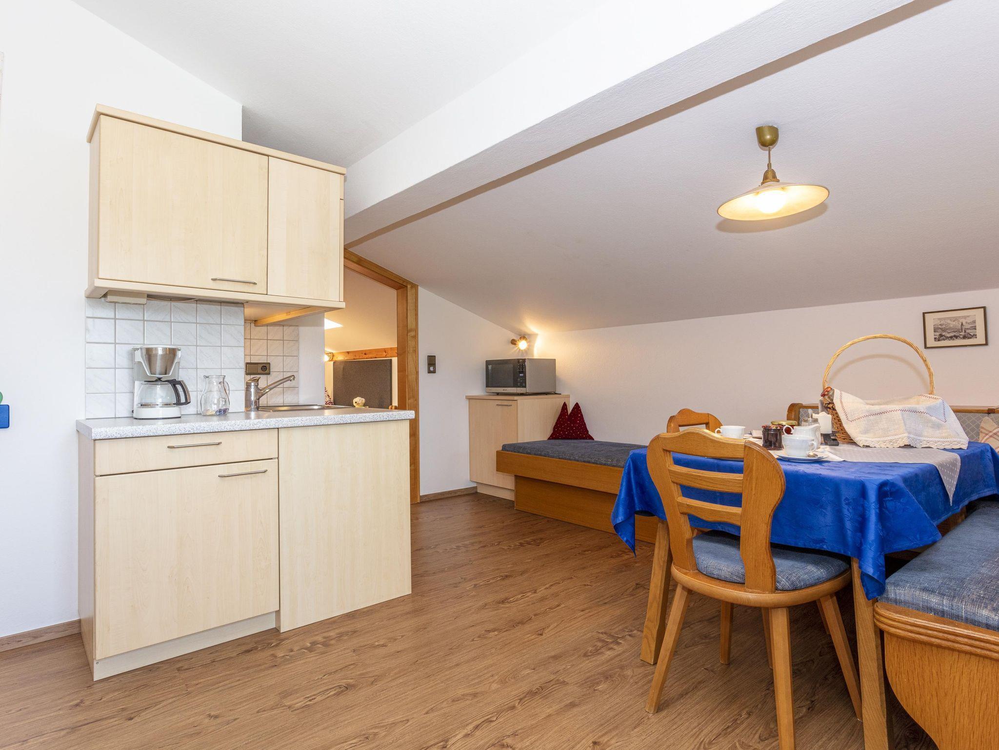 4 - 5 Personen (50 m2): Elternschlafzimmer mit Doppelbett (Zirbenholzzimmer), Kinderzimmer mit 2 Einzelbetten ( Fußende bei allen Betten offen ), Dusche/WC, grosse Wohnküche mit Schlafcouch (5. Person), Eckbank mit grossem Tisch, Küchenblock mit 2 Kochplatten, Mikrowelle mit Backrohrfunktion, Kaffeemaschine, Kühlschrank, Wasserkocher, Geschirrspülmaschine in der Küche, Kabel-TV, Radio, abgeschlossenen Balkon im Dachgeschoß.