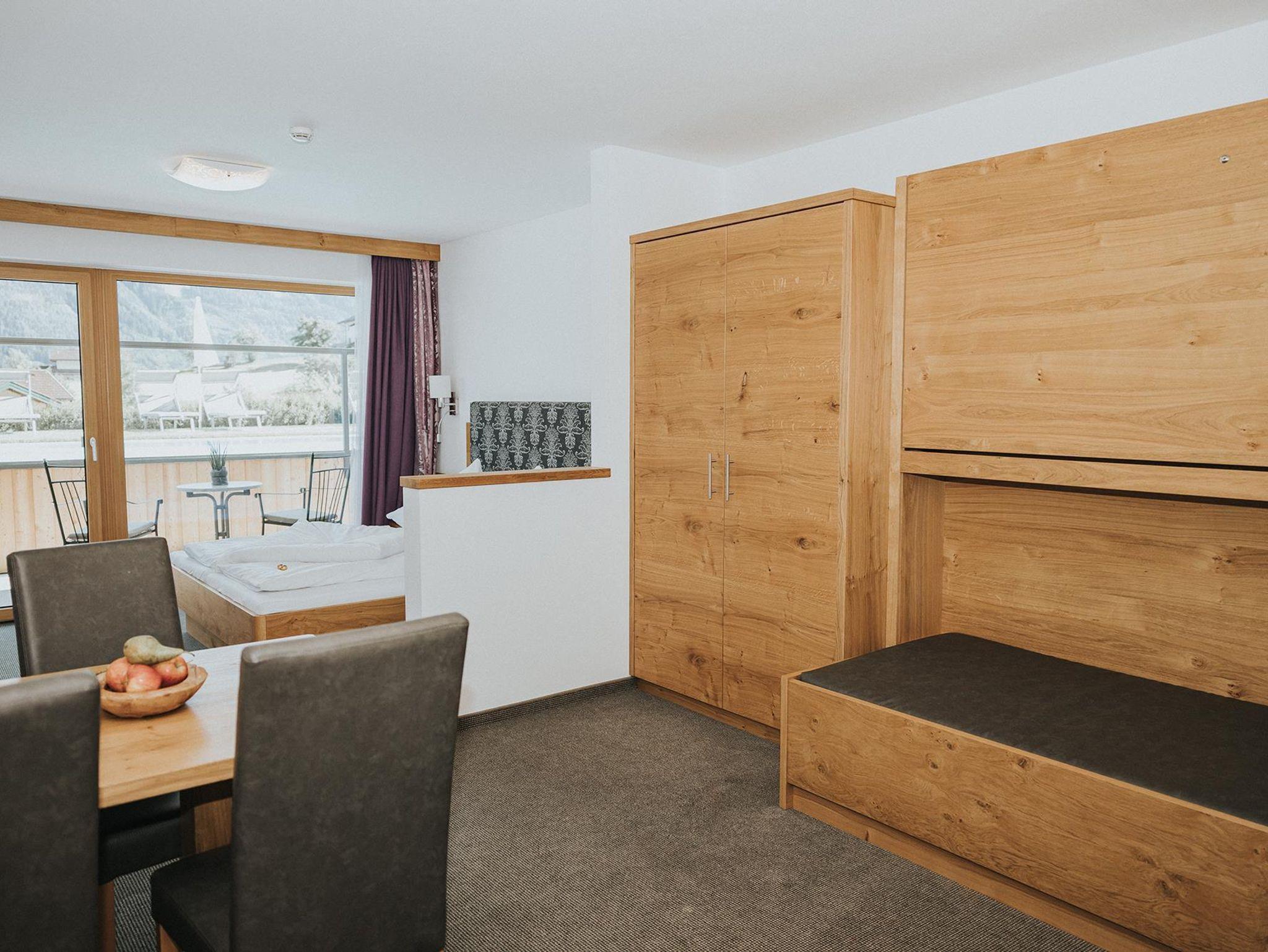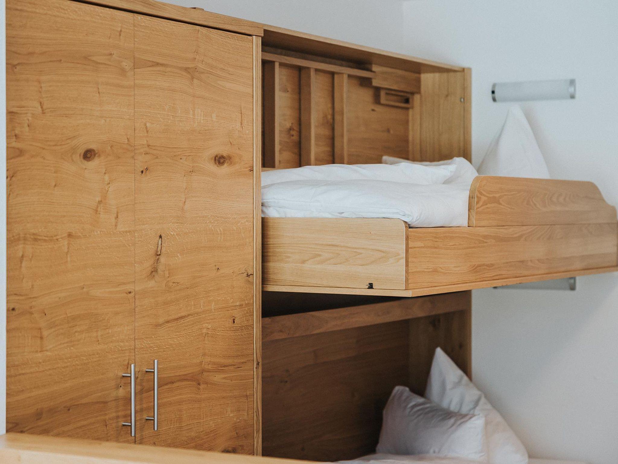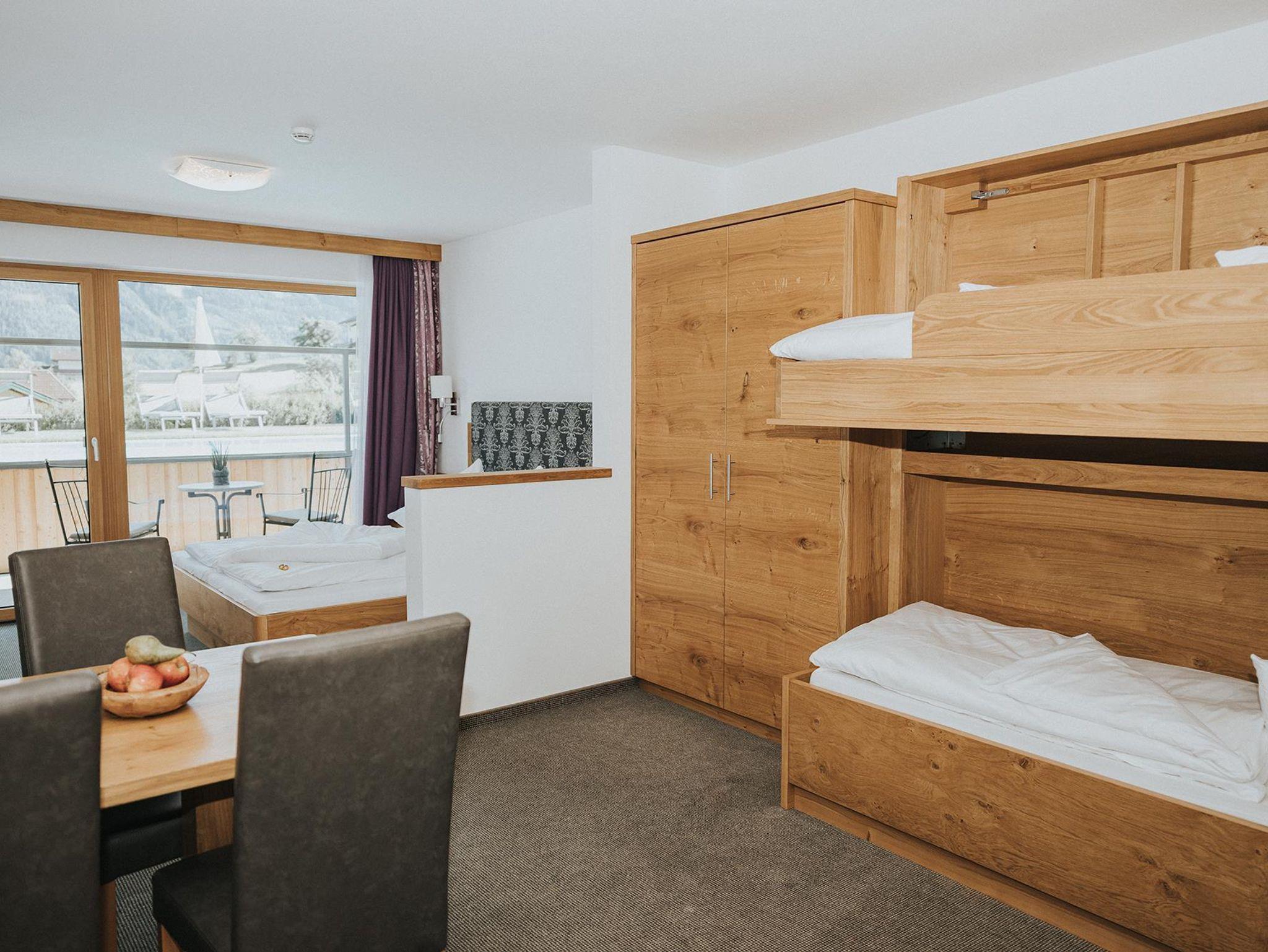 Familien-Gartenzimmer für bis zu 4 Personen, ganz neu, mit großem Doppelbett sowie Stockbett (90x200), Bad WC getrennt, 32 zoll Flat TV, Free-W-lan, Südterrasse mit blick auf den Pool (Sommer)und den Garten.