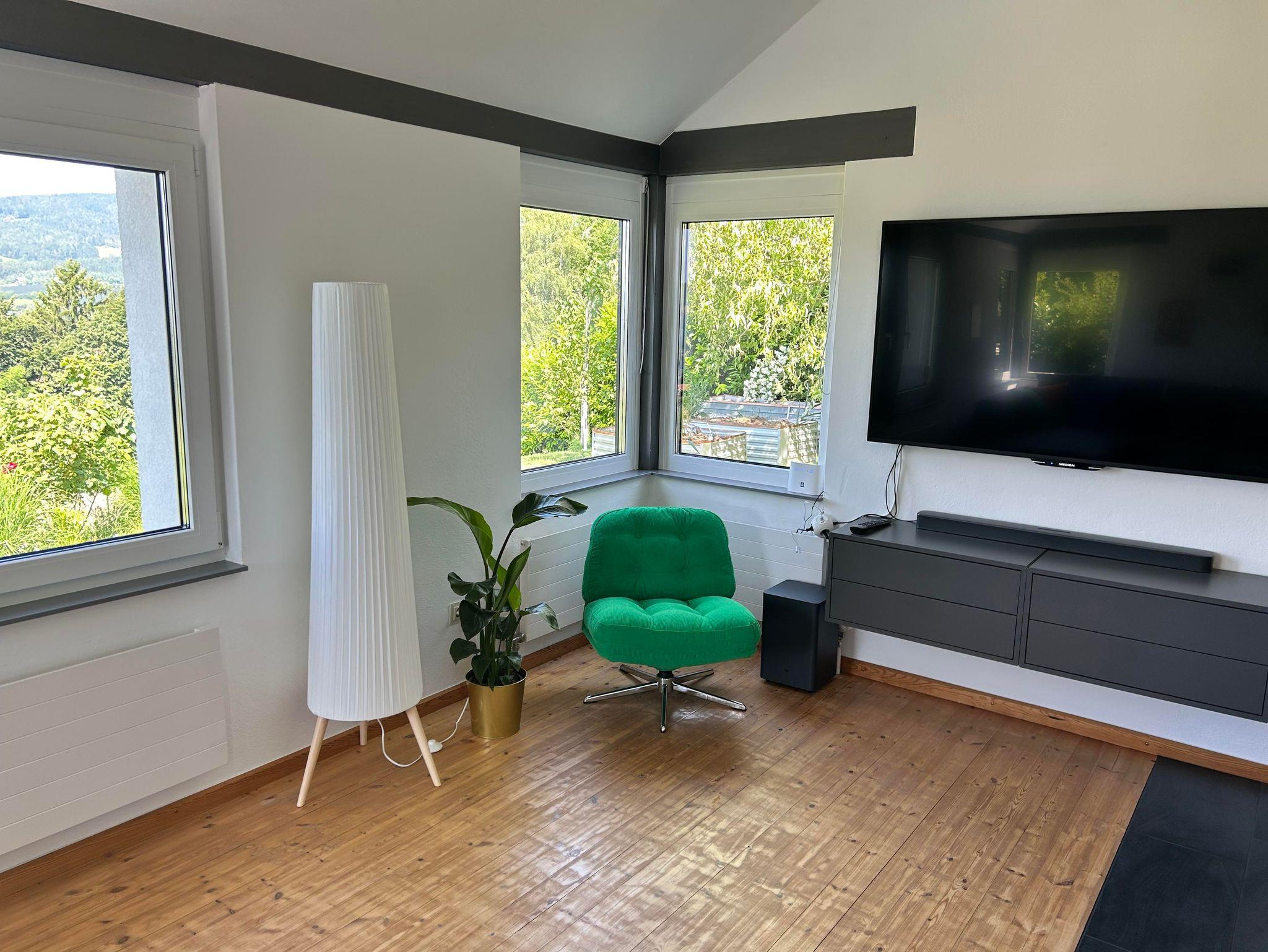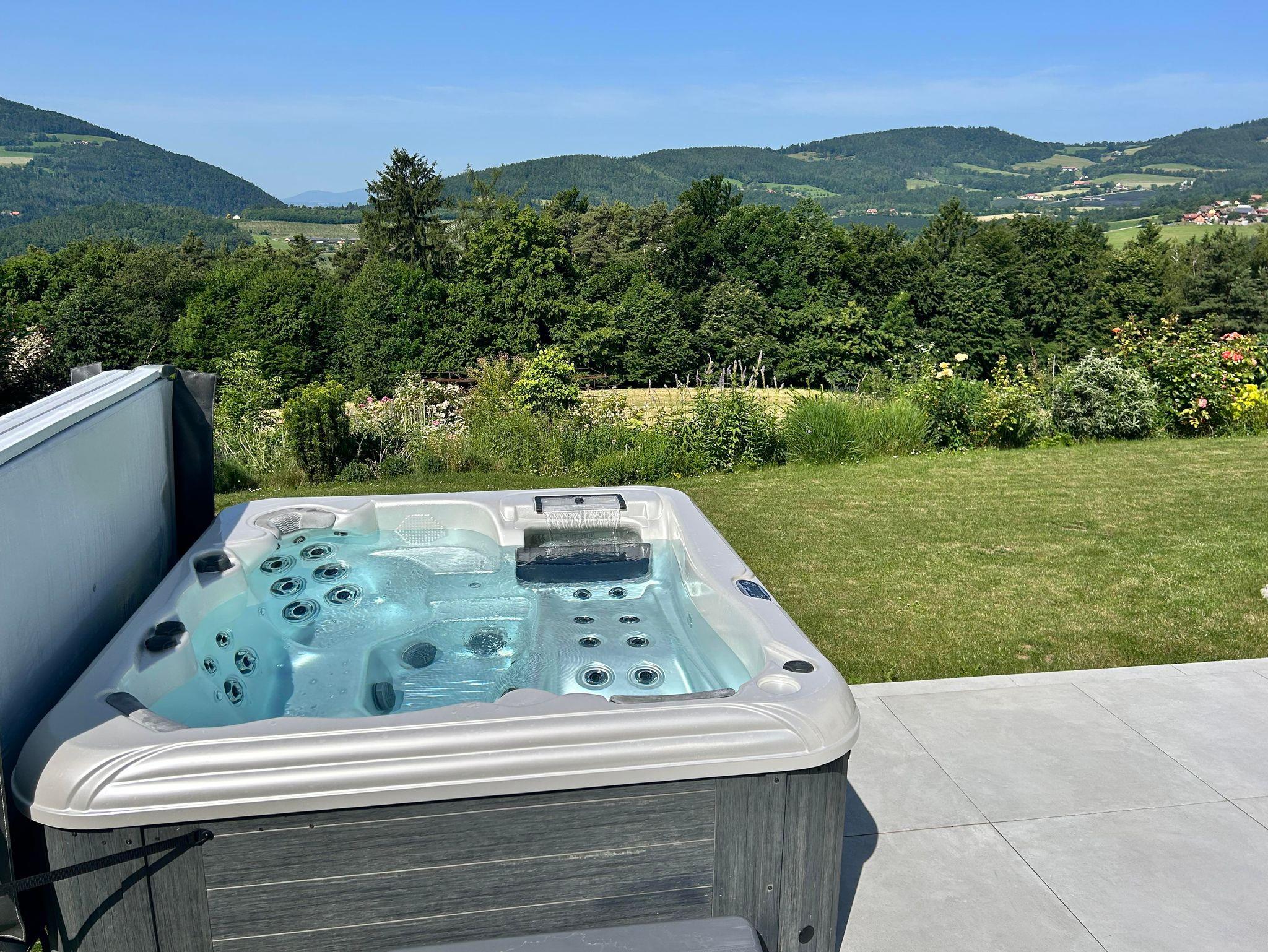 Die große Terrasse mit traumhafter Aussicht laden zum Genießen und Entschleunigen ein. Der Whirlpool, die Warmwasserdusche und eine Markise machen den Genuss perfekt.