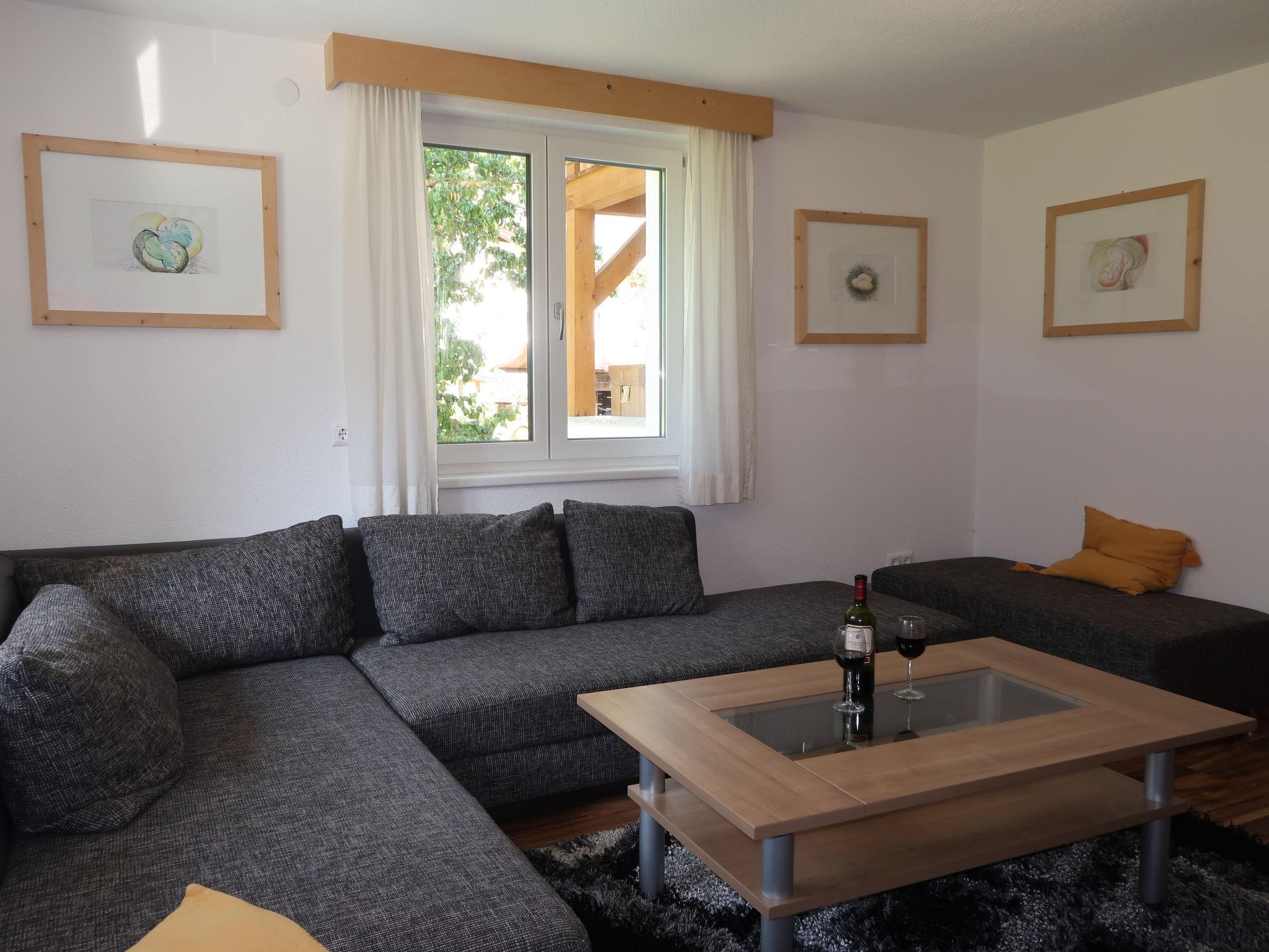 "Aster", 7-Zimmer-Haus 145 m2 auf 2 Stockwerken, im erhöhten Erdgeschoss. Geräumig und hell, gemütlich und mit viel Holz eingerichtet: Wohnzimmer mit Schwedenofen und Sat-TV. 1 Doppelzimmer mit Waschbecken und Dusche. Obergeschoss: 2 Doppelzimmer, jedes Zimmer mit Waschbecken und Dusche. 2 Doppelzimmer, jedes Zimmer mit Waschbecken. Esszimmer mit Esstisch und Sat-TV. Küche (Backofen, Geschirrspüler, 4 Glaskeramikplatten, Toaster, Wasserkocher, Mikrowelle, Tiefkühler, elektrische Kaffeemaschine) mit kleinem Esstisch, Durchreiche. Dusche/WC, sep. WC. Heizung. Holzdielenboden. Grosser Balkon, 2 Terrassen. Terrassenmöbel, Balkonmöbel, Liegestühle (8). Schöne Sicht auf die Berge. Zur Verfügung: Waschmaschine, Bügeleisen, Kinderhochstuhl, Babybett. Internet (Wireless LAN, gratis). E-Ladestation. Bitte beachten: geeignet für Familien. Rauchmelder.