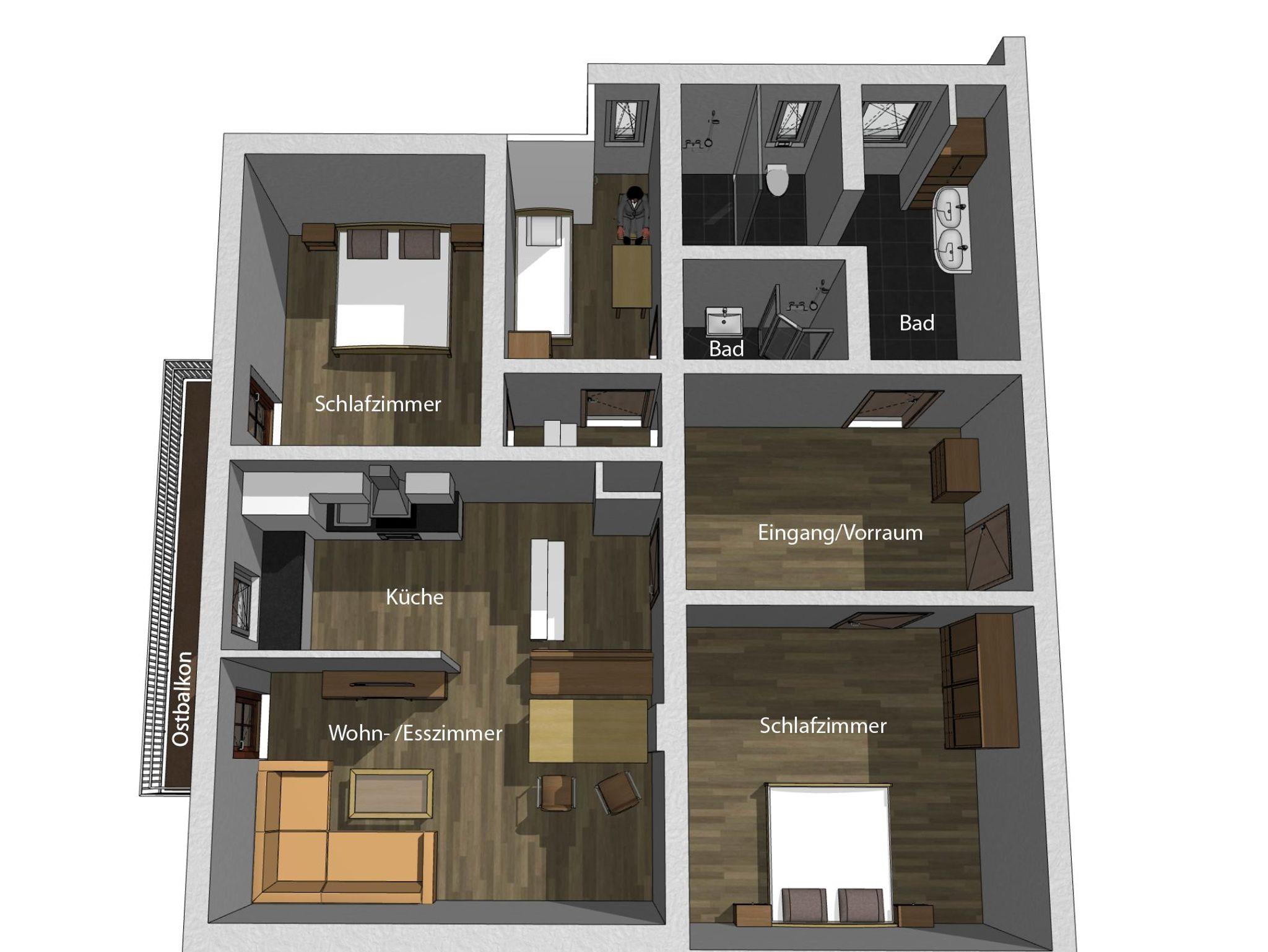 Zwei Schlafräume, zweimal DU/WC einfach ideal, Kochnische, Ostbalkon schnelles Internet (Glasfaser) 38m²