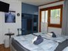 Zimmer mit Zwei Einzelbetten und kleinem Bad. Balkon mit Gartenblick