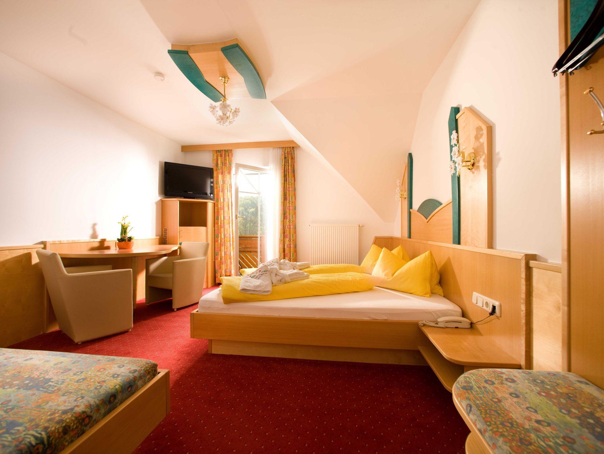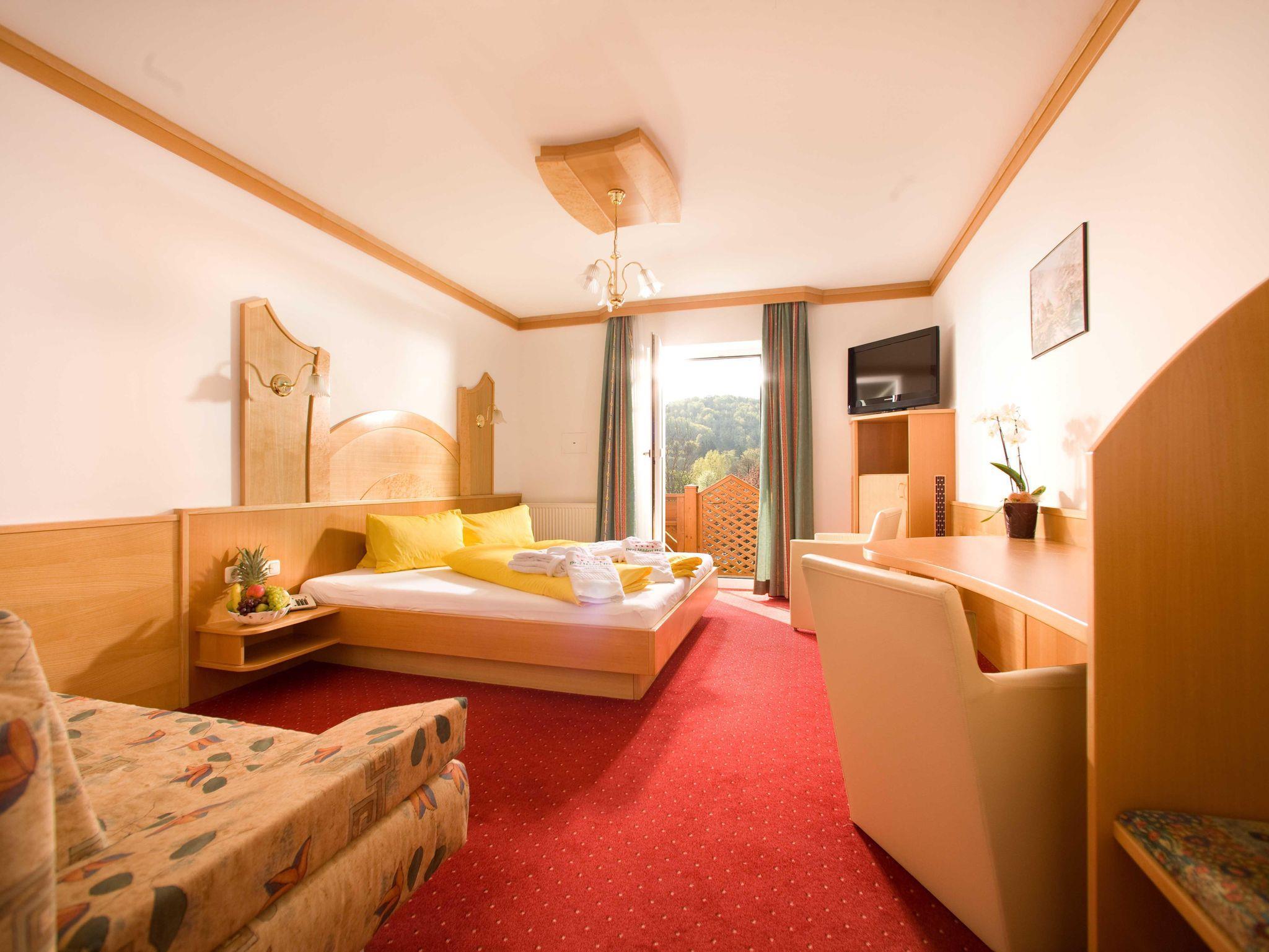 22 Quadratmeter großes Doppelzimmer mit Klima für zwei Personen mit Balkon, Minibar, SAT-TV, Bad und WC getrennt, Telefon, Zimmersafe und kostenlosem WLAN.http://www.maederlhaus.at