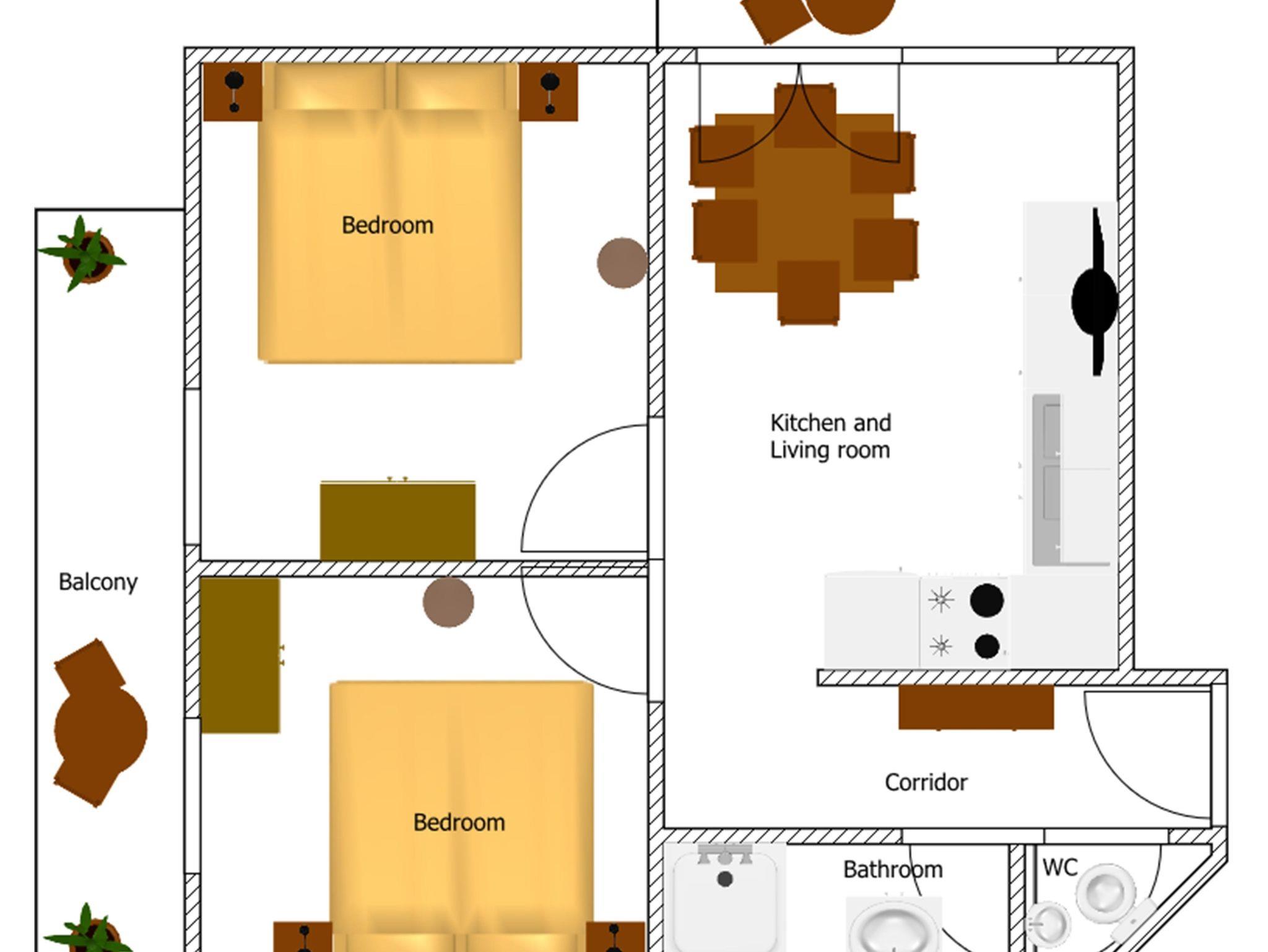 Appartement 1: Elektroherd mit vier Herdplatten, Kühlschrank, Kaffeemaschine, Wasserkocher, extra Vorraum, Bad/Dusche/WC, Föhn, Balkon, Couch, Sitzgruppe, Sat-TV, Radio.