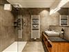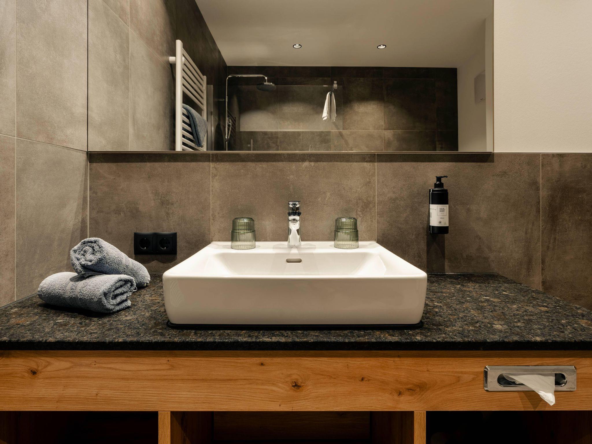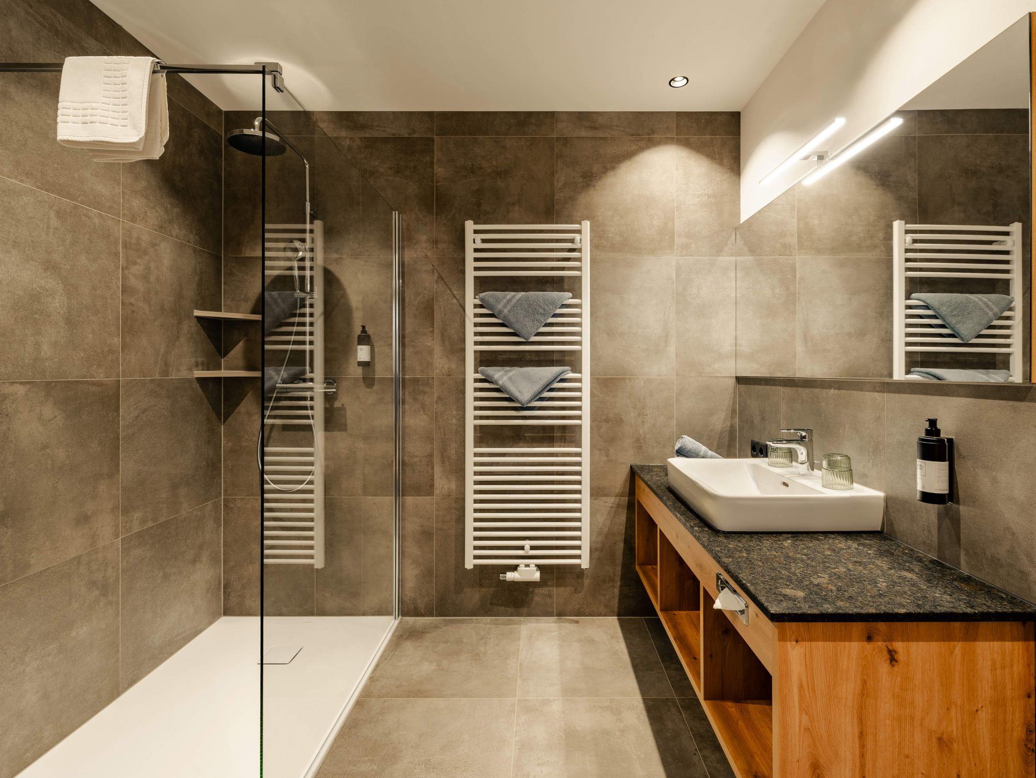 Großes Badezimmer (6m²) teilweise mit Fenster, ebenerdiger Dusche, Waschbecken und WC, Föhn, Seife, Duschgel.