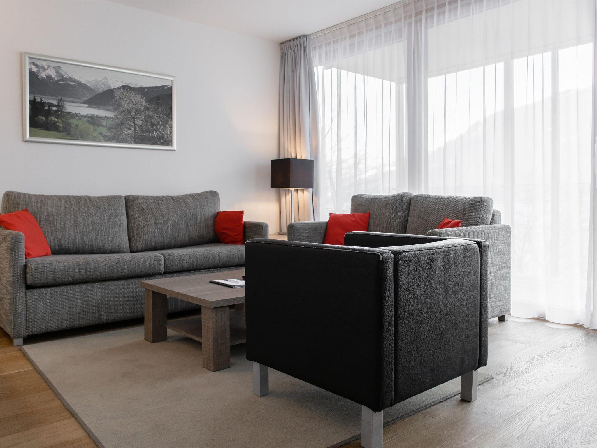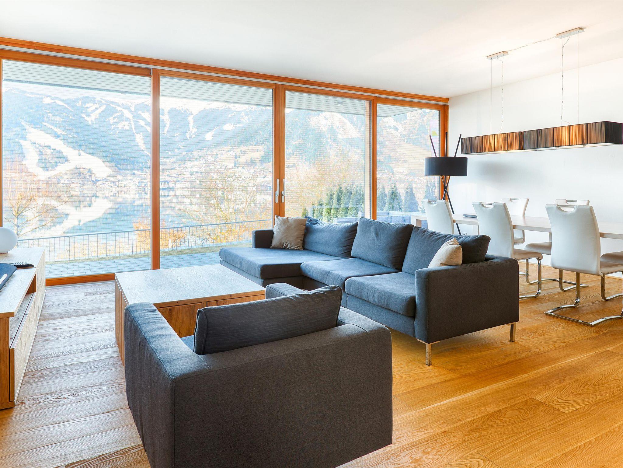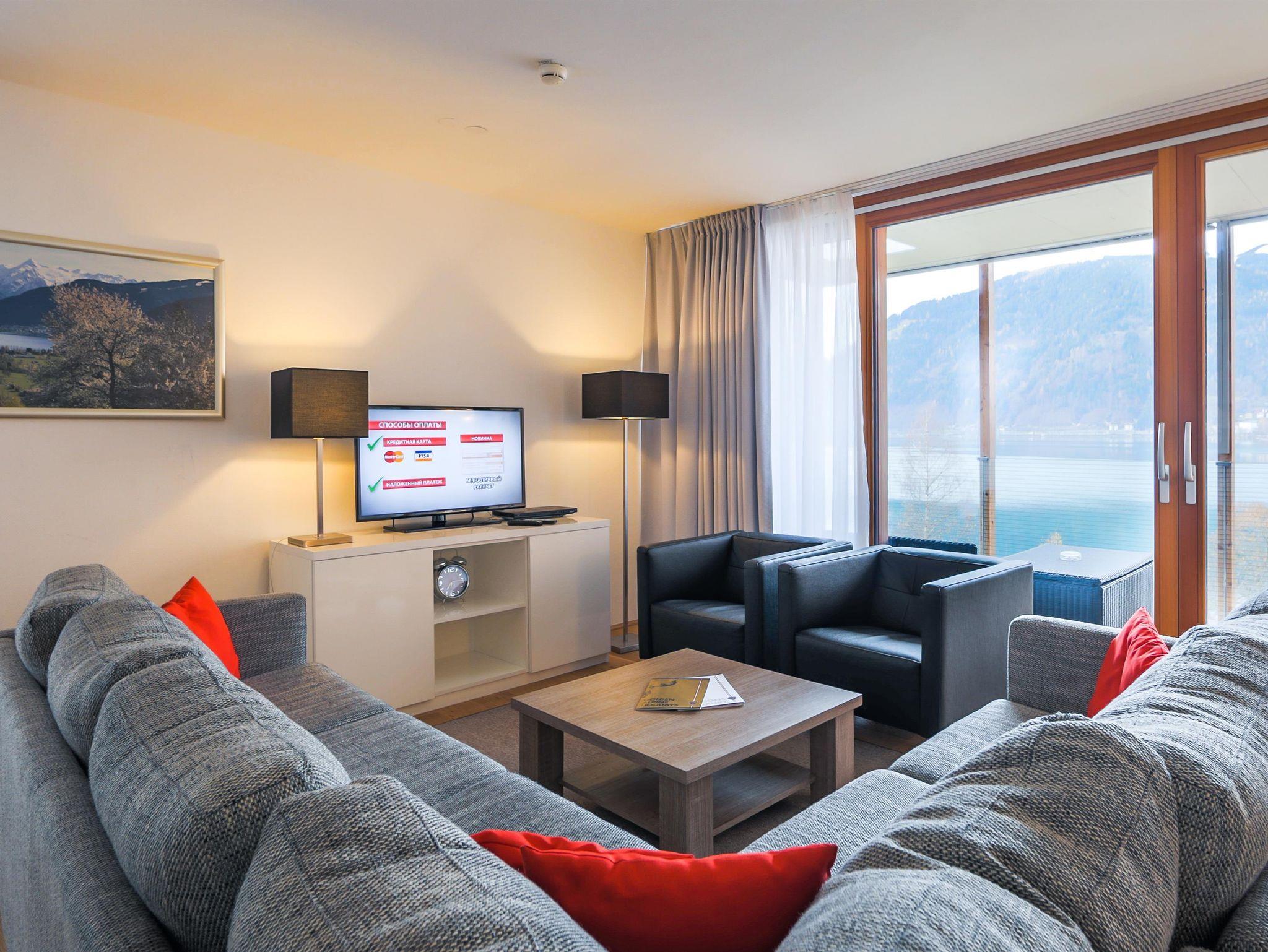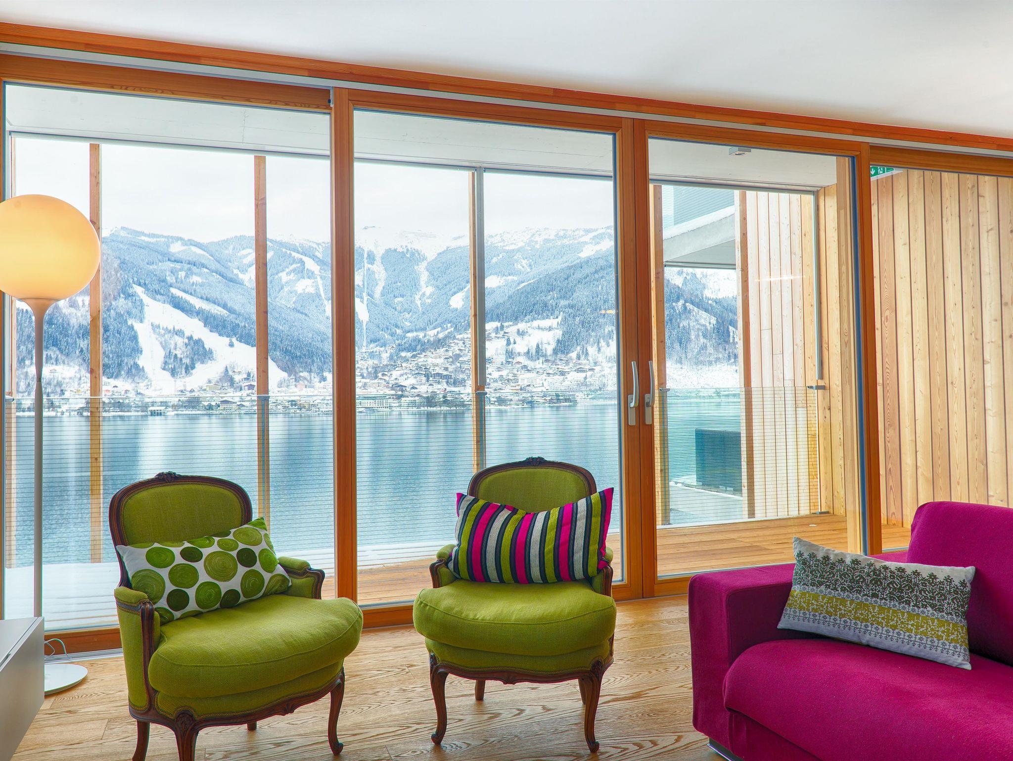 Erleben Sie das Bellevue-Gefühl: Die majestätische Schmittenhöhe umrahmt den klaren Zeller See direkt vor der Residenz. Entspannen Sie auf der eleganten Sonnenterrasse und genießen Sie den atemberaubenden Blick auf das Wasser und die umliegenden Berge.