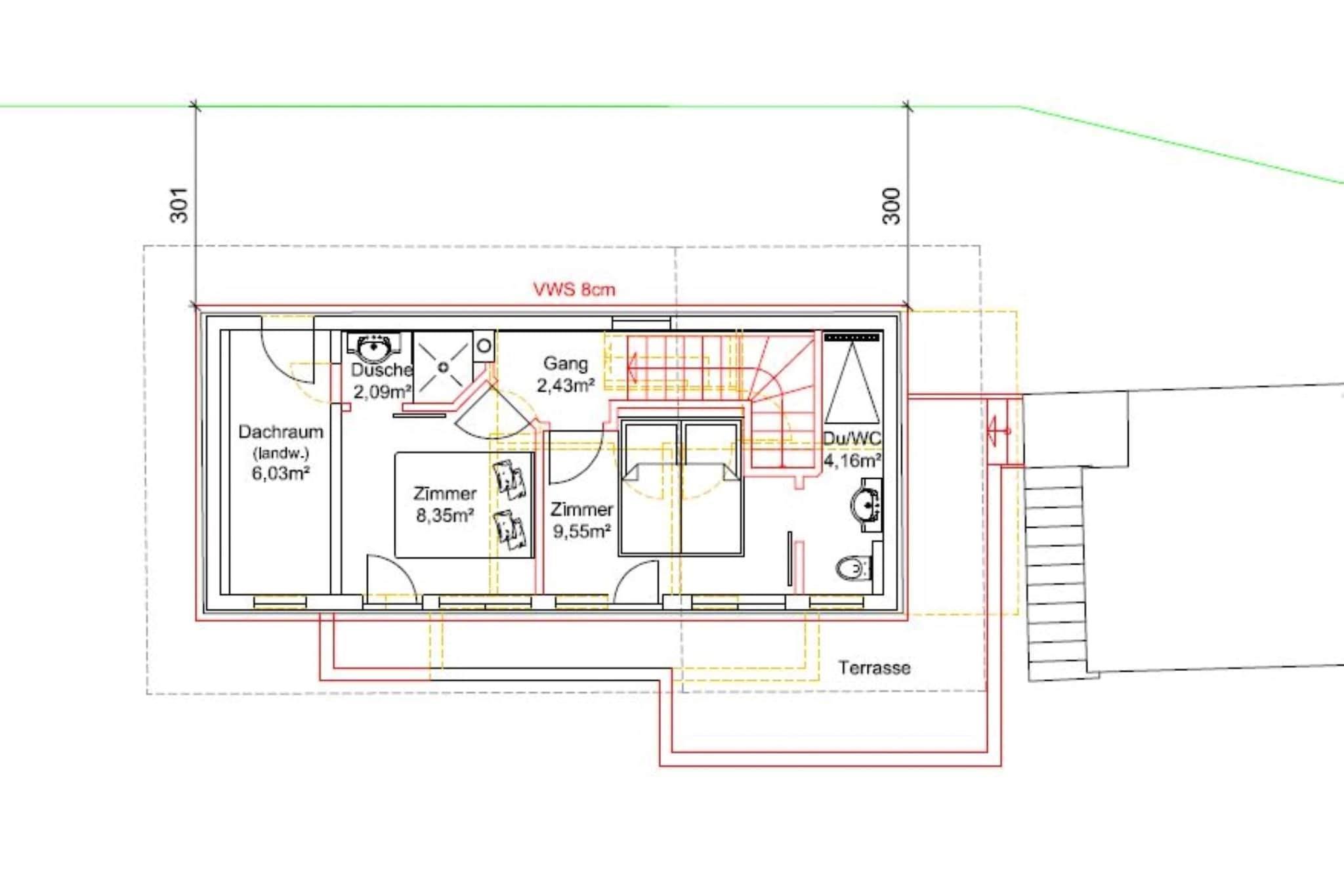 Parterre: (Wohnzimmer(TV, Sitzecke), offene Küche(Esstisch, Kochplatte(4 Kochplatten, Ceranfeld), Wasserkocher, Kaffeemaschine, Backofen, Spülmaschine, Kühlschrank(+ Gefrierfach)), Schlafzimmer mit Badezimmer(Doppelbett, Dusche, Waschbecken), Toilette, Terrasse) In der 1. Etage: (Schlafzimmer mit Badezimmer(Einzelbett, Einzelbett, Doppelbett, Dusche, Waschbecken), Schlafzimmer mit Badezimmer(Doppelbett, Dusche, Waschbecken), Balkon, Terrasse) Parkplatz