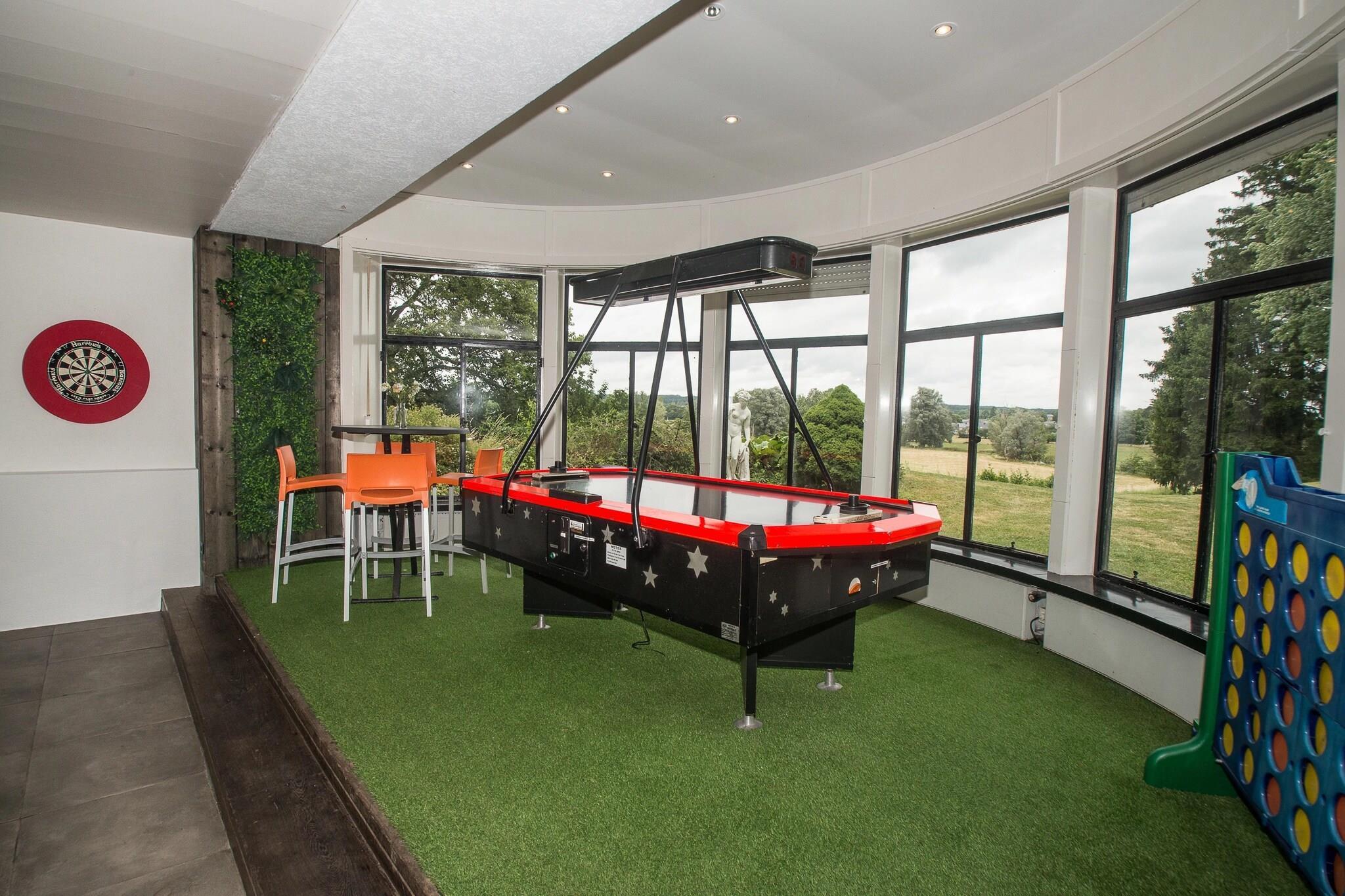 Diese großzügige Villa in Jamoigne ist ideal für große Familien oder Gruppen, die einen luxuriösen Rückzugsort in der belgischen Landschaft suchen. Mit 15 Schlafzimmern und mehreren Badezimmern auf drei Etagen bietet das Anwesen viel Platz und Privatsphäre. Gäste können in den Whirlpools im Innen- und Außenbereich entspannen, den privaten beheizten Pool genießen oder in der Sauna abschalten. Für Unterhaltung ist im Freizeitraum mit Billard, Tischfußball, Airhockey und einer Spielkonsole gesorgt. Die Villa verfügt über zwei voll ausgestattete Küchen, einen geräumigen Wohn-/Essbereich mit TV und einen eingezäunten Garten mit Teich, Trampolin, Rutsche und Spielgeräten. Ein Aufzug, Fitnessgeräte und eine Ladestation für Elektroautos sorgen für zusätzlichen Komfort. Mehrere Hochstühle und Kinderbetten machen die Villa familienfreundlich. Die Terrasse und der Grillplatz laden zu gemütlichen Treffen im Freien ein, und die kabellose Musikanlage sorgt für die richtige Stimmung für unvergessliche Abende. In der Nähe können Sie den malerischen Fluss Semois erkunden oder die historische Stadt Chiny besuchen. Die Grottes de Hotton und die Tramway Touristique de l'Aisne bieten kulturelle und naturkundliche Ausflüge an. Genießen Sie zum Essen belgische Küche im Au Moulin Gourmand, italienische Aromen in der Pizzeria La Mamma oder lokale Spezialitäten im Le Florentin in Florenville.