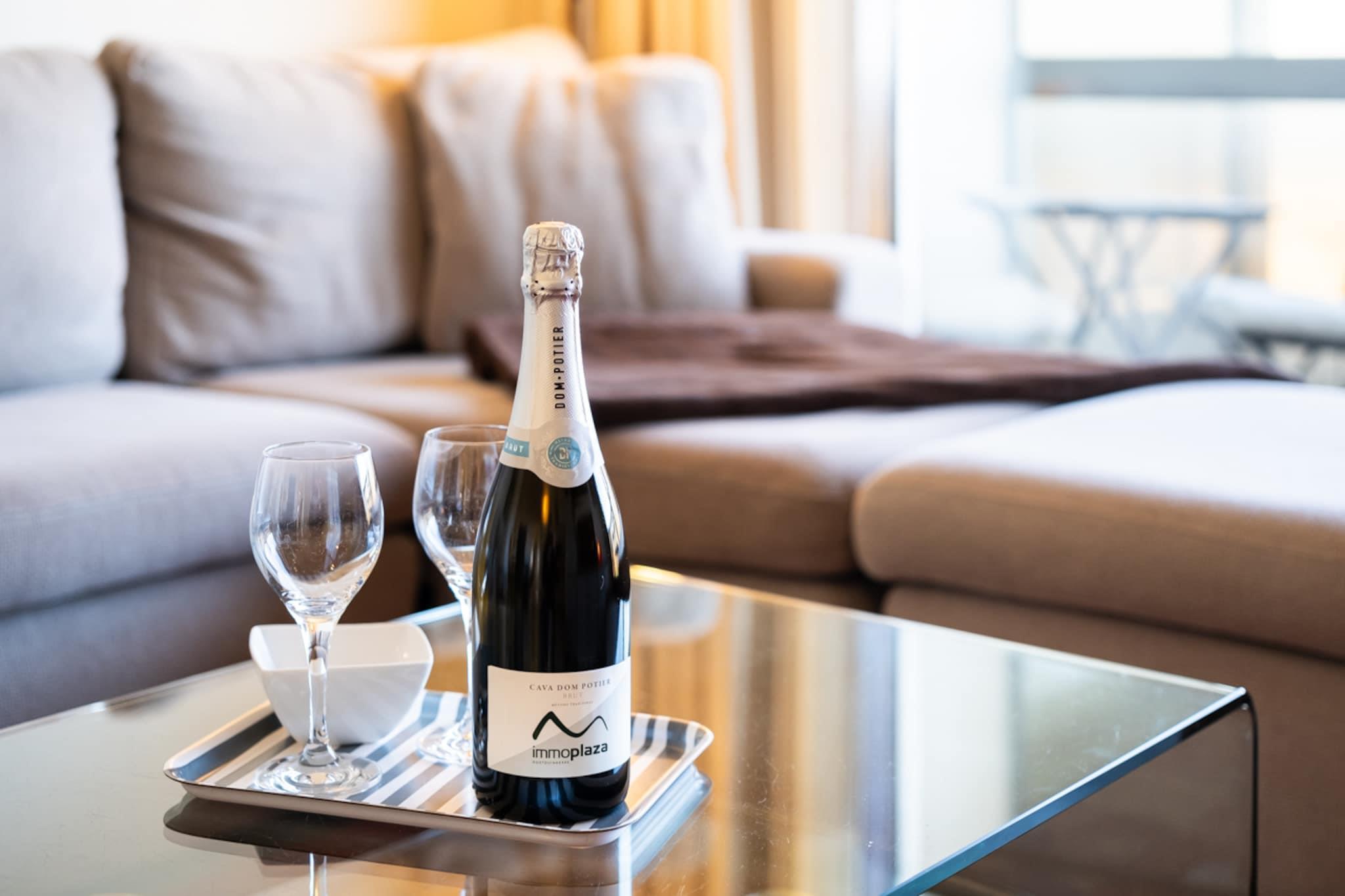 In der 2. Etage: (offene Küche(Kochplatte, Dunstabzugshaube, Kaffeemaschine, Backofen, Mikrowelle, Spülmaschine), Wohn/Esszimmer(TV(Flatscreen, digital), Esstisch, Sitzecke, Balkon), Schlafzimmer(Doppelbett(Doppelbettdecke, 160 x 200 cm), Balkon), Schlafzimmer(Etagenbett(Bettdecke), Etagenbett(Bettdecke), Balkon), Badezimmer(Dusche, Waschbecken, Waschbecken, Toilette)) Heizung(elektrisch), Parkplatz, Aufzug