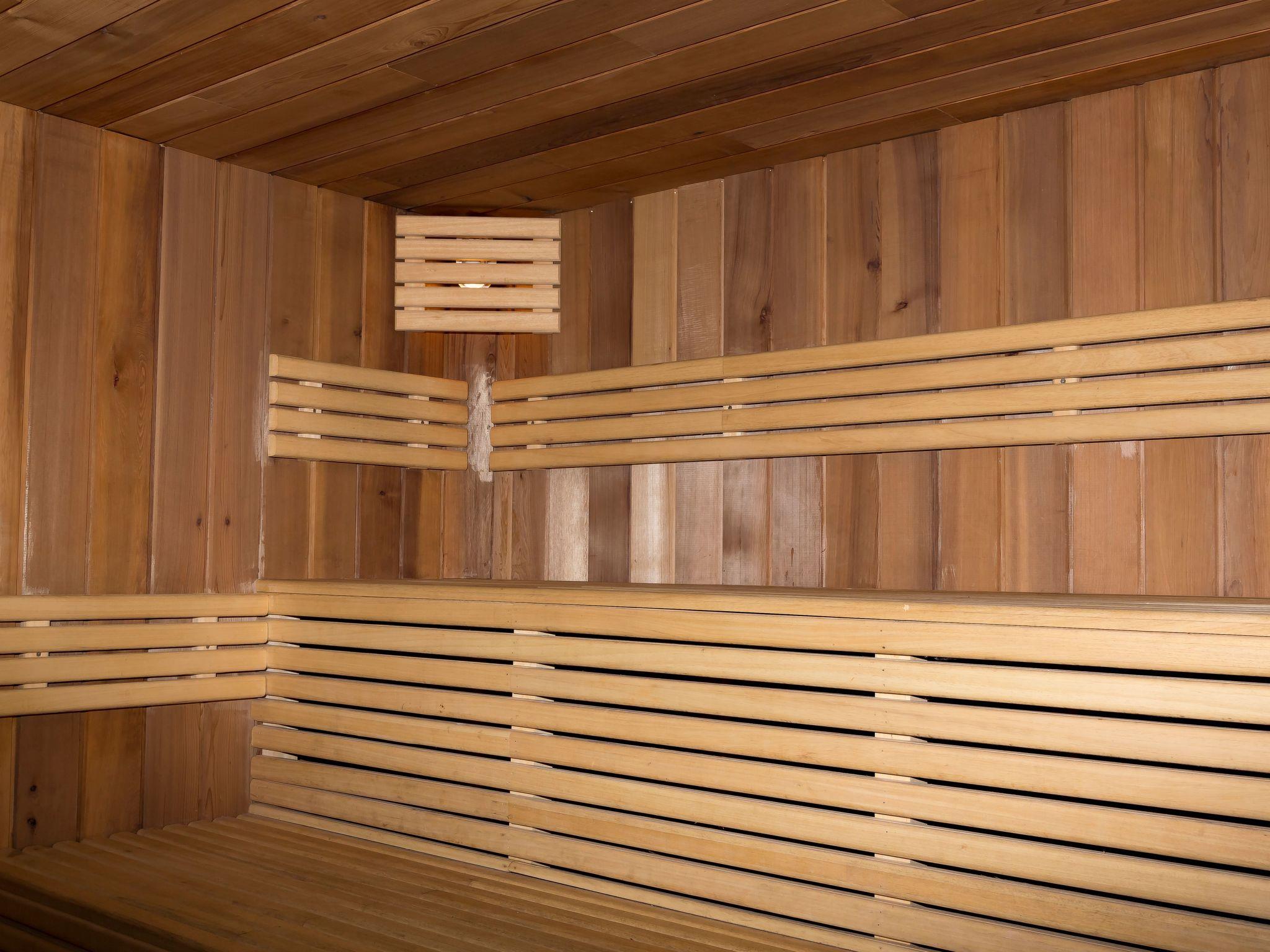 Im Untergeschoss befindet sich ein Wellnessbereich mit einem beheizten Innenpool und einer Sauna. Durch die großen Fenstertüren gelangen Sie direkt auf die Terrasse oder Sie können sich in der Lounge der Bar entspannen.