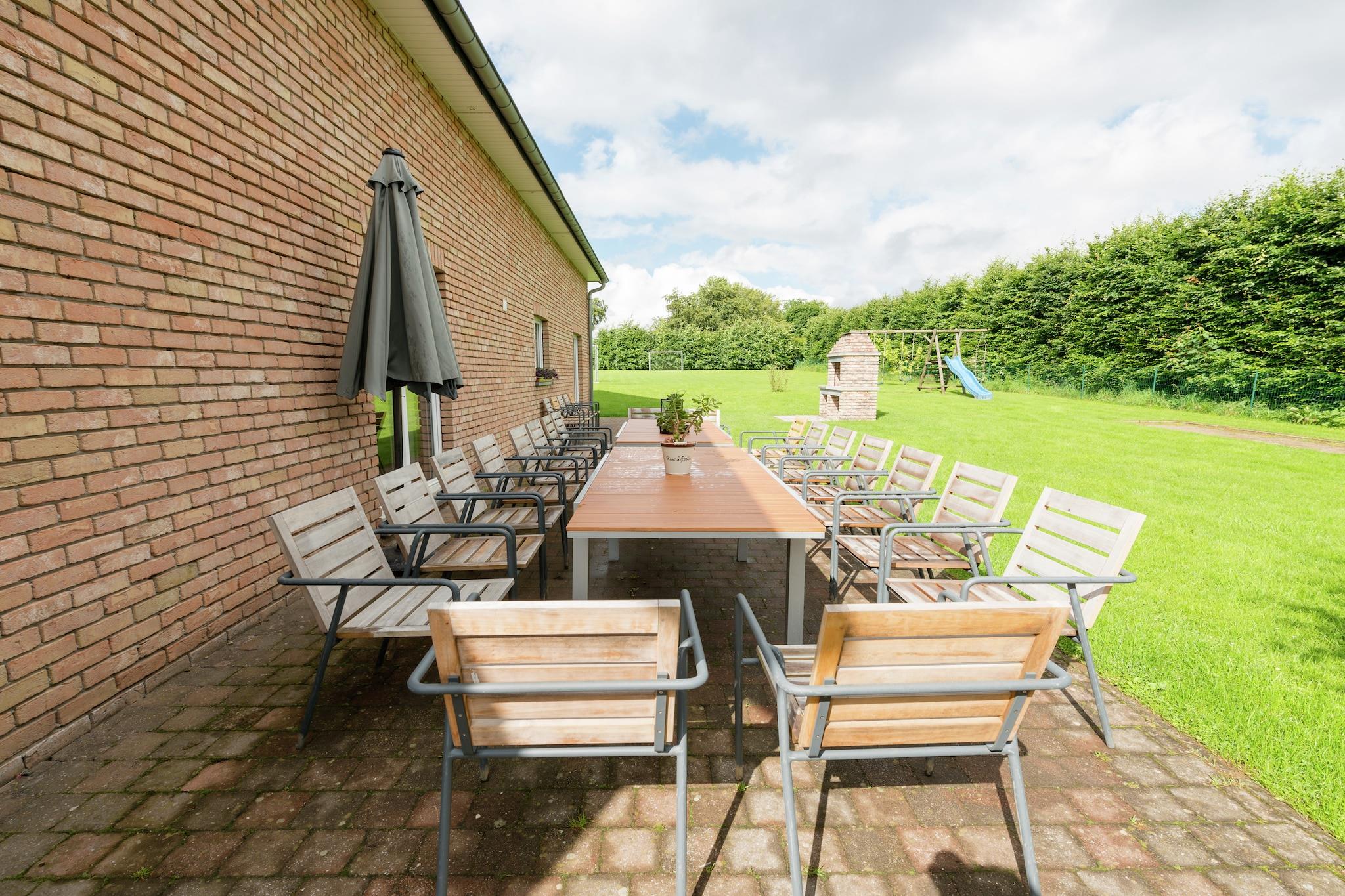 Parterre: (Wohnzimmer(TV, Kaminofen, DVD-Spieler, CD-Spieler, Stereoanlage, Tischfußball), Esszimmer, offene Küche(Backofen, Mikrowelle, 2x Spülmaschine), Schlafzimmer(Doppelbett, 2x Kühl-/Gefrierkombination), Badezimmer(Dusche, Toilette), Toilette) In der 1. Etage: (Schlafzimmer(2x Etagenbett, Waschbecken), Schlafzimmer(3x Etagenbett, Waschbecken), Schlafzimmer mit Badezimmer(Doppelbett, Dusche, Waschbecken, Toilette), Schlafzimmer mit Badezimmer(Etagenbett, Dusche, Waschbecken, Toilette), Schlafzimmer mit Badezimmer(Doppelbett, Dusche, Waschbecken, Toilette), Schlafzimmer mit Badezimmer(Doppelbett, Dusche, Waschbecken, Toilette), Badezimmer(2x Dusche, Waschbecken), Toilette, Ruheraum(Dusche, Sauna), Türkisches Dampfbad) In der 2. Etage: (Schlafzimmer(2x Einzelbett, Waschbecken), Schlafzimmer(2x Einzelbett, Waschbecken), Freizeitraum(TV, DVD-Spieler, Heizung(Zentral))) Garten(umzäunt), Gartenmöbel, Grill, Boulebahn, Spielgeräte, 3x Kinderbett, 2x Hochstuhl