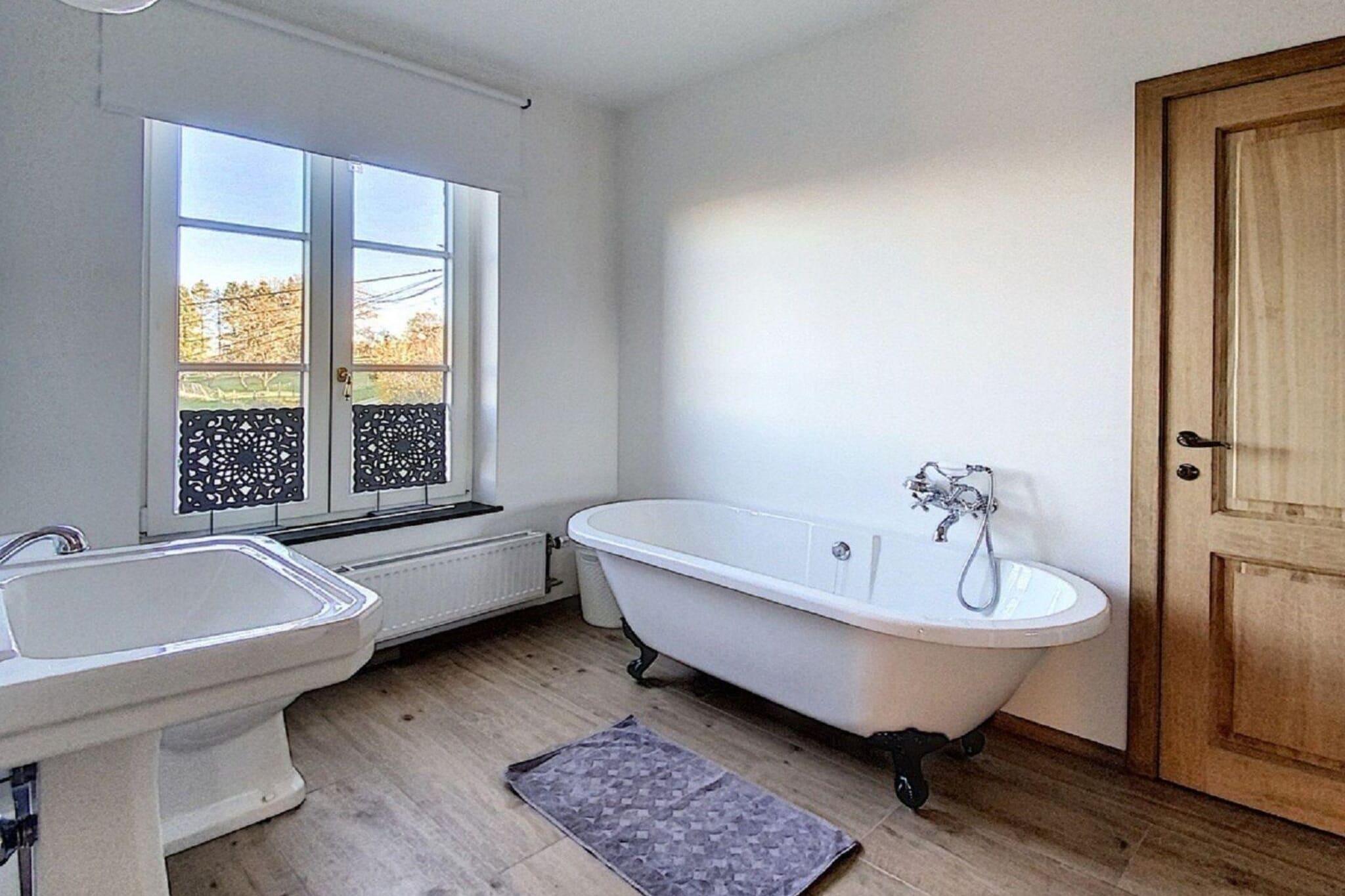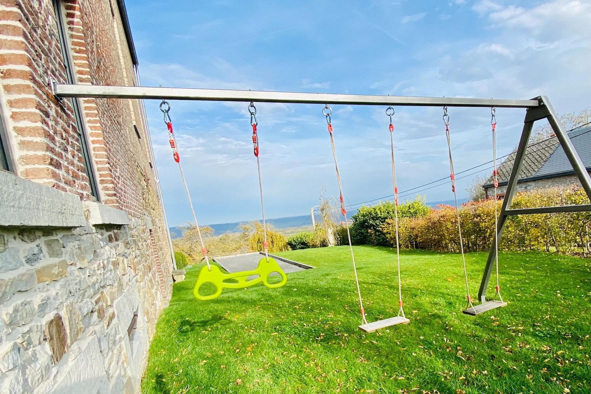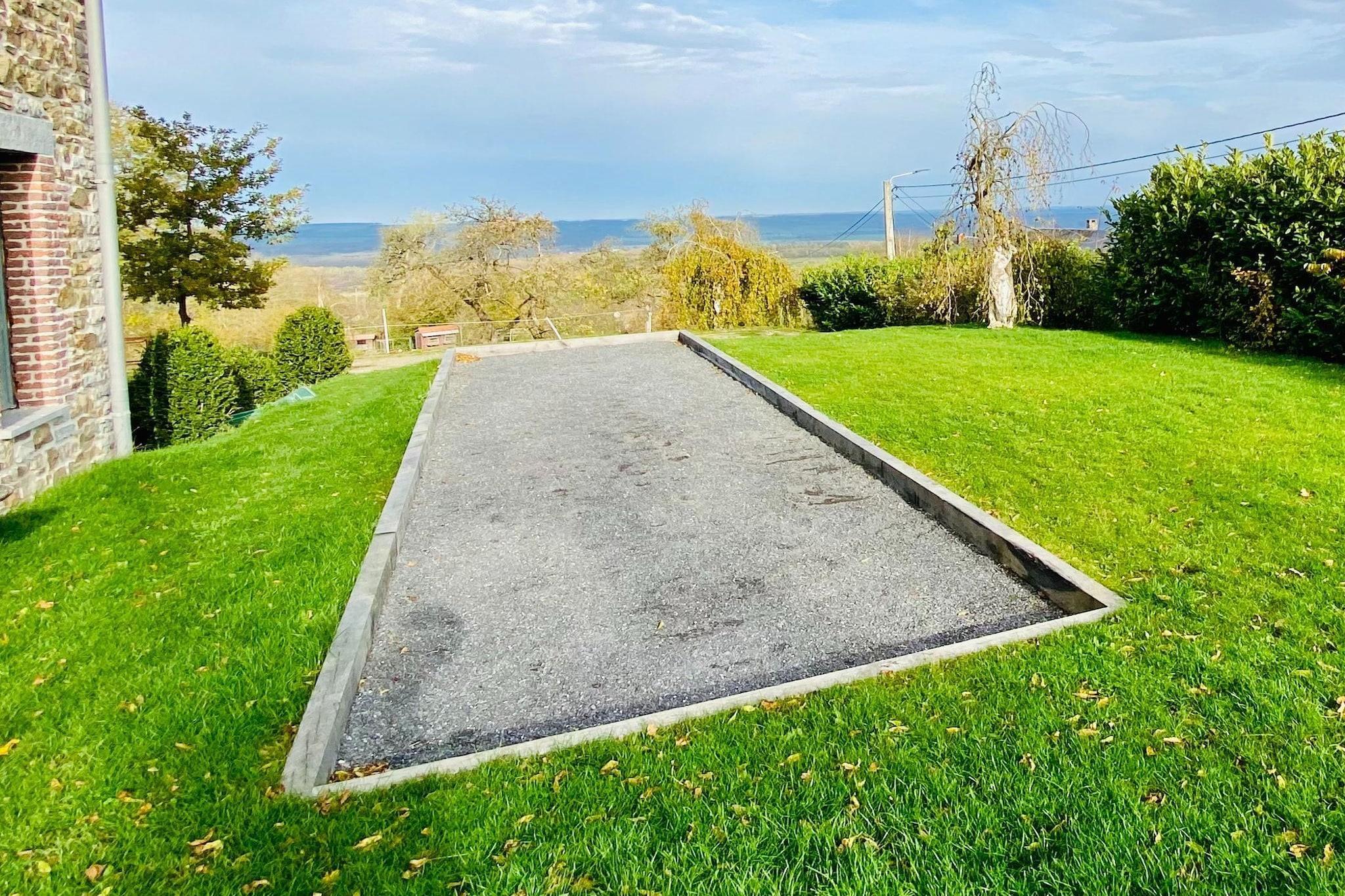 Abseits der Landstraße und oberhalb des Dorfes gelegen, bietet dieses geräumige Herrenhaus für 14 Gäste einen atemberaubenden Blick über das Tal und eine ruhige Umgebung zum Entspannen. Mit fünf wunderschön eingerichteten Schlafzimmern, einer überdachten Terrasse und einem üppigen Garten ist es der perfekte Rückzugsort für Familien oder Gruppen, die Komfort und Naturverbundenheit suchen. Dank der günstigen Lage in der Nähe von Restaurants und dem öffentlichen Schwimmbad von Givet erreichen Sie auch kulturelle Highlights bequem. Erkunden Sie nach einer kurzen Autofahrt das Heiligtum Unserer Lieben Frau von Beauraing, spazieren Sie durch den malerischen Schlosspark oder besuchen Sie die Zitadelle von Dinant und das märchenhafte Schloss Vêves, beide weniger als eine Stunde entfernt. Im Inneren besticht das Haus durch geschmackvolle Möbel, hohe Decken und ein einladendes Wohnzimmer mit Billardtisch, Kamin und Bar – ideal für gemütliche Abende. Die voll ausgestattete Küche verfügt über eine großzügige Arbeitsfläche für gemeinsame Mahlzeiten, während jedes Schlafzimmer über ein eigenes Bad mit ebenerdiger Dusche oder Badewanne und hochwertiger Bettwäsche verfügt. Im Freien können sich die Kinder auf der Schaukel, dem Bouleplatz und den Spielgeräten vergnügen, während die Erwachsenen auf den Sonnenliegen entspannen oder sich im Essbereich im Garten zu Mahlzeiten unter den Sternen versammeln.