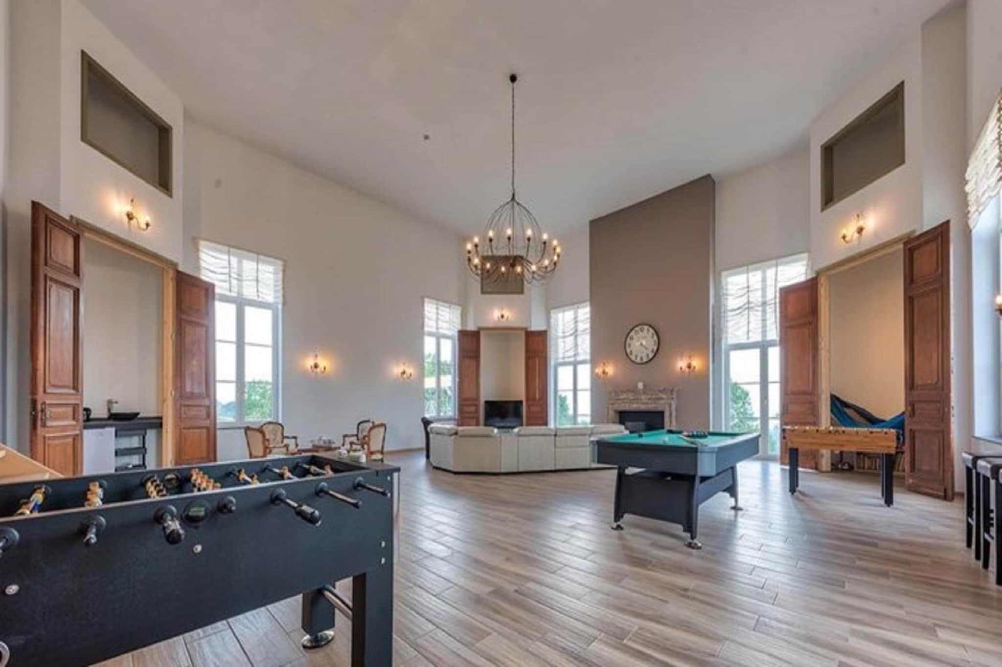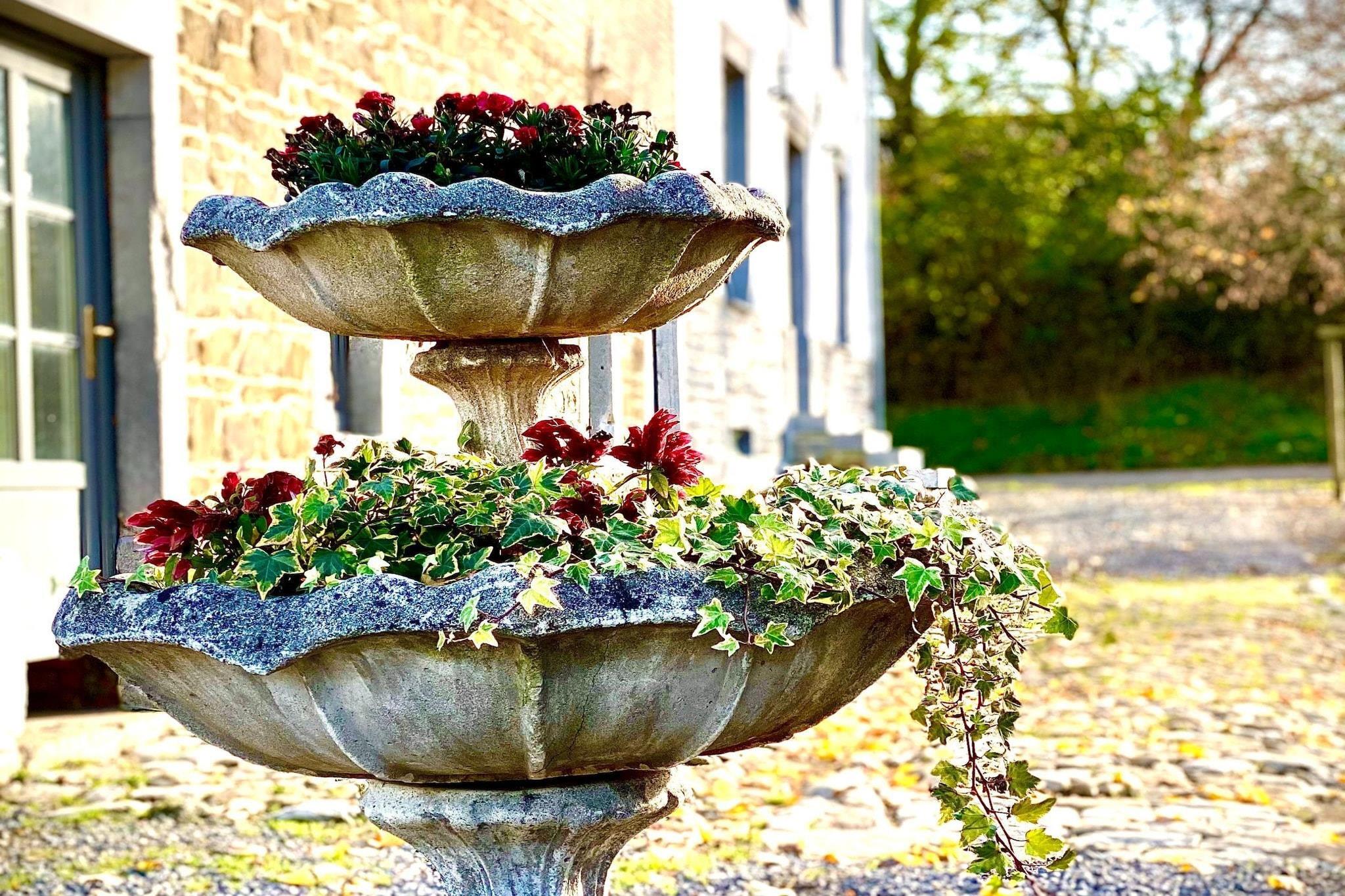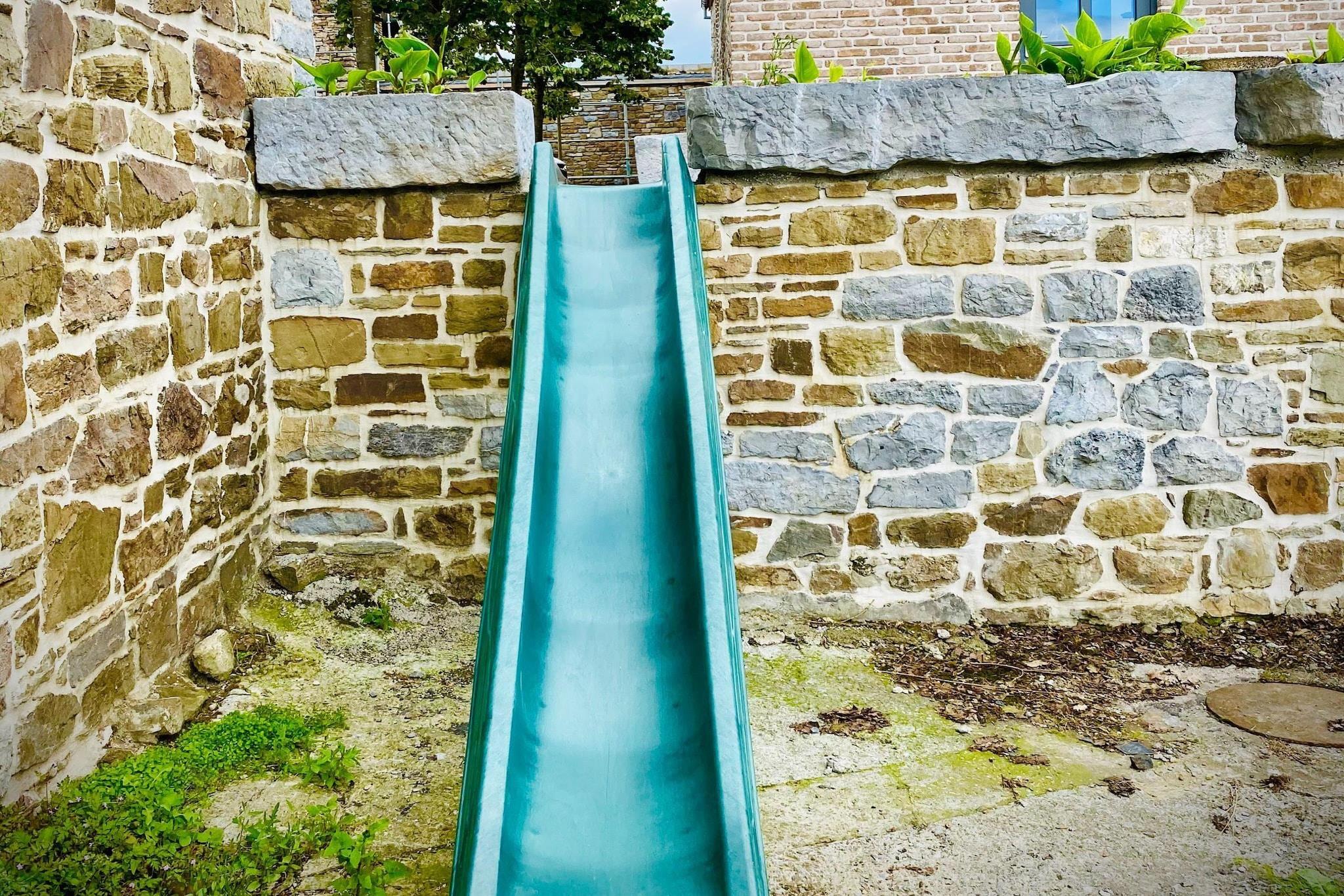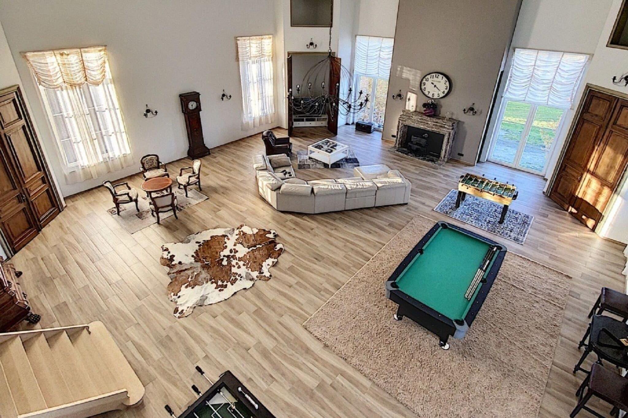 Abseits der Landstraße und oberhalb des Dorfes gelegen, bietet dieses geräumige Herrenhaus für 14 Gäste einen atemberaubenden Blick über das Tal und eine ruhige Umgebung zum Entspannen. Mit fünf wunderschön eingerichteten Schlafzimmern, einer überdachten Terrasse und einem üppigen Garten ist es der perfekte Rückzugsort für Familien oder Gruppen, die Komfort und Naturverbundenheit suchen. Dank der günstigen Lage in der Nähe von Restaurants und dem öffentlichen Schwimmbad von Givet erreichen Sie auch kulturelle Highlights bequem. Erkunden Sie nach einer kurzen Autofahrt das Heiligtum Unserer Lieben Frau von Beauraing, spazieren Sie durch den malerischen Schlosspark oder besuchen Sie die Zitadelle von Dinant und das märchenhafte Schloss Vêves, beide weniger als eine Stunde entfernt. Im Inneren besticht das Haus durch geschmackvolle Möbel, hohe Decken und ein einladendes Wohnzimmer mit Billardtisch, Kamin und Bar – ideal für gemütliche Abende. Die voll ausgestattete Küche verfügt über eine großzügige Arbeitsfläche für gemeinsame Mahlzeiten, während jedes Schlafzimmer über ein eigenes Bad mit ebenerdiger Dusche oder Badewanne und hochwertiger Bettwäsche verfügt. Im Freien können sich die Kinder auf der Schaukel, dem Bouleplatz und den Spielgeräten vergnügen, während die Erwachsenen auf den Sonnenliegen entspannen oder sich im Essbereich im Garten zu Mahlzeiten unter den Sternen versammeln.