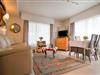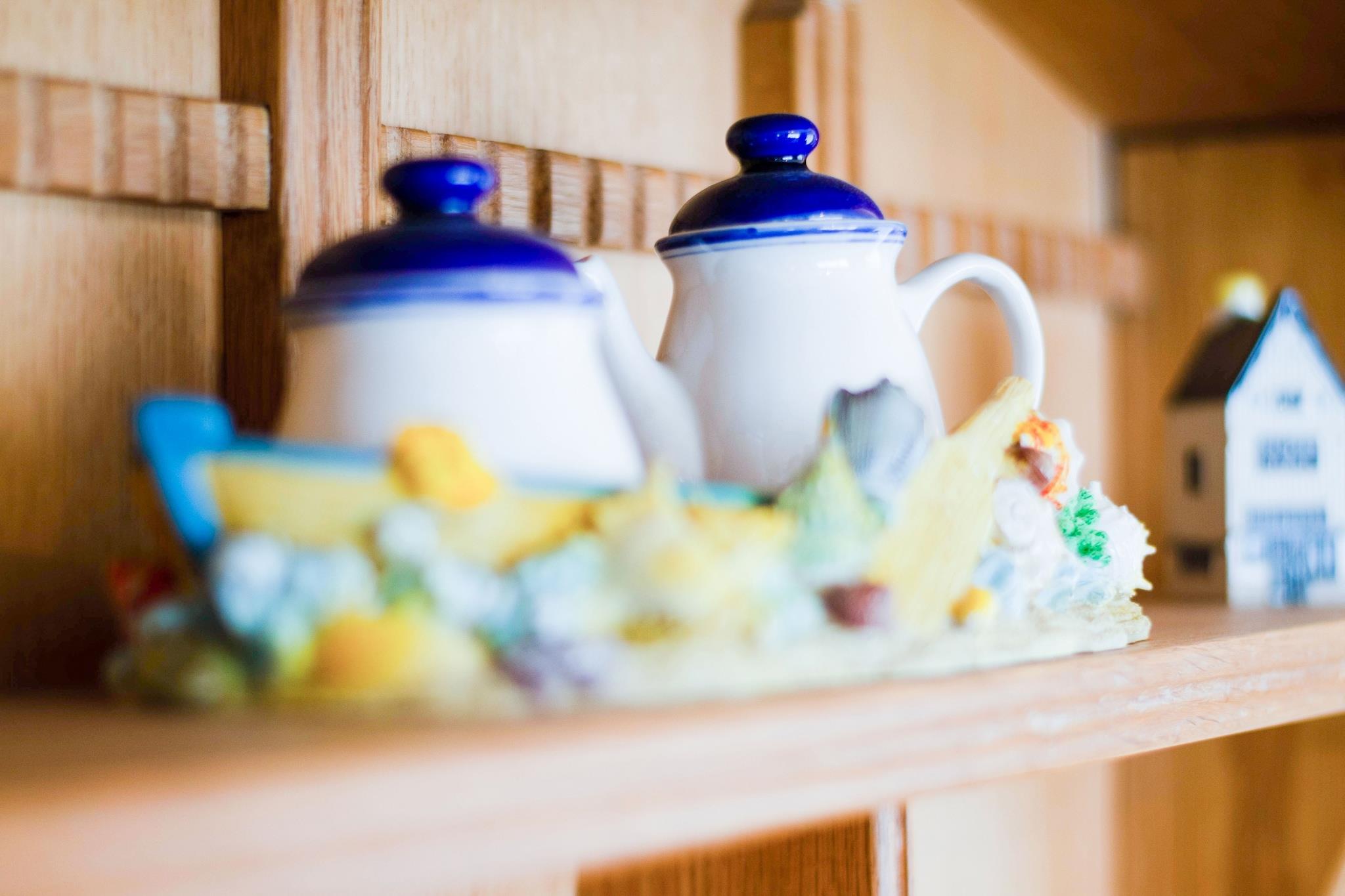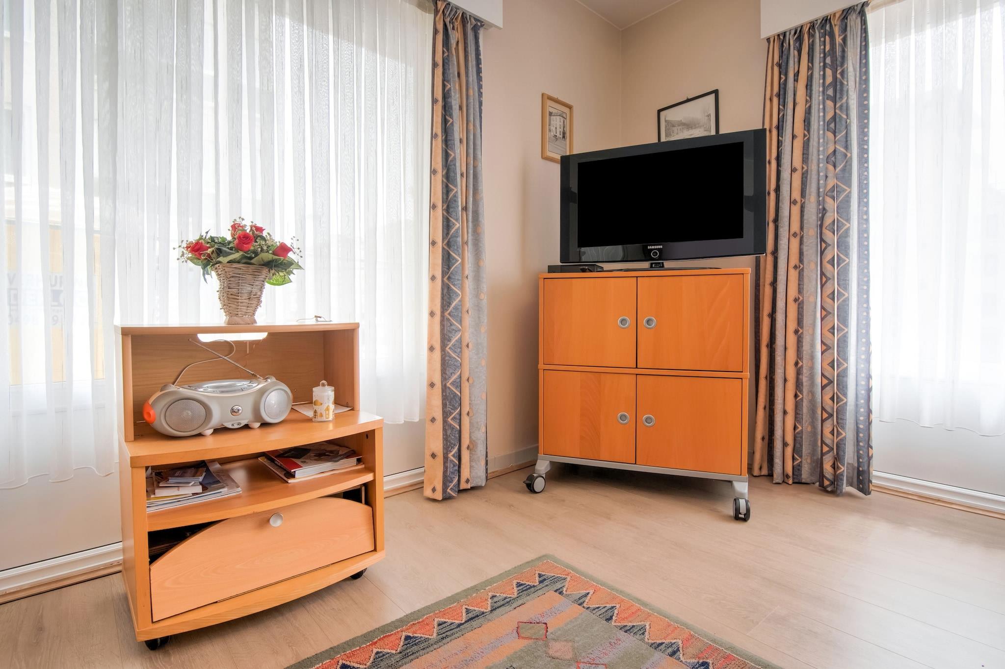 Parterre: (Diele, Wohnzimmer(TV, Esstisch, Sitzecke, Radio), Küche(Kochherd, Kaffeemaschine, Mikrowelle, Kühl-/Gefrierkombination), Schlafzimmer mit Badezimmer(Doppelbett, Dusche, Waschbecken, Toilette, Kinderbett, Kinderbett))
