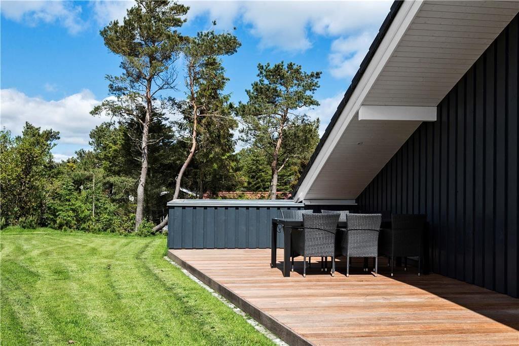 Erholsam geht es für Sie sicherlich auch auf der großen Terrasse zu, die sich um drei Seiten des Ferienhauses schmiegt. Lehnen Sie sich entspannt zurück, lassen Sie die Ruhe auf sich herabsinken und genießen Sie den ungestörten Ausblick in die Natur. Die einzige Überlegung mit der Sie sich auseinandersetzen müssen ist die Frage, ob Sie lieber in der vollen Sonne auf der Südterrasse entspannen oder sich doch eher auf einen Schattenplatz unter der Terrassenüberdachung zurückziehen.