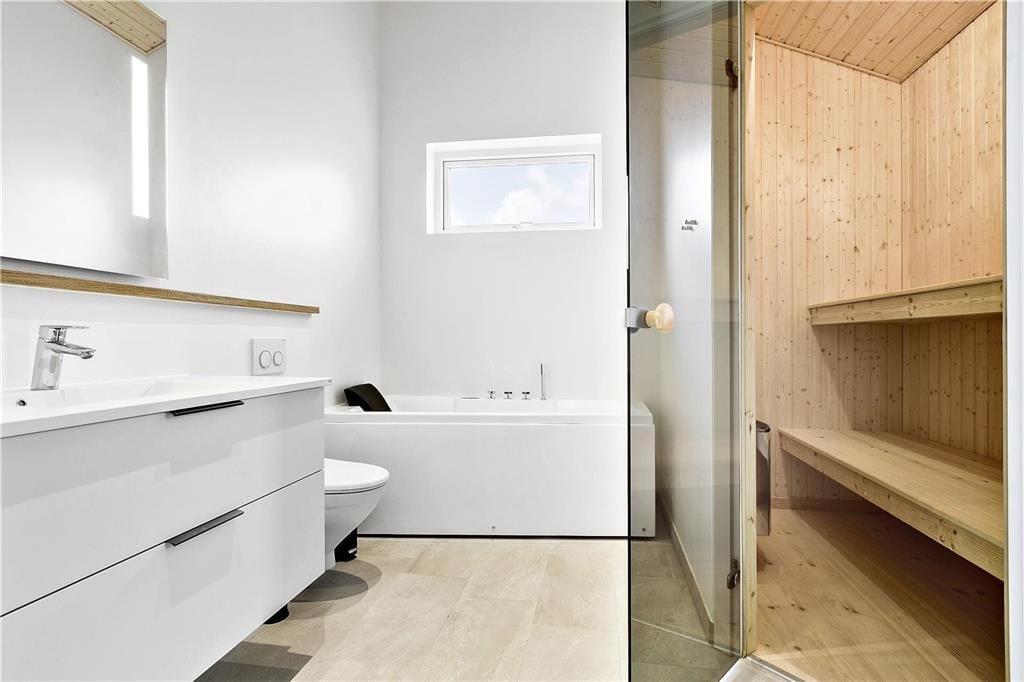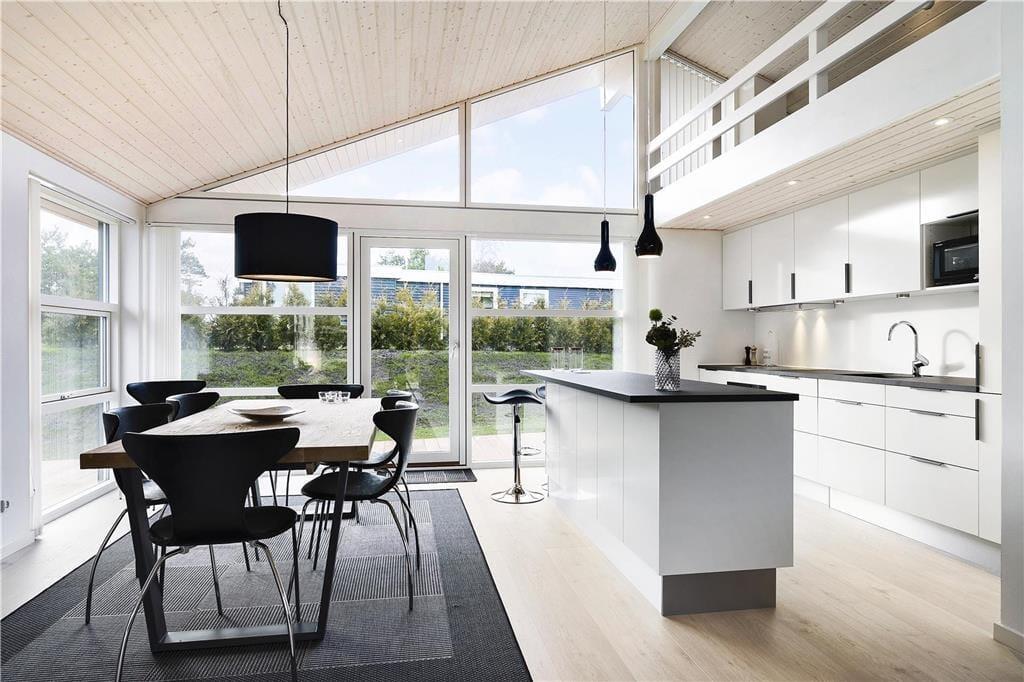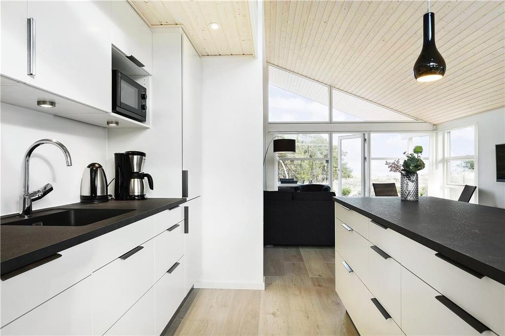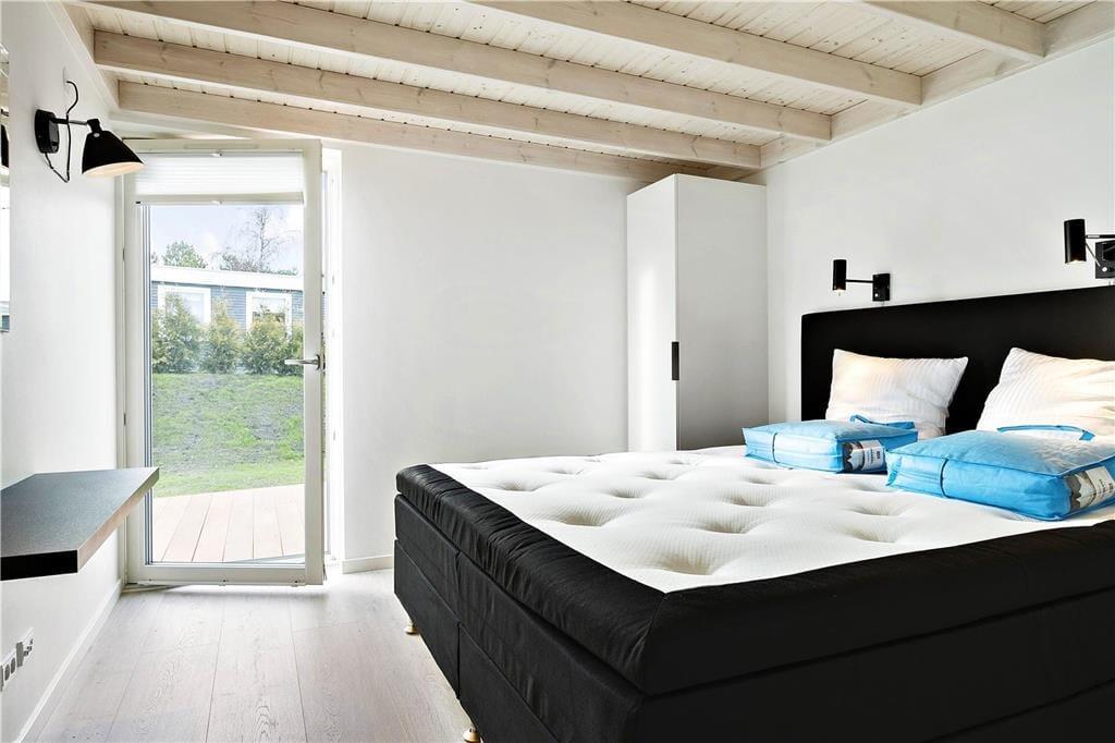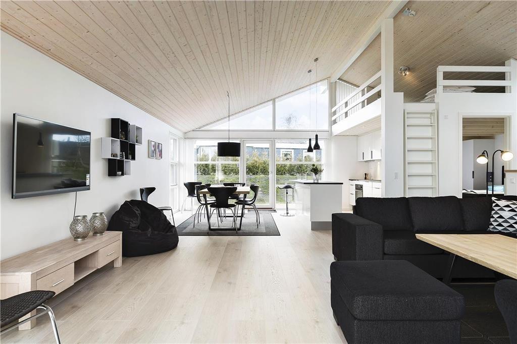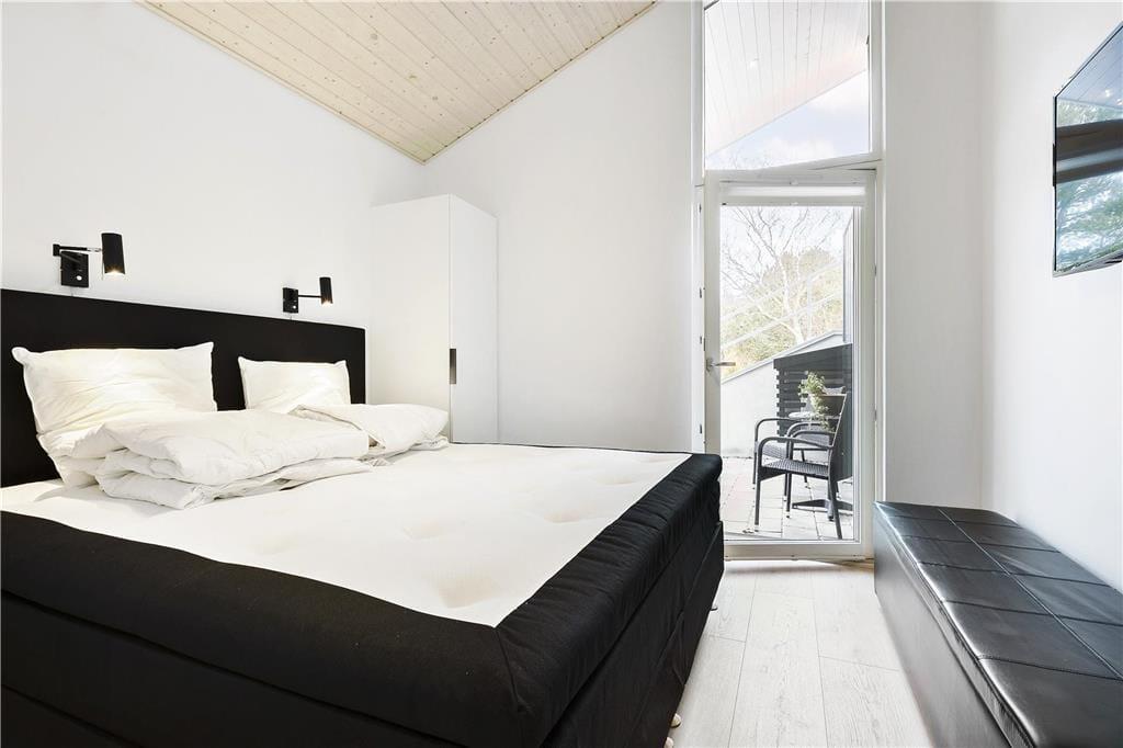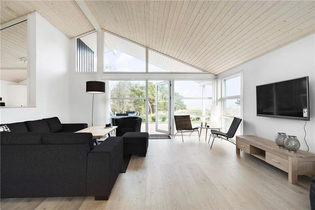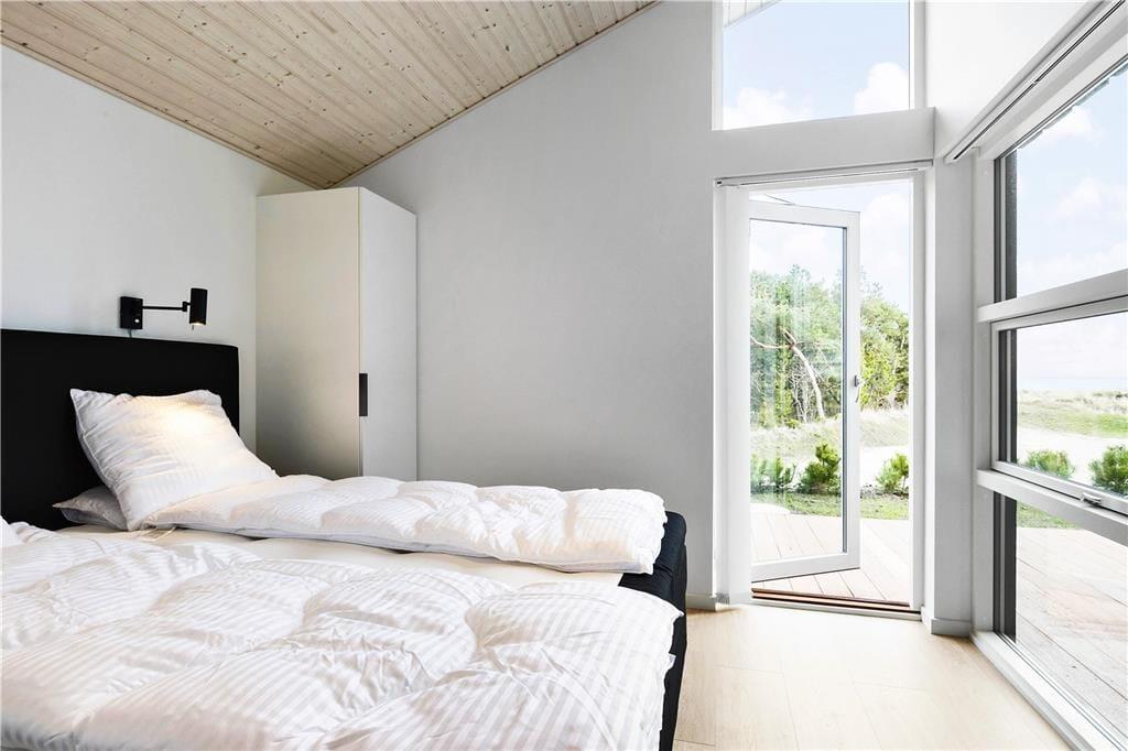 Dieses im Jahr 2018 erbaute Urlaubsdomizil empfängt Sie mit einer wohldurchdachten 118 m² umfassenden Wohnfläche, die sich über zwei Ebenen erstreckt. Hinzu gesellt sich, ganz oben in der Spitze des Hauses, ein eingezogener Hängeboden, der als zusätzlicher, gemütlicher Rückzugsort dient. Der gesamte Innenraum besticht mit einer geschmackvollen, schlichten Möblierung, die einen schönen, dunklen Kontrast zu den ansonsten hellen Farbauswahl bildet. Die hohen Decken unterstreichen sehr schön das helle und luftige Wohnambiente. Dank der großen Glaspartien eröffnet sich Ihnen ein herrlicher Ausblick auf das Meer, den Himmel und die Natur. Neben einem überaus angenehmen Ambiente, dürfen Sie sich auf zahlreiche schöne und komfortable Details freuen. So sind beispielsweise die drei vorhandenen Schlafräume allesamt mit großen Doppelbetten und guten Boxmatratzen ausgestattet und im Wohnbereich sorgt ein Smart-TV für Unterhaltung. Die in den Wohnraum integrierte Küchenabteilung wird mit ihrer guten Ausstattung selbst anspruchsvollste Hobbyköche begeistern. Eines der beiden Badezimmer verleiht dem Mietobjekt mit seinem Whirlpool und der Sauna einen Hauch von Wellnessflair und verspricht Ihnen unvergessliche Momente voller Erholung und Entspannung.