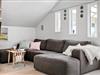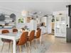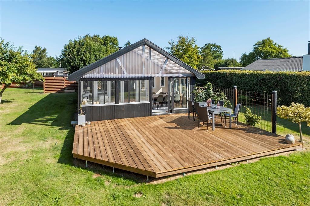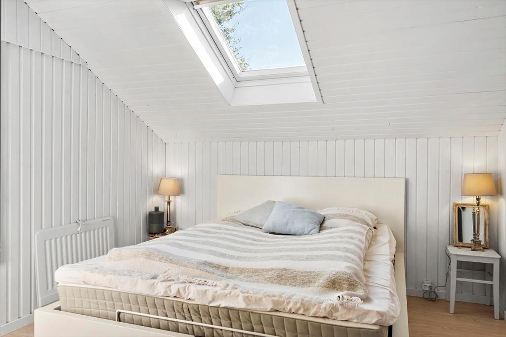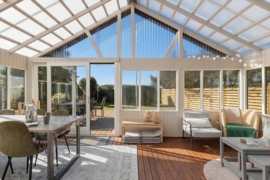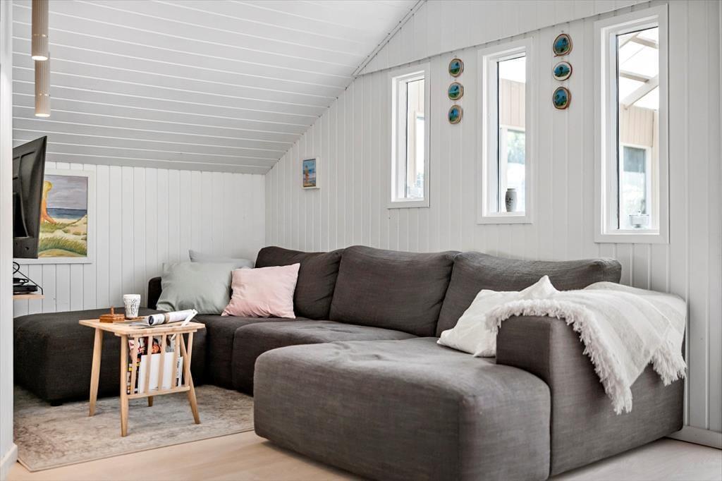 Das Ferienhaus ist ein klassisches dänisches Sommerhaus mit einer schwarz gestrichenen Holzfassade und weißen Fensterrahmen, und die charmante Atmosphäre setzt sich fort, wenn Sie eintreten. Es gibt ein herrliches Licht von den vielen Fensterpartien, und die weiß gestrichenen Wände und Decken tragen zur hellen und freundlichen Stimmung bei. Die Küche ist in den offenen Wohnbereich integriert, sodass Sie problemlos kochen können und dennoch an den Gesprächen am Tisch teilnehmen können. Das gemütliche Beisammensein kann auch in den angrenzenden Wintergarten verlegt werden, wo das Licht noch großzügiger ist – und von hier aus können Sie übrigens direkt in den Garten gehen. Das Haus enthält außerdem zwei Schlafzimmer und ein Badezimmer.