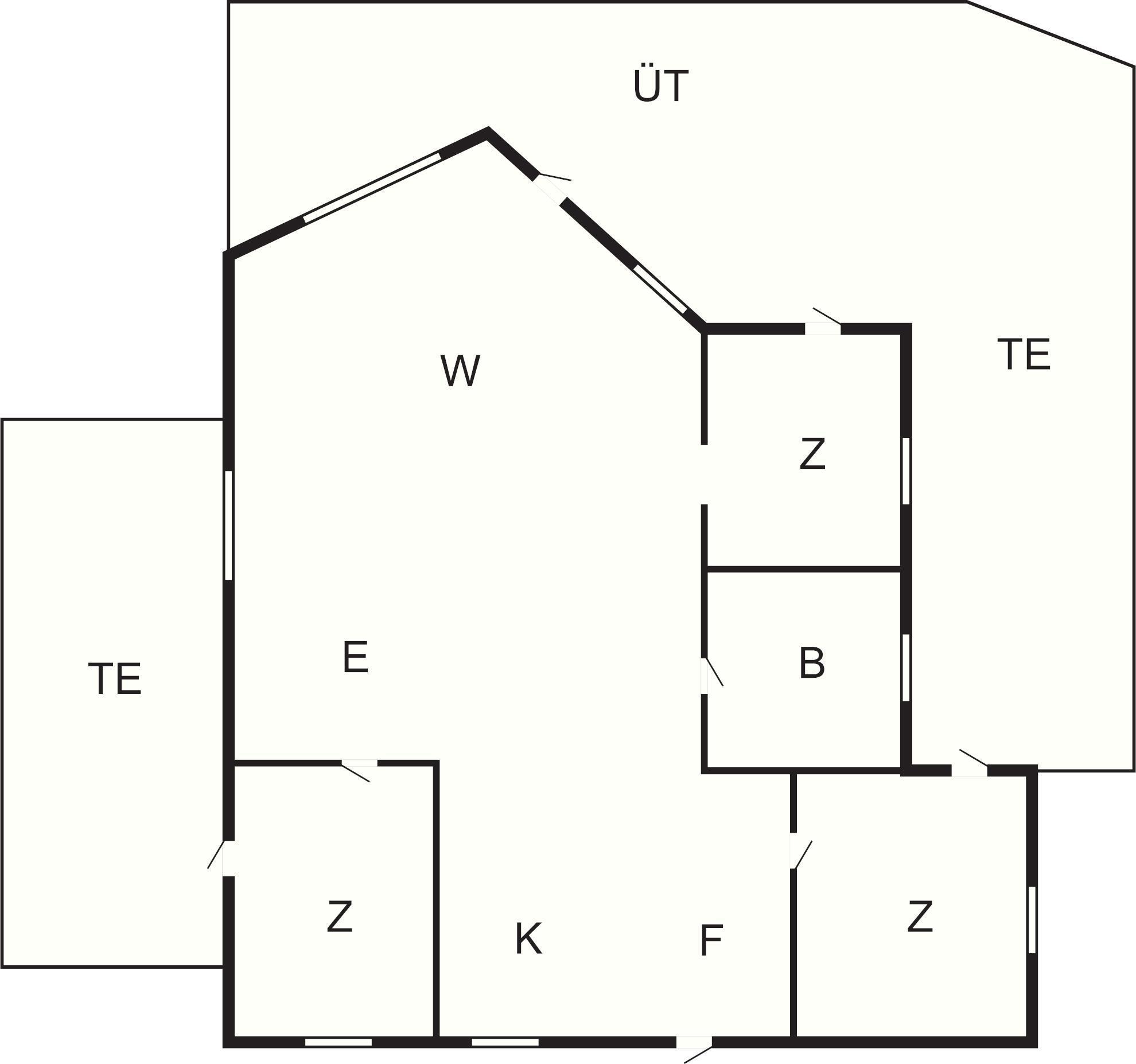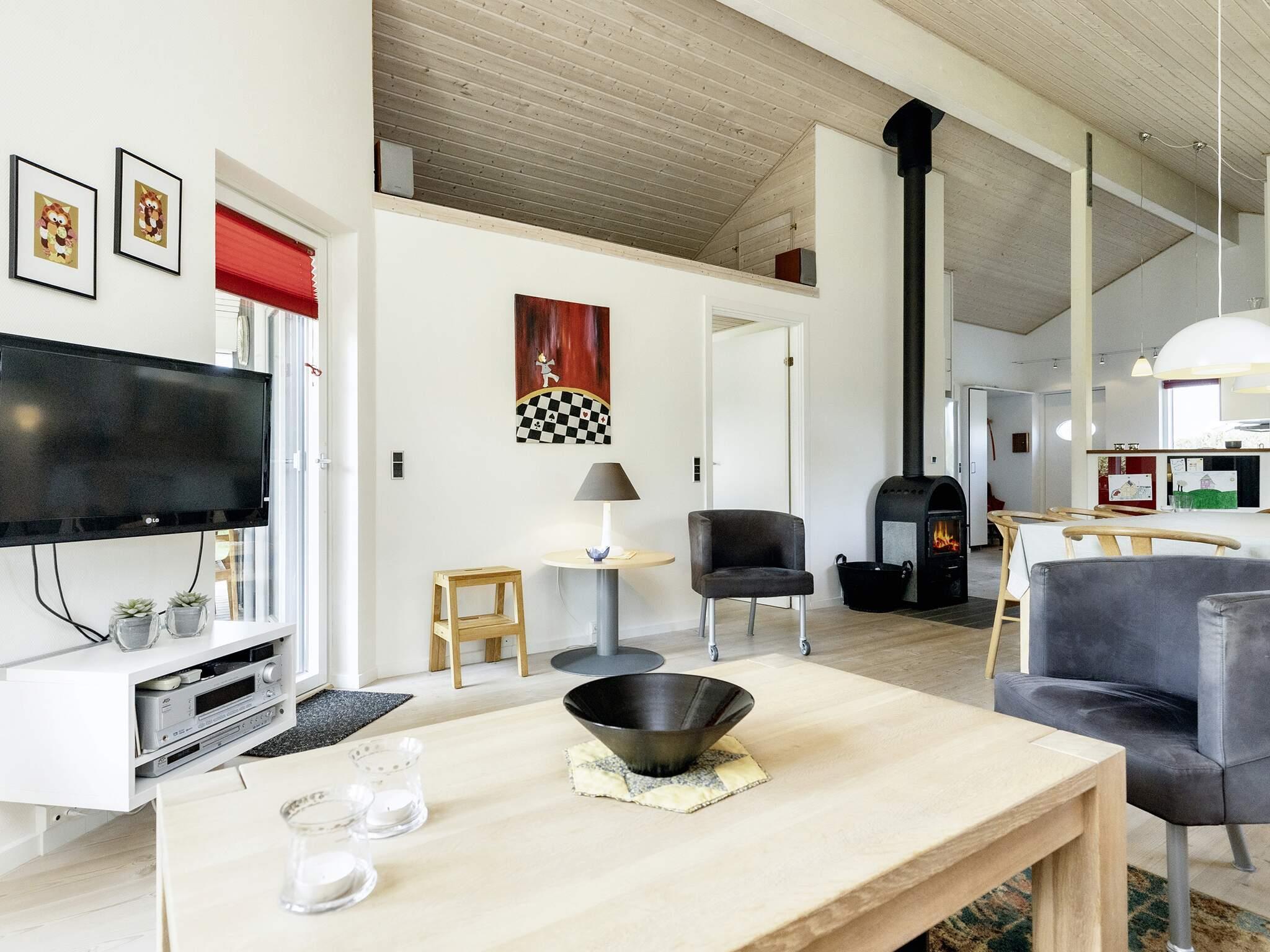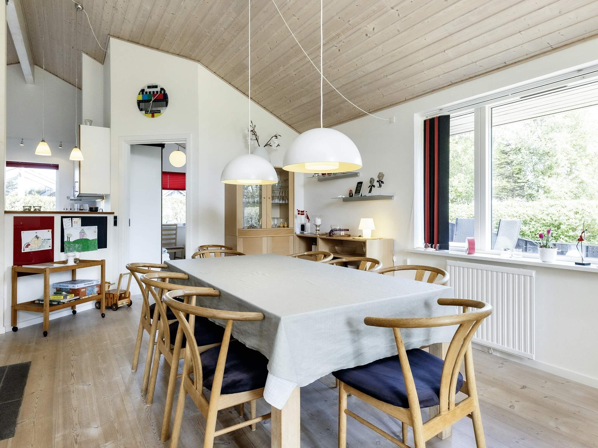 Ferienhaus in einem ruhigen Ferienhausgebiet gelegen, nur wenige Gehminuten vom Strand, dem Hafen und dem Ort Øster Hurup entfernt. Innen helles, geräumiges Wohnzimmer mit Holzofen und Essbereich, der in Verbindung zur offenen Küche steht. Im Wohnzimmer gibt es große Fensterflächen Richtung Garten sowie Zugang zu einer teilweise überdachten Terrassenfläche.