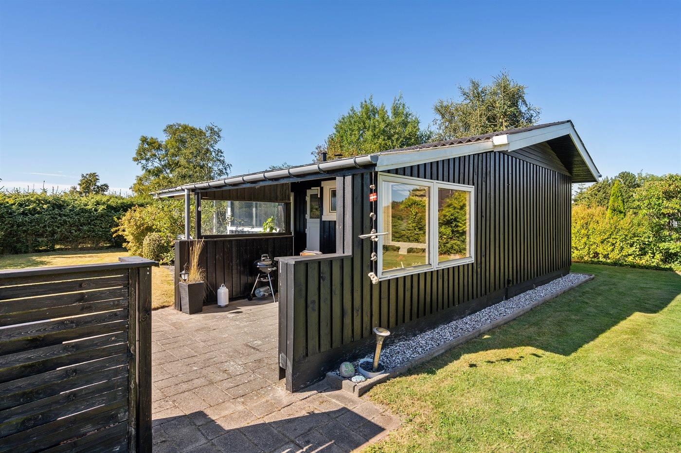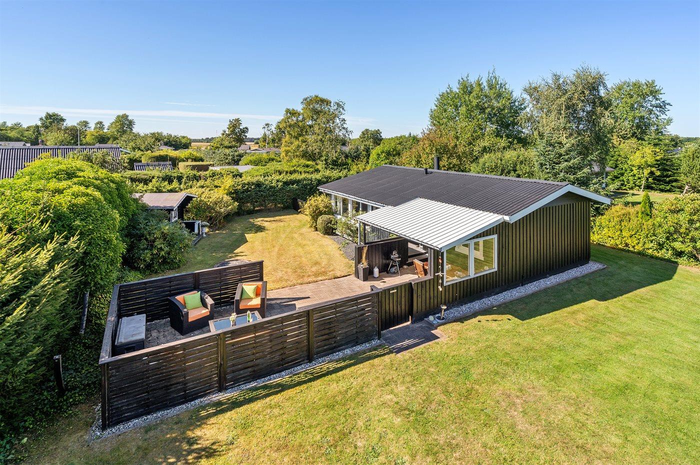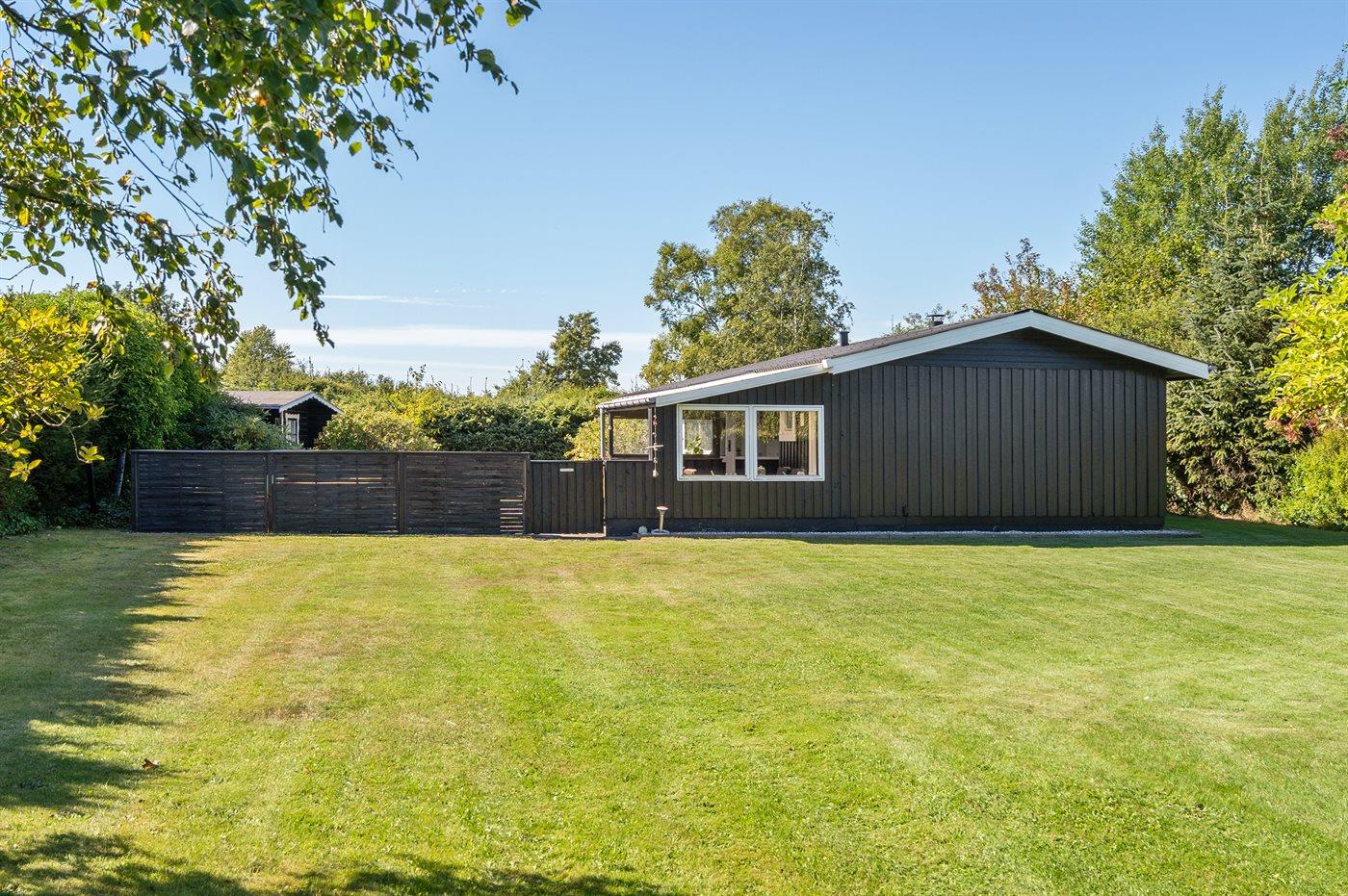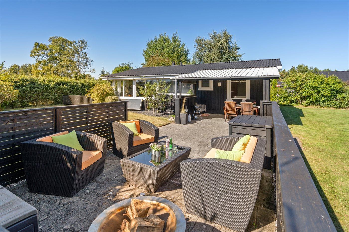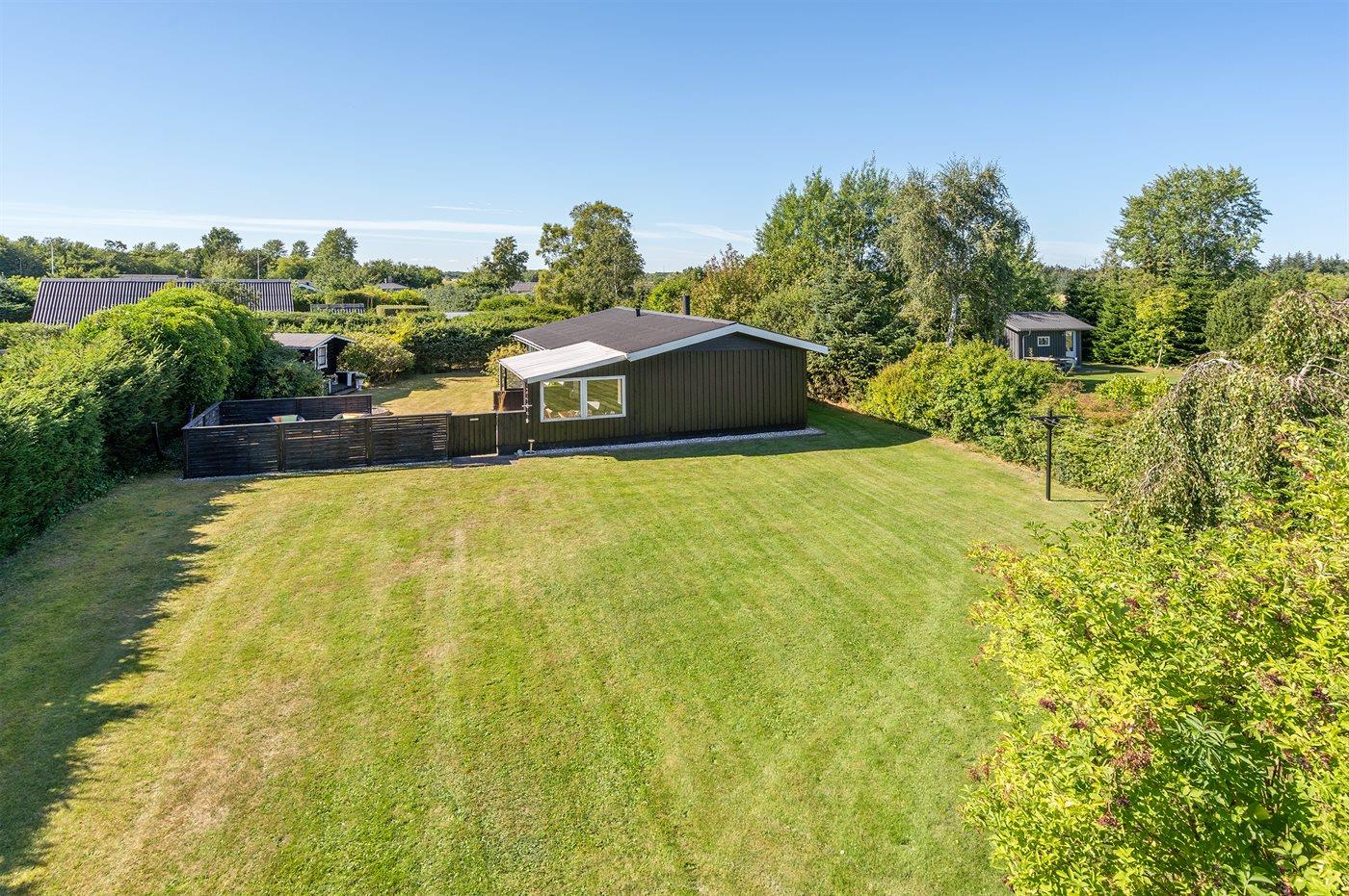 Die Ferienunterkunft liegt auf einem 945 m² großen Naturgrundstück. Das Grundstück ist eingezäunt. Die Entfernung zum Meer beträgt 640 m. Die Entfernung zum Fjord beträgt 12380 m. Die nächste Einkaufsmöglichkeit liegt 1290 m entfernt. In einem Abstand von 15150 m gibt es einen Golfplatz. Es steht ein offenes Terrassenareal zur Verfügung. Außerdem gibt es überdachte Terrasse. Parkplatz auf dem Grundstück.