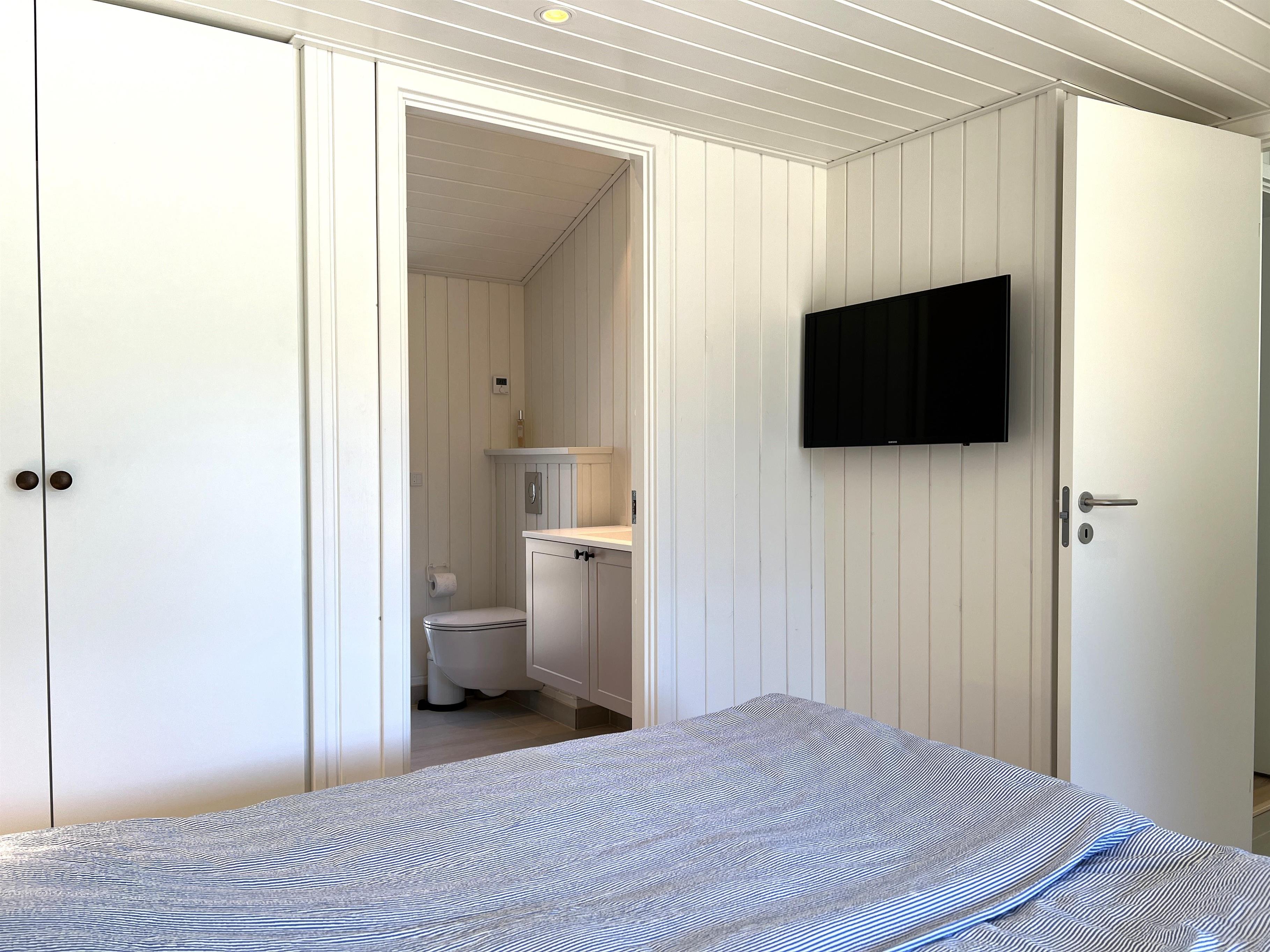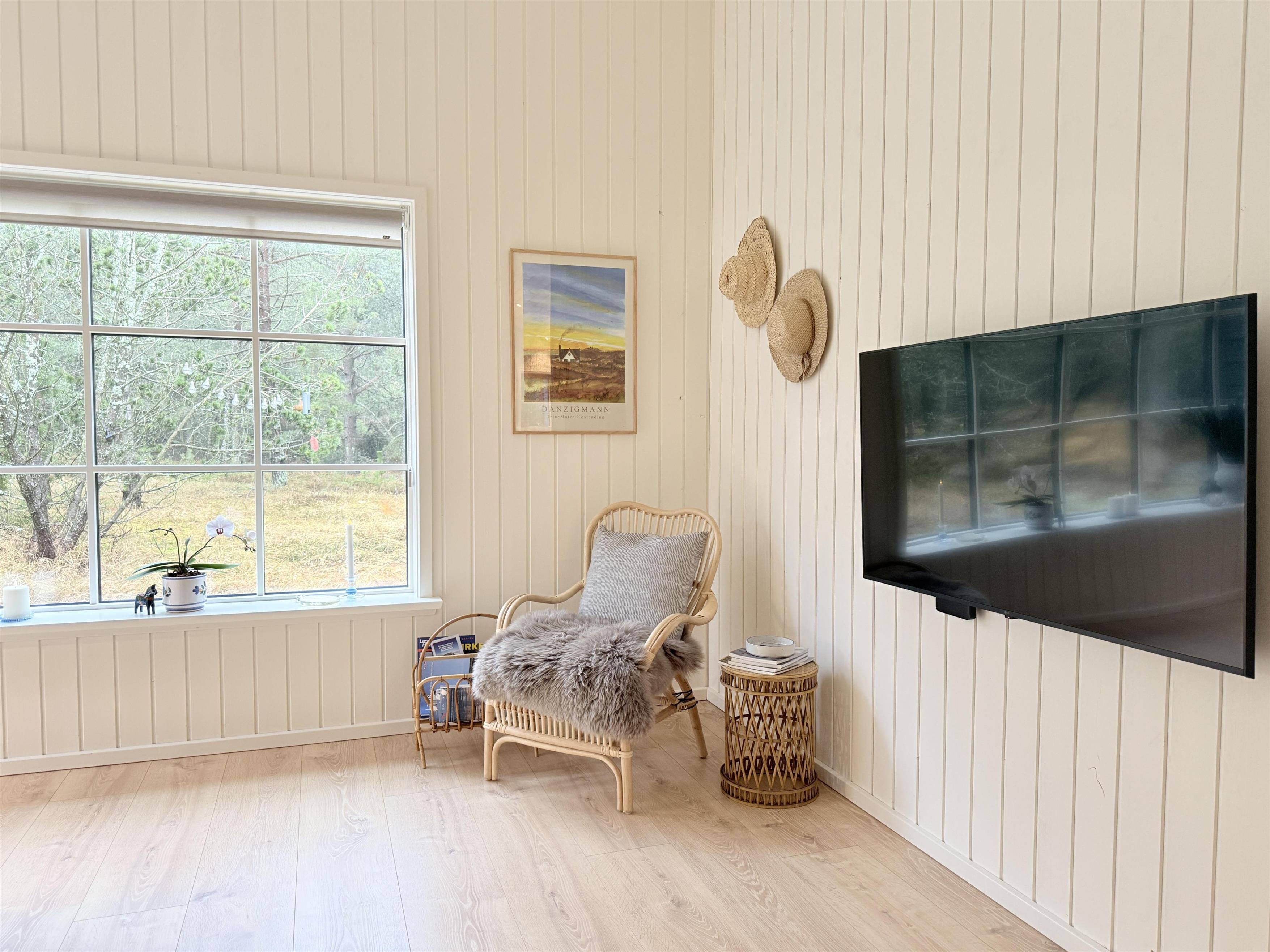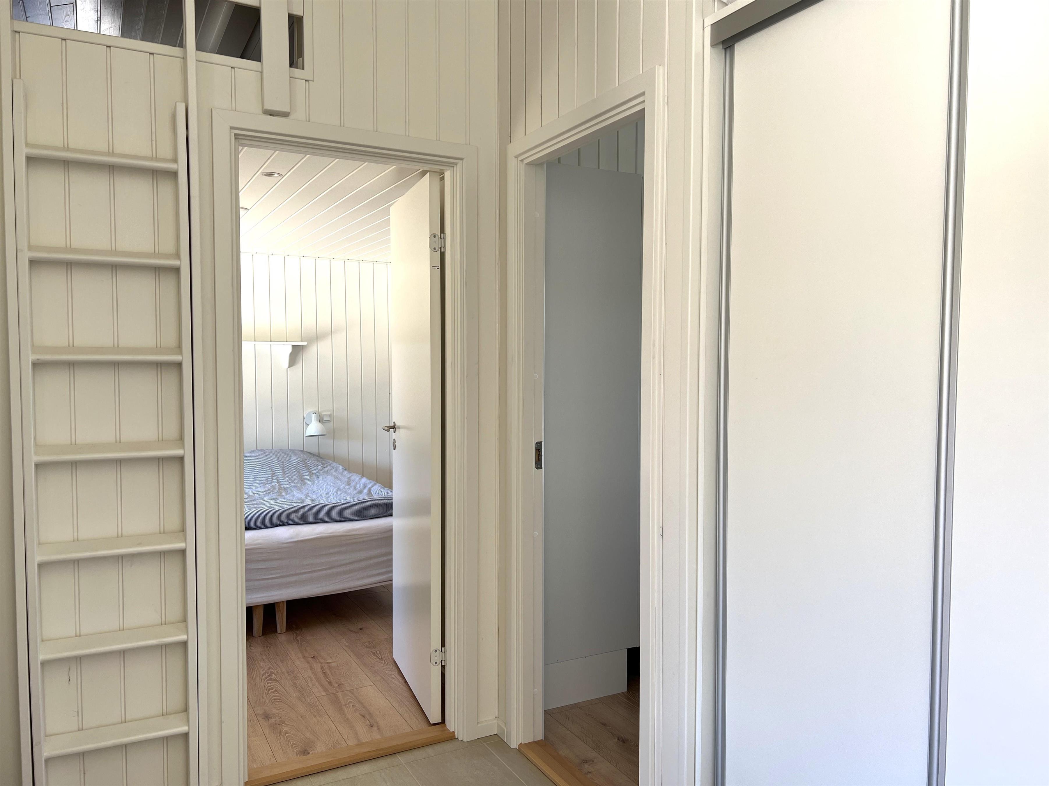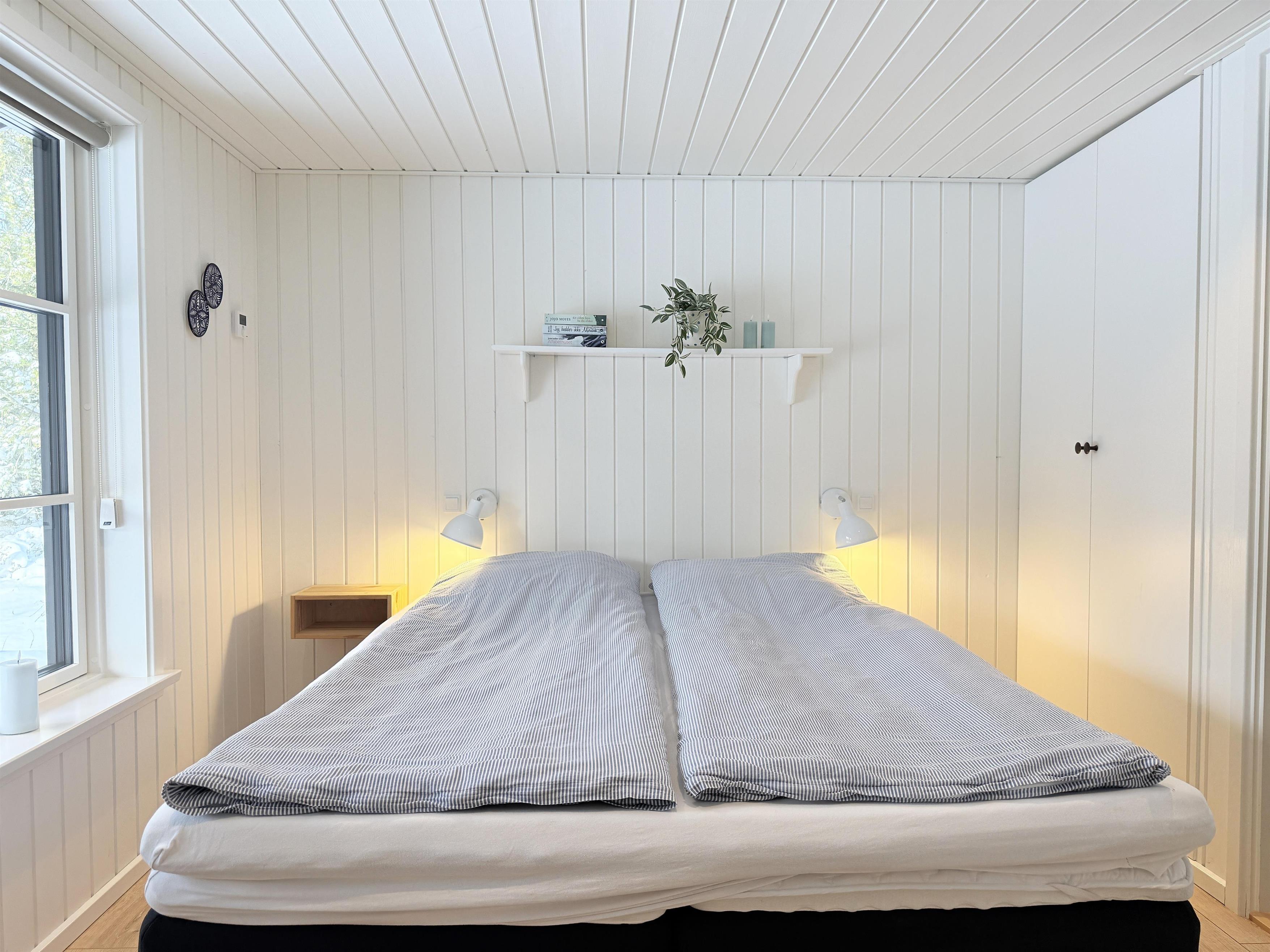 Das Haus verfügt außerdem über vier gute Schlafzimmer mit Kleiderschrank und zwei schöne Badezimmer mit Duschen, die praktischerweise zwischen den Schlafzimmern liegen. Drei Schlafzimmer verfügen über Doppelbetten und ein Zimmer über ein Etagenbett mit 140 cm Breite. Bett unten. Darüber hinaus gibt es einen Dachboden mit zwei Schlafplätzen für die etwas größeren Kinder, der auch gute Verteilungsmöglichkeiten für z.B. Kinder bietet. 2 Familien. Ein Schlafzimmer verfügt wie das Wohnzimmer über einen Smart-TV, und das Fernsehen kann über Chromecast gestreamt werden. Im gesamten Haus gibt es eine Fußbodenheizung, die mit einem Luft/Wasser-System beheizt wird und daher kostengünstig ist.