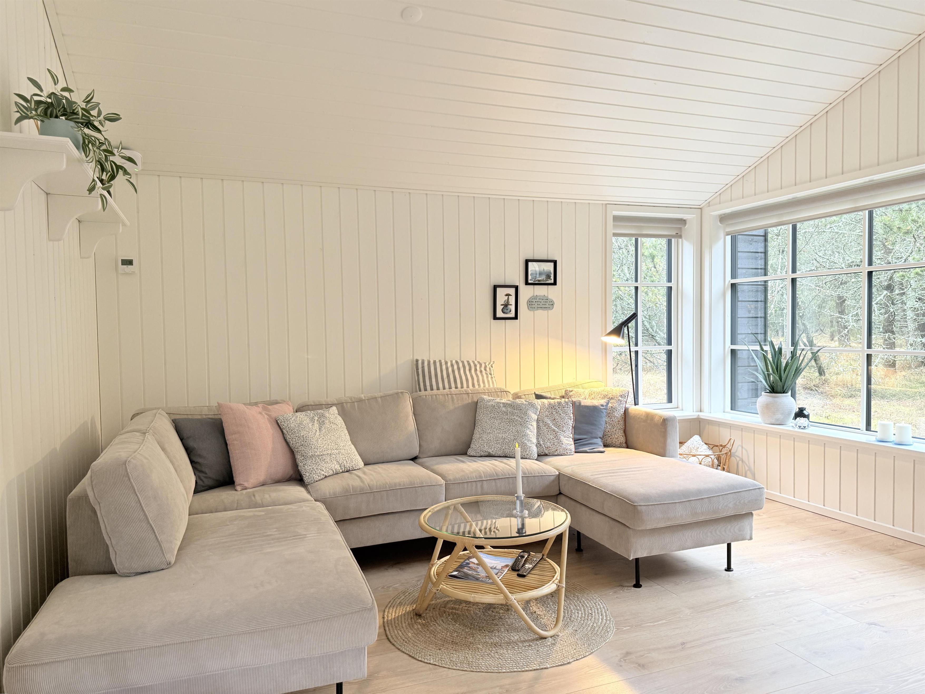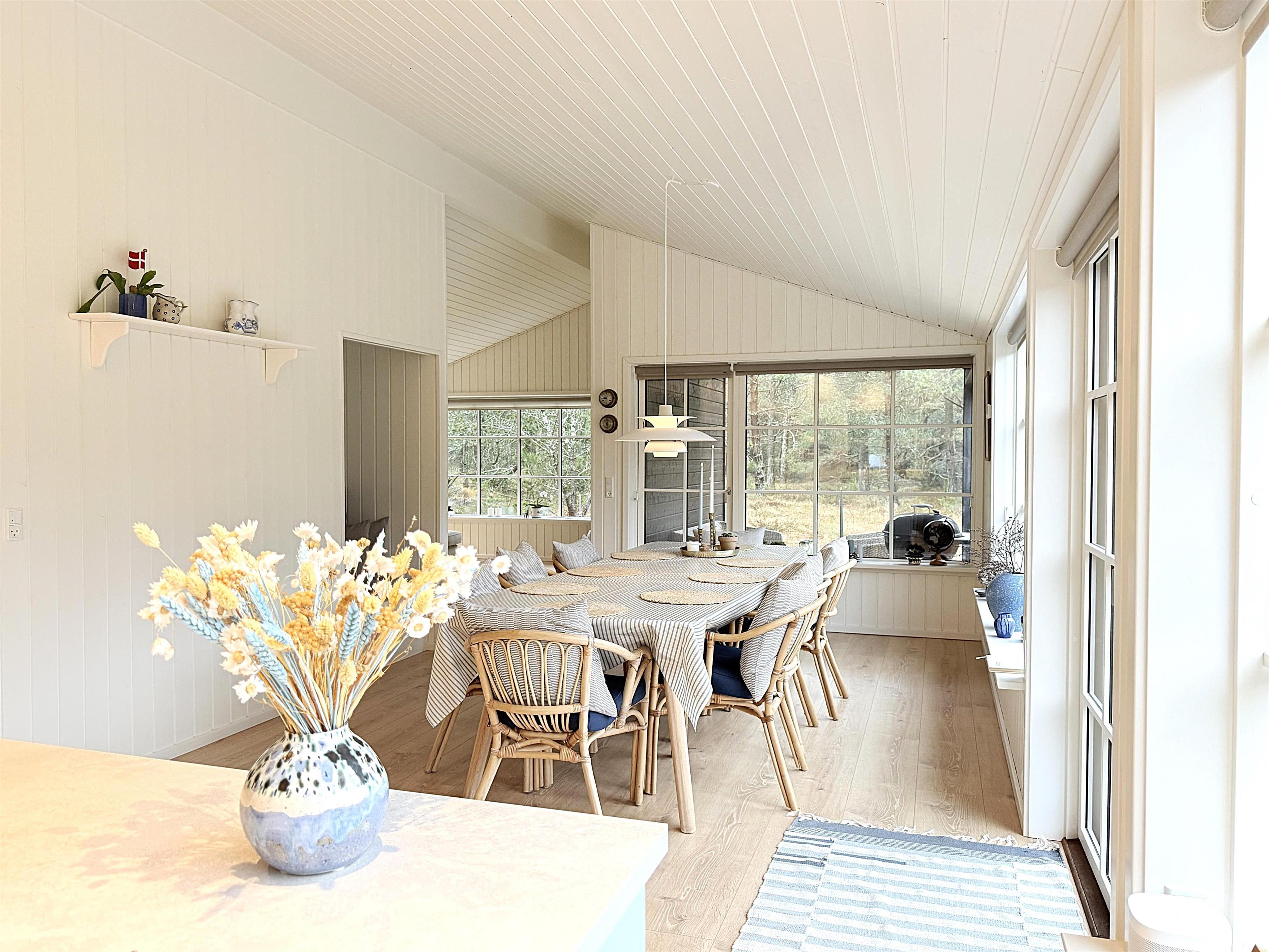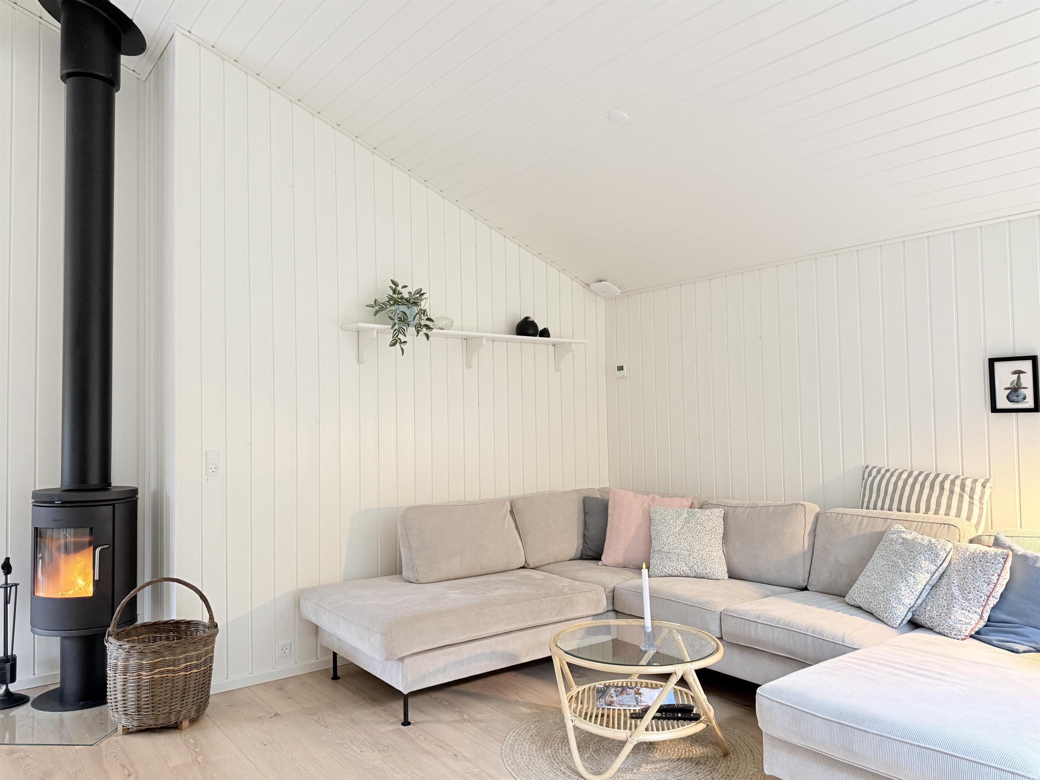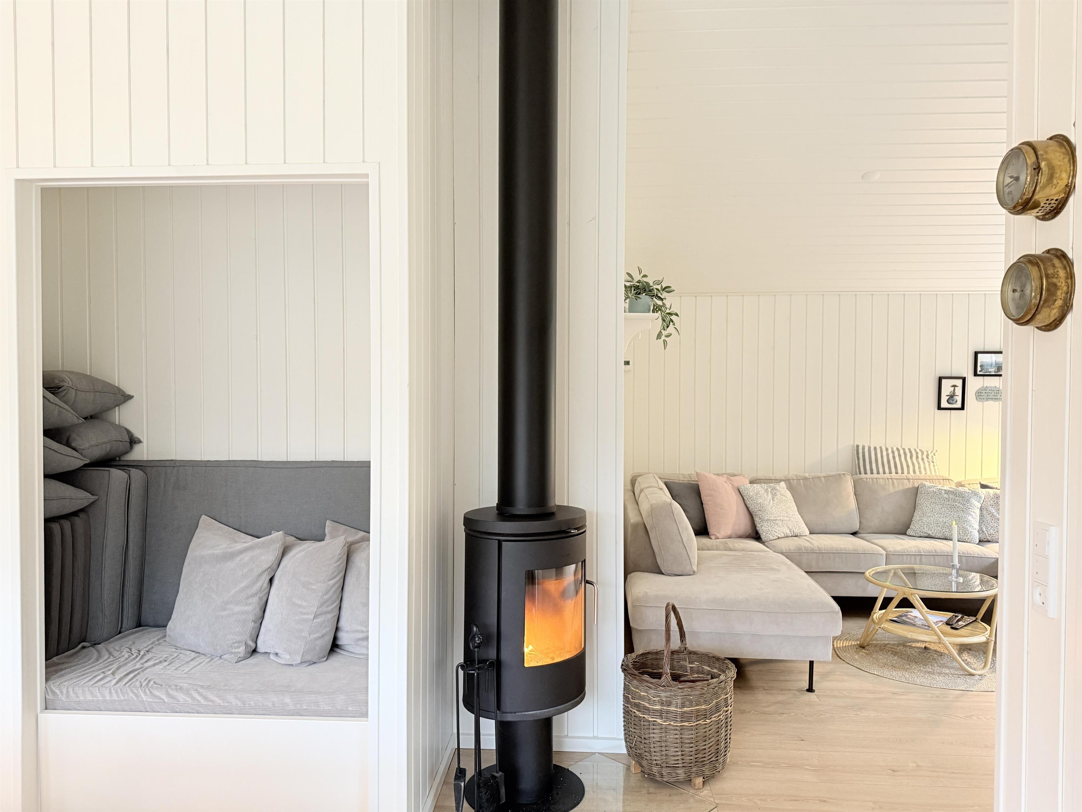 Das Ferienhaus wirkt besonders einladend und verfügt über viele moderne Details. Das Licht durch die schönen großen Fenster ist wunderschön und bringt fast die Natur ins Innere. Alle Räume sind mit modernem variablen Licht/Spotlight ausgestattet und werden mit einem modernen energiefreundlichen Heizsystem mit Luft/Wasser im gesamten Haus beheizt. Sie können auch den Holzofen im Wohnzimmer nutzen. Es wurde ein starkes Glasfasernetz installiert, das in allen Räumen erreichbar ist. Das Haus selbst verfügt über einen Flur mit Haushaltsgeräten, eine große und gut ausgestattete Wohnküche mit einer Kücheninsel und einem großen Esstisch.