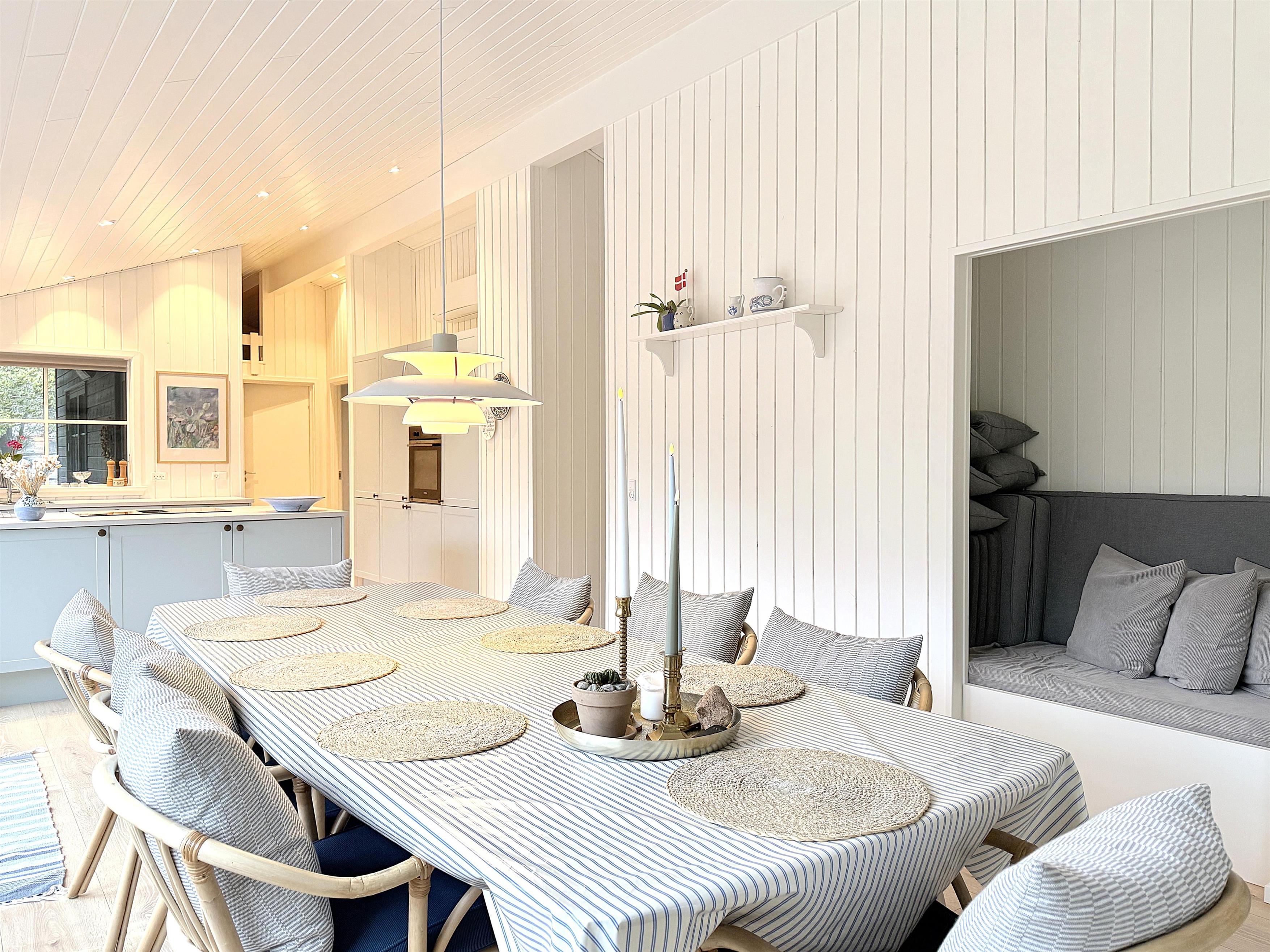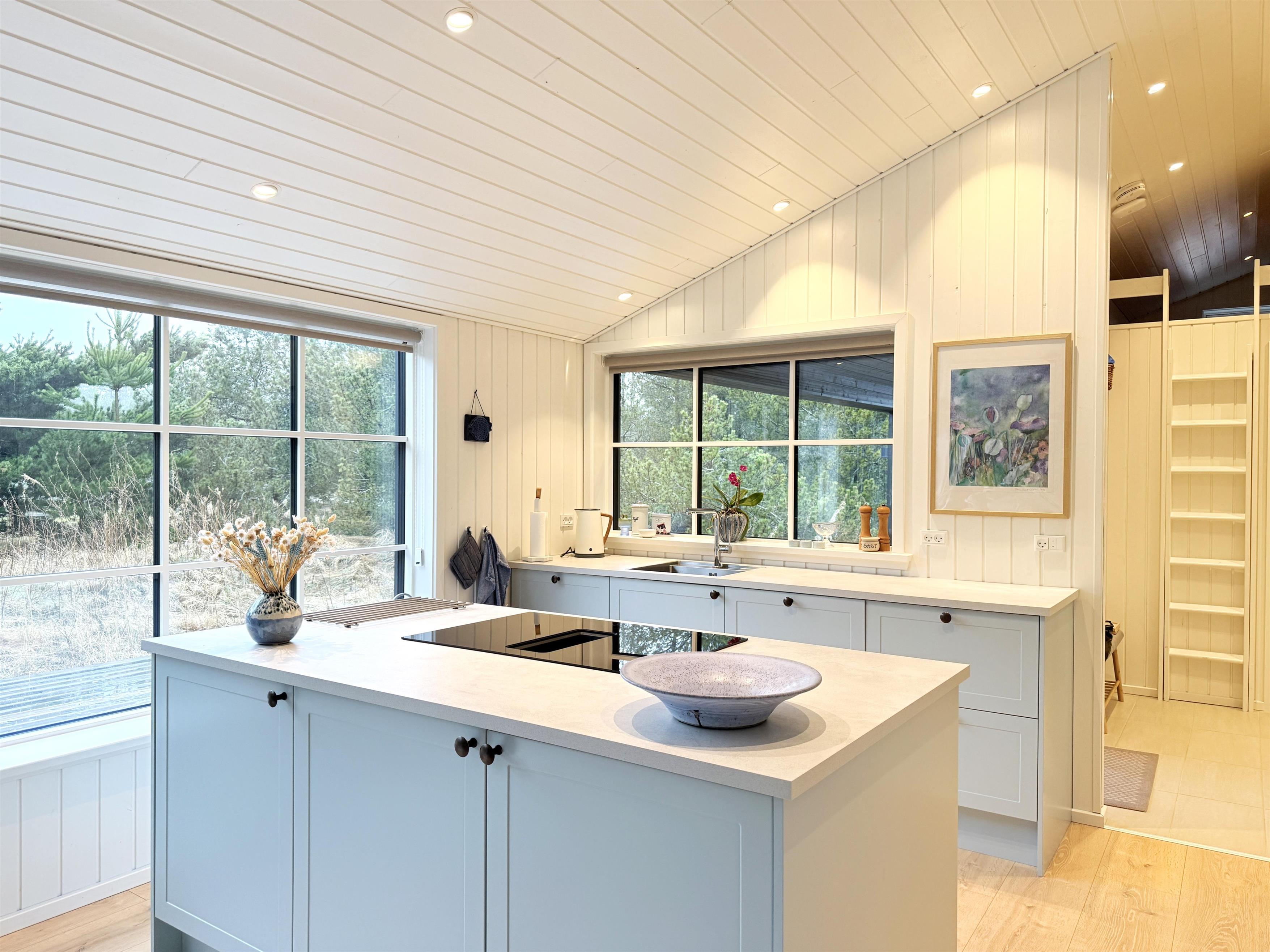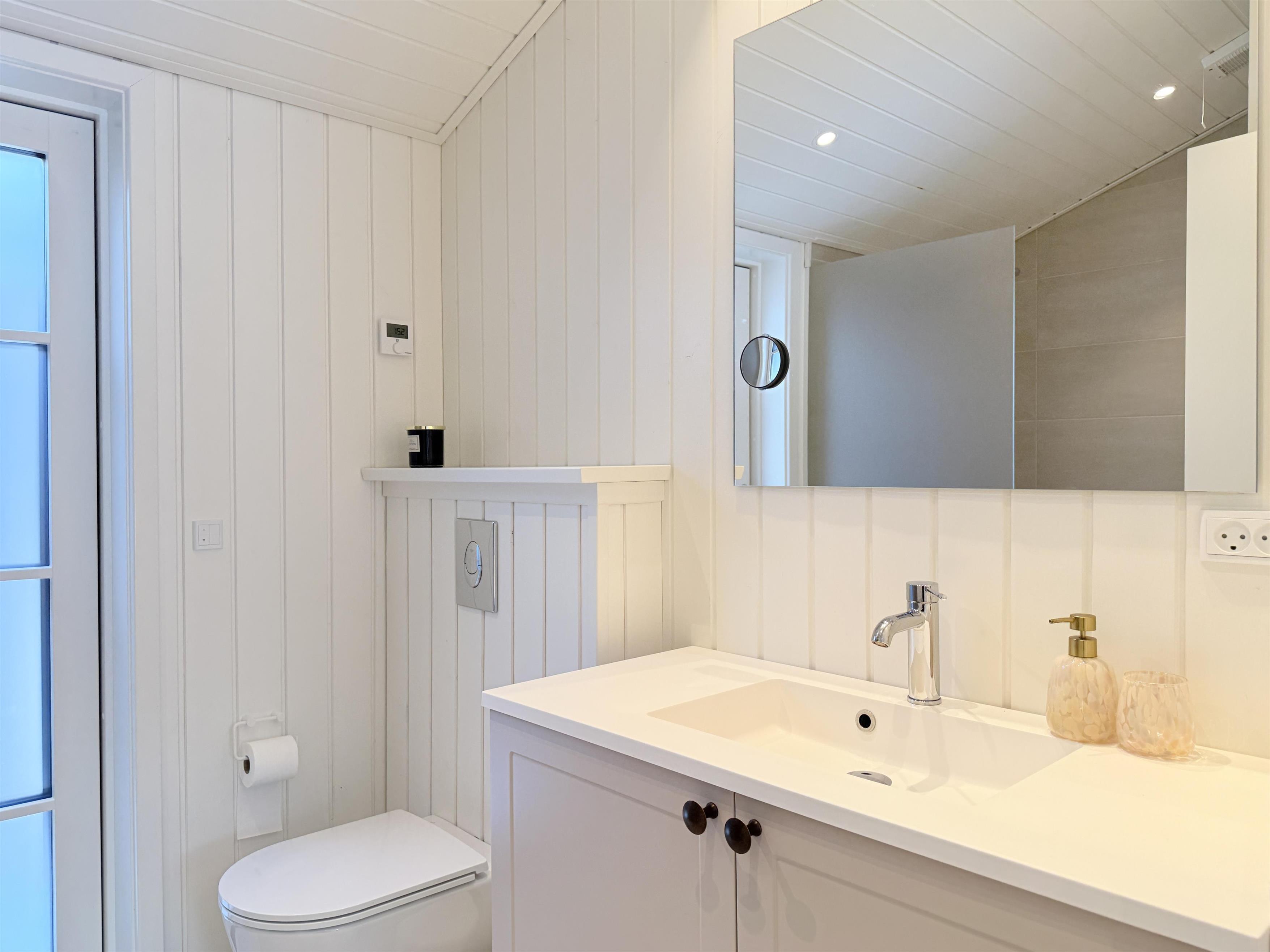 Das Ferienhaus wirkt besonders einladend und verfügt über viele moderne Details. Das Licht durch die schönen großen Fenster ist wunderschön und bringt fast die Natur ins Innere. Alle Räume sind mit modernem variablen Licht/Spotlight ausgestattet und werden mit einem modernen energiefreundlichen Heizsystem mit Luft/Wasser im gesamten Haus beheizt. Sie können auch den Holzofen im Wohnzimmer nutzen. Es wurde ein starkes Glasfasernetz installiert, das in allen Räumen erreichbar ist. Das Haus selbst verfügt über einen Flur mit Haushaltsgeräten, eine große und gut ausgestattete Wohnküche mit einer Kücheninsel und einem großen Esstisch.
