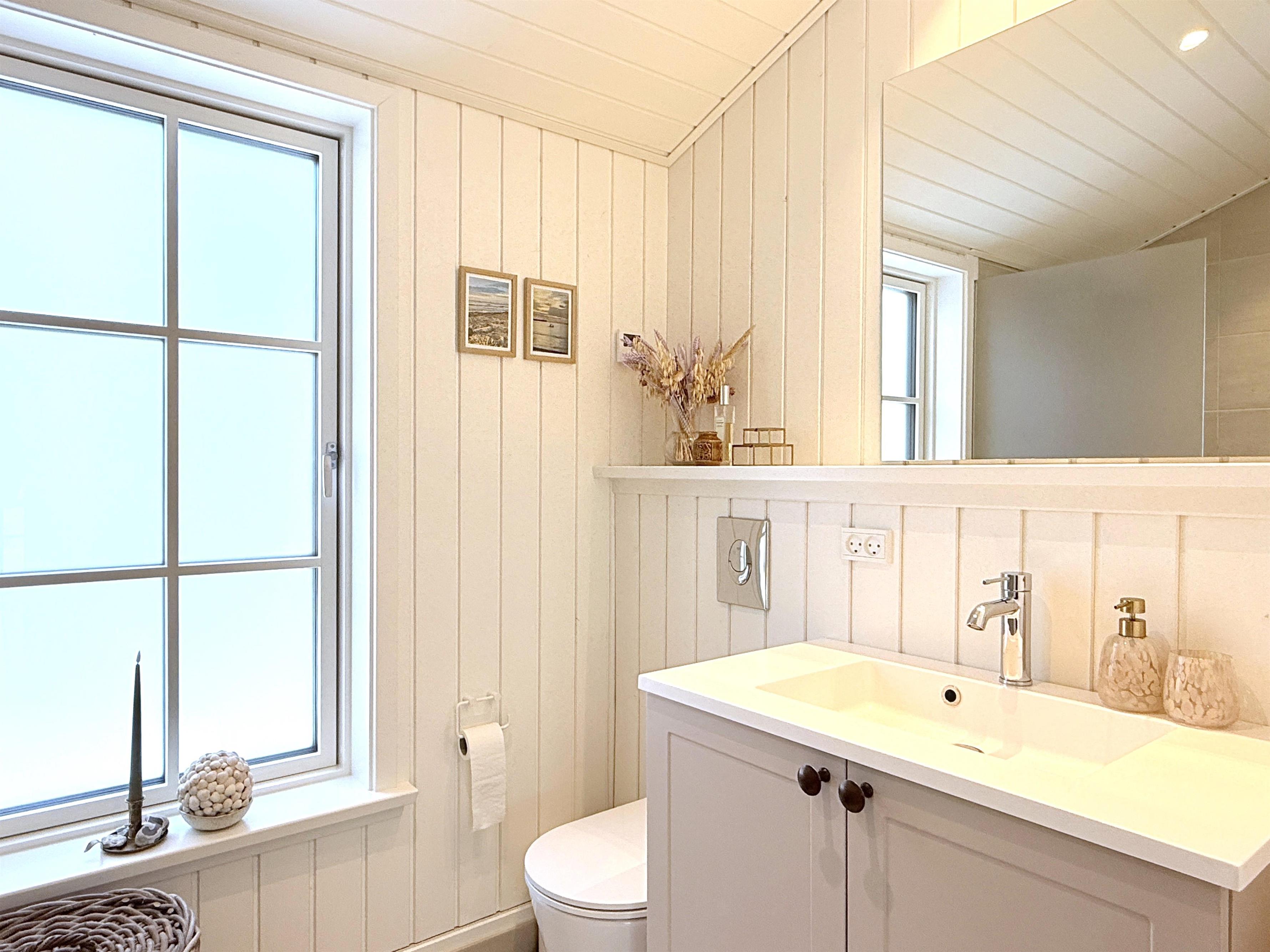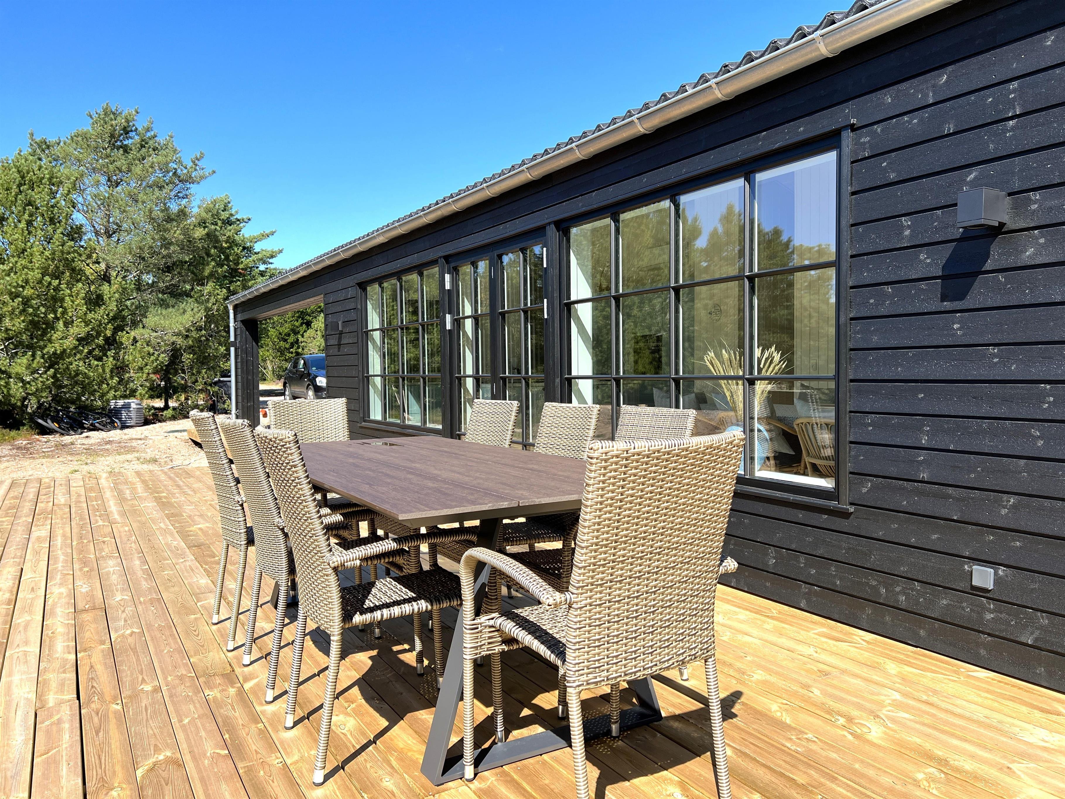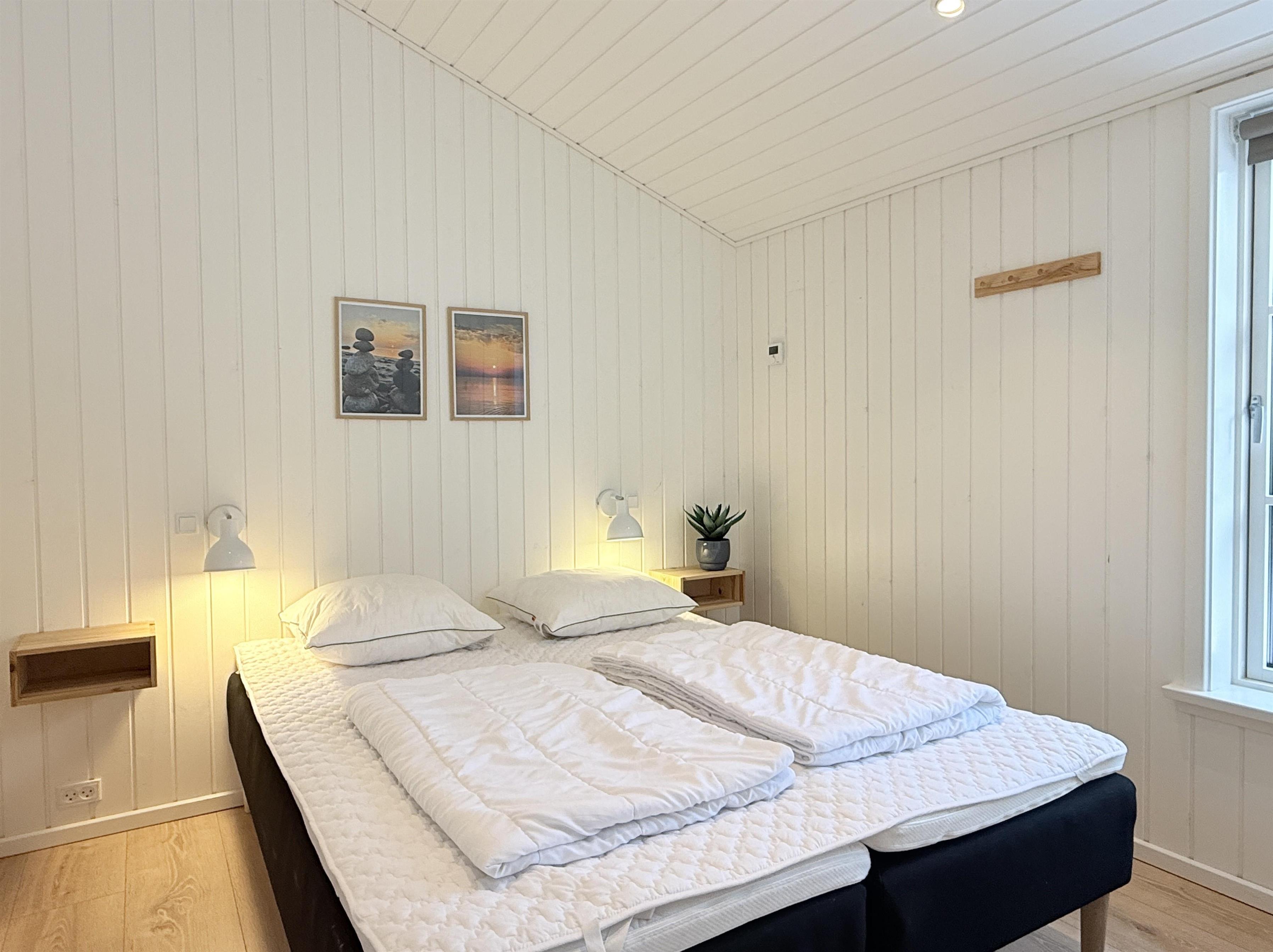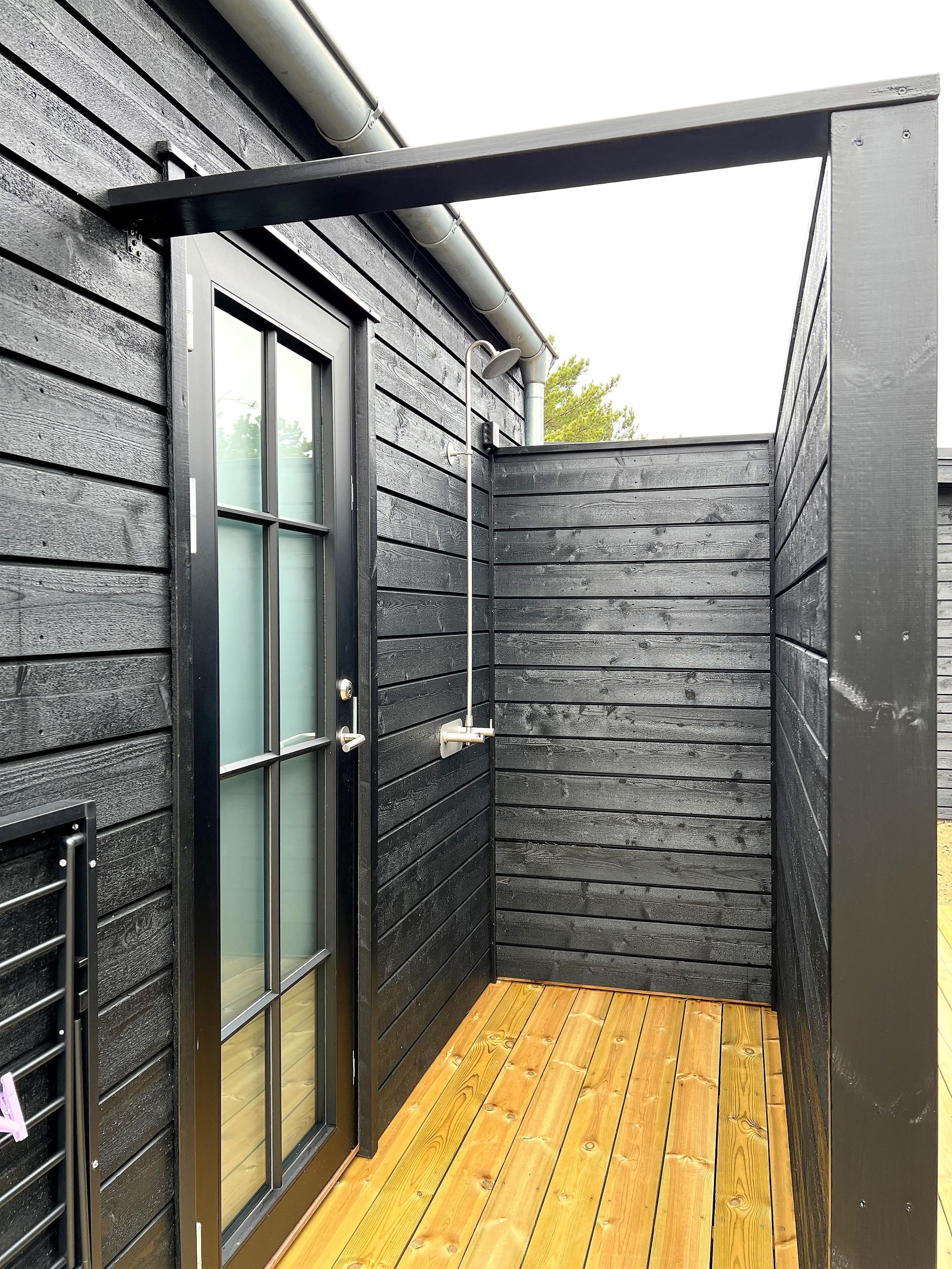Von einem Badezimmer aus hat man Zugang zu einer geschlossenen Holzterrasse mit Außendusche. Rund um die beeindruckende Holzterrasse des Hauses stehen gute Gartenmöbel, Loungemöbel und Sonnenliegen. Auf der Terrasse befindet sich auch der hauseigene Grill und die beiden Terrassenöfen, die sich auf den überdachten Teilen der Terrasse befinden, verlängern die hellen Sommerabende. Auf dem Parkplatz wurde eine Elektroladestation installiert. Ein brandneues, unglaublich schönes und komplettes Ferienhaus, nur wenige Gehminuten von Østerbys gemütlicher Hafenumgebung mit Einkaufsmöglichkeiten, Fischhändlern und Restaurants entfernt.