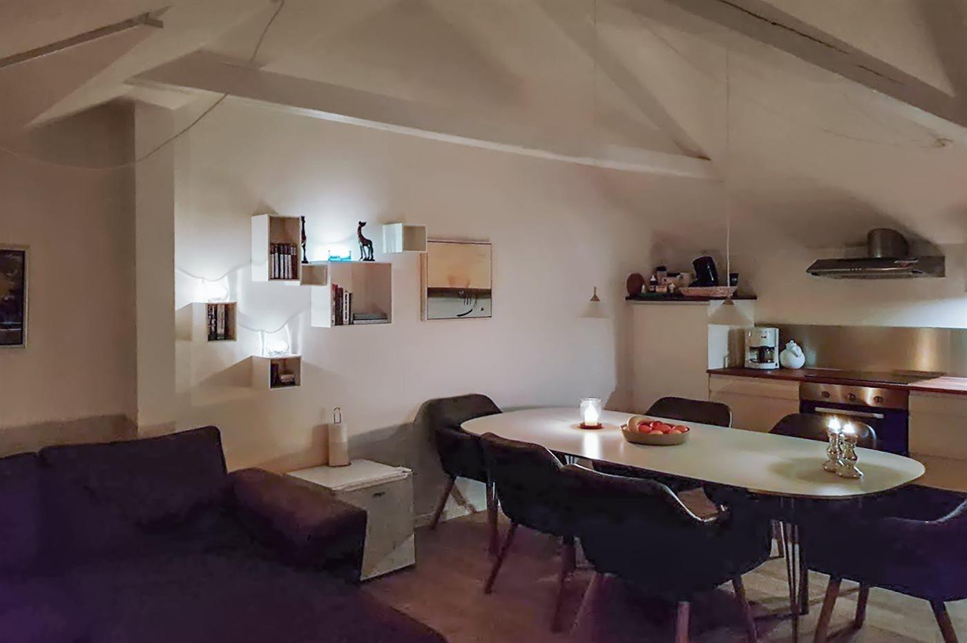 Innen gibt es weißgestrichene Wände und Decken sowie helle Holzböden. Die Küche ist mit dem Wohnzimmer kombiniert und u. a. mit Geschirrspüler, kleinem Tiefkühlgerät, Umluftofen und Herd mit Ceran-Feld ausgestattet. Im Wohnzimmer, mit Ausgang zum Balkon, finden Sie Stereoanlage mit CD-Spieler, TV und Gemeinschaftsantenne.